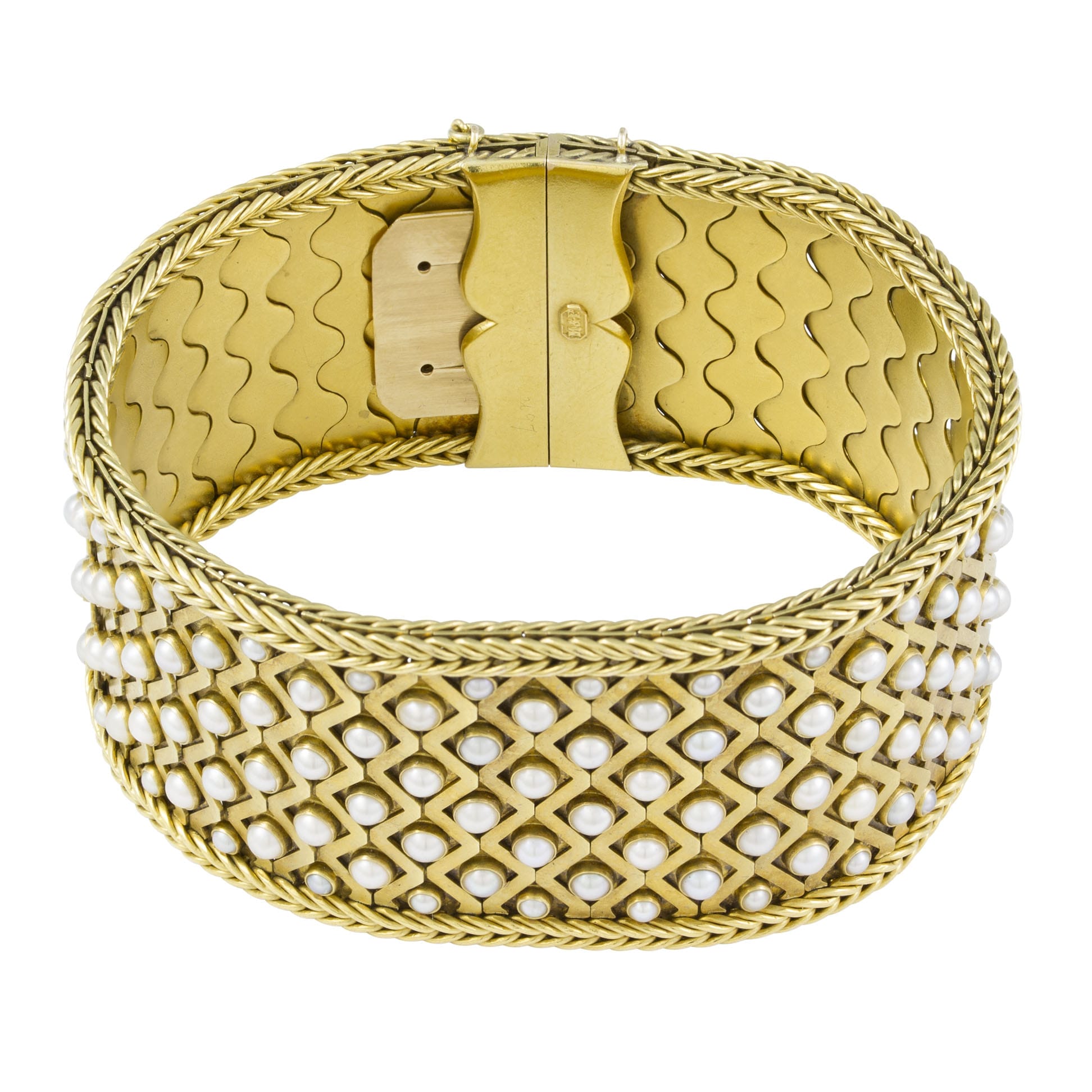 A handsome and striking mid-nineteenth century gold bracelet set with pearls. The combination of pearls and yellow gold is striking and emblematic of the High Victorian jewellery style, when ornate styles became popular. This piece features a seamless clasp, creating the effect of a luxurious cuff. This beautiful piece would be a stunning addition to a simple evening gown.