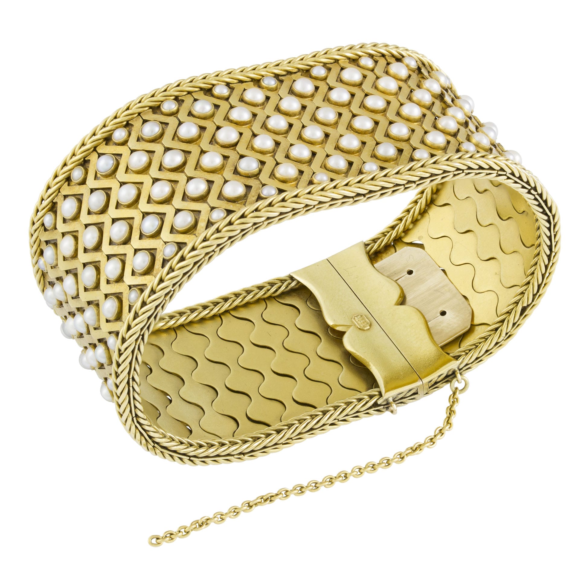 A Victorian gold and pearl bracelet, measuring 30mm in width and 180 mm in length with braided chain along the extent of the bracelet encasing within, forty eight rows of four white pearls on a flexible band, with a trombone clasp and safety chain, stamped M&P, circa 1870, gross weight 69.5 grams with an original fitted red leather case; compare with a similar bracelet illustrated in ‘Jewellery. The International Era 1789-1910’, by Shirley Bury, Volume II, colour plate 146, page 565.
