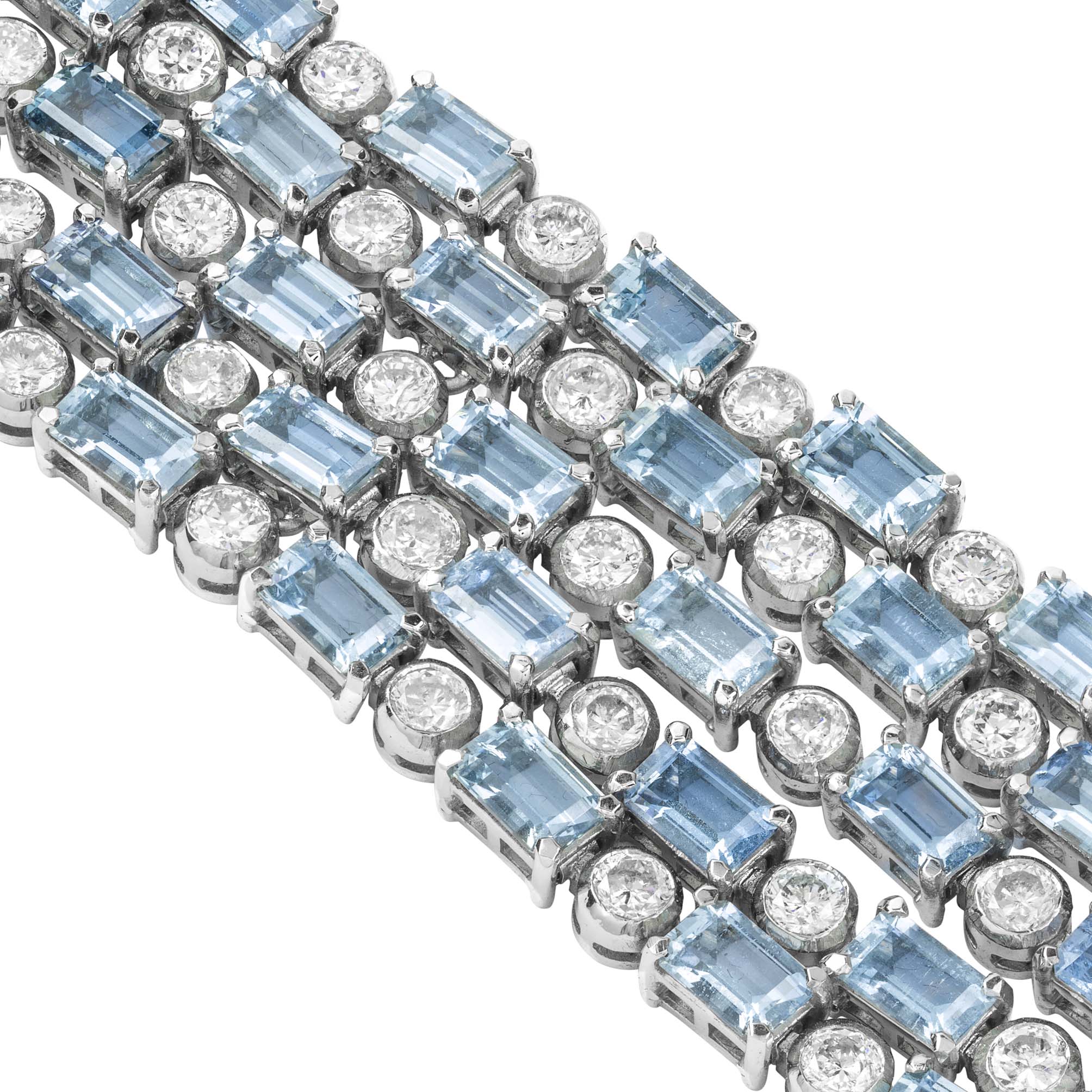 An aquamarine and diamond bracelet made by Bentley & Skinner, consisting of five rows alternate-set with baguette-cut aquamarine and round brilliant-cut diamonds, the aquamarines weighing 35.5 carats and the diamonds 11 carats in total, each claw and rubover-set in white ...