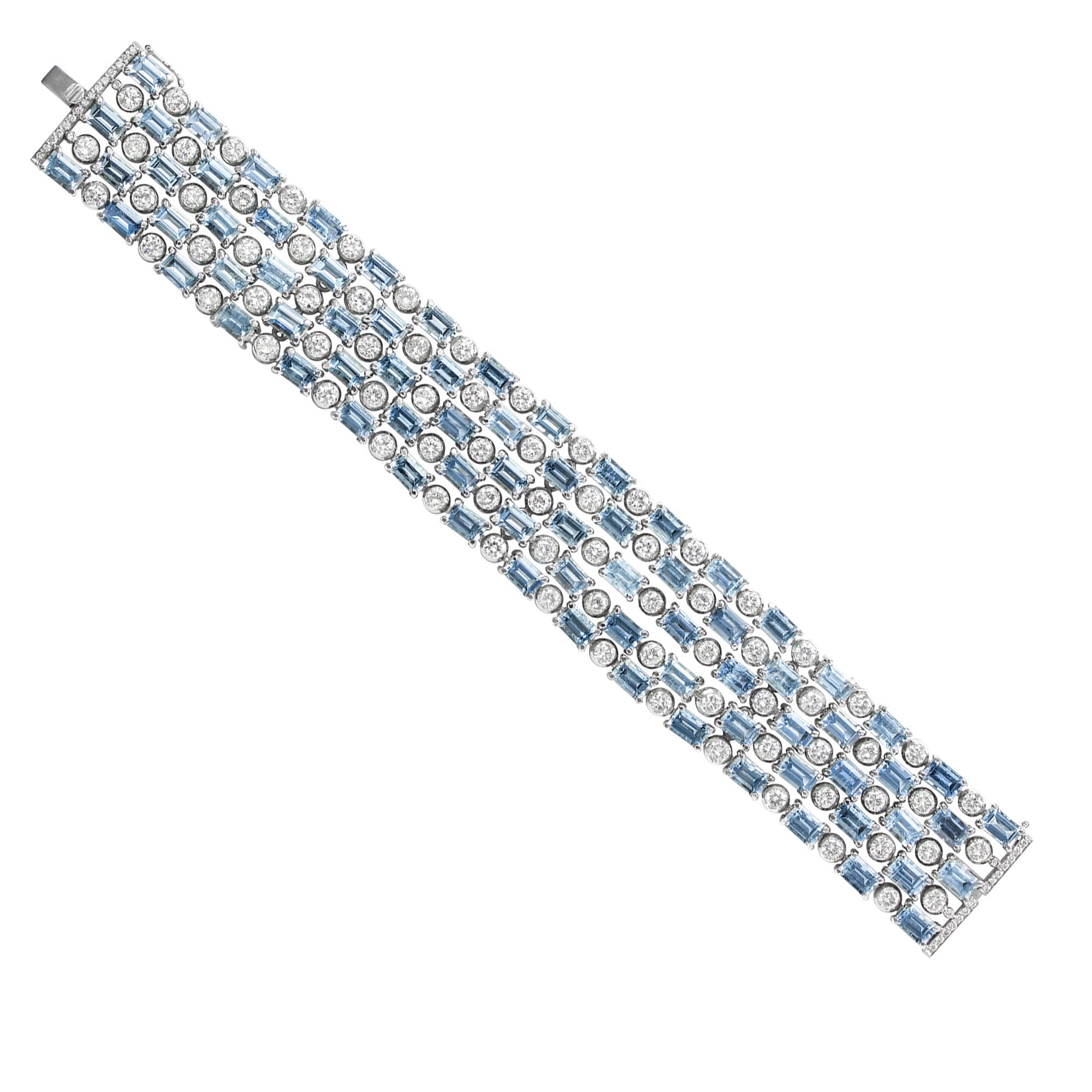 An aquamarine and diamond bracelet made by Bentley & Skinner, consisting of five rows alternate-set with baguette-cut aquamarine and round brilliant-cut diamonds, the aquamarines weighing 35.5 carats and the diamonds 11 carats in total, each claw and rubover-set in white gold mount with a diamond-set push clasp and a figure-of-eight safety catch, hallmarked 18ct gold, London, made by Bentley & Skinner, measuring 18.2 x 2.4cm, gross weight 78.2 grams.
