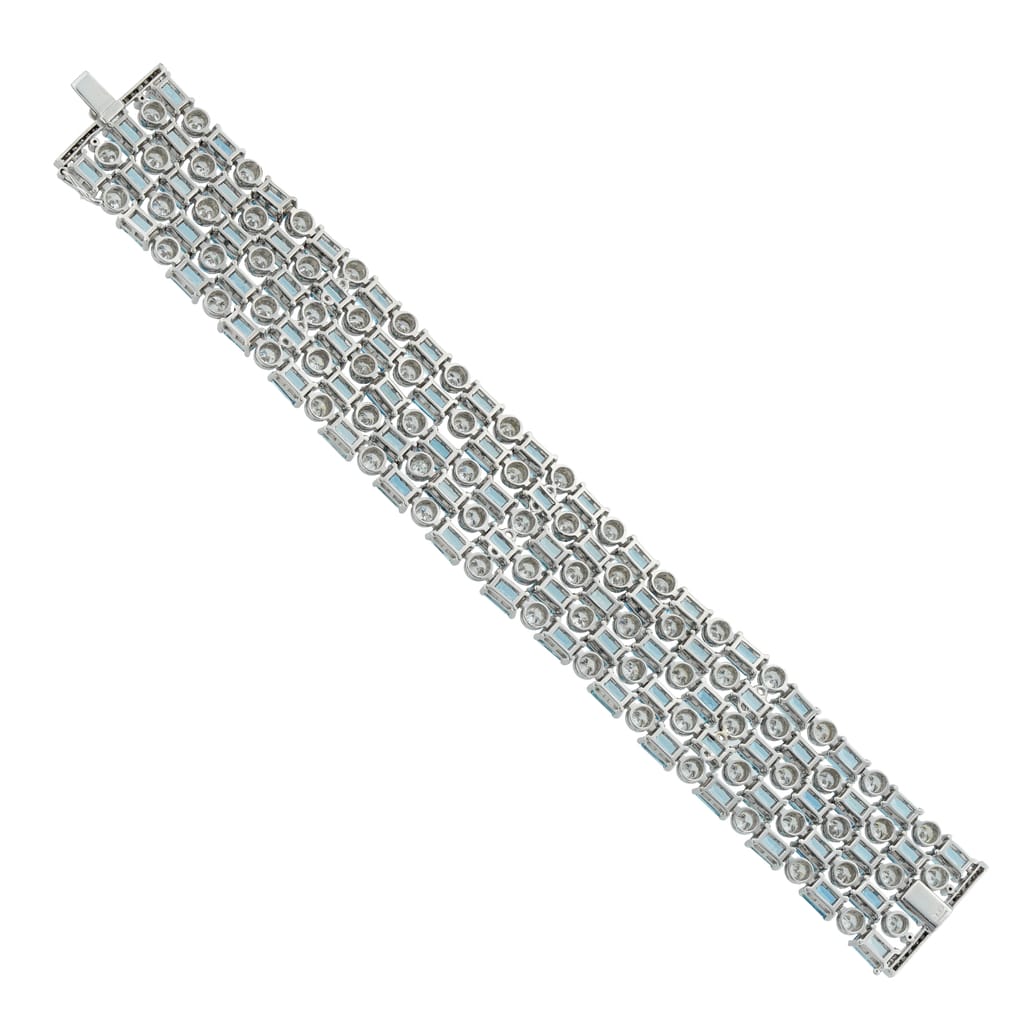 Diamond and aquamarine are a classic and elegant combination: the pale blue of the aquamarine is complimented beautifully with the sparkle of the diamonds. This bracelet features five rows of alternate set bright stones and is a perfect statement piece to be worn with an evening gown.