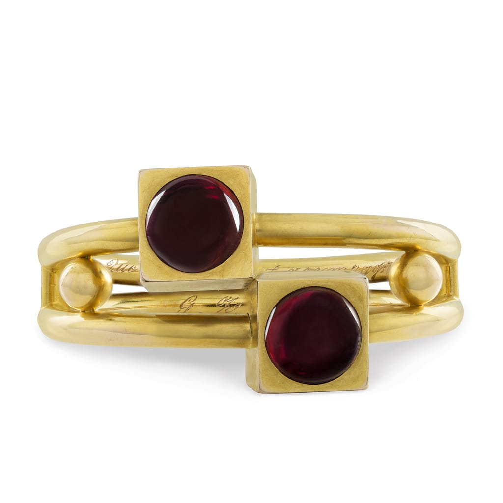 A bold and geometric bracelet. It was made in the late nineteenth century and features an intriguing and sophisticated design. A split yellow gold bangle holds two golden cubes, into which each is set with a glowing cabochon-cut garnet. The geometric shapes give this bracelet a surprisingly modern appearance, while the combination of garnet and yellow gold is wonderfully Victorian. A splendid piece. ENGRAVED INSIDE.
