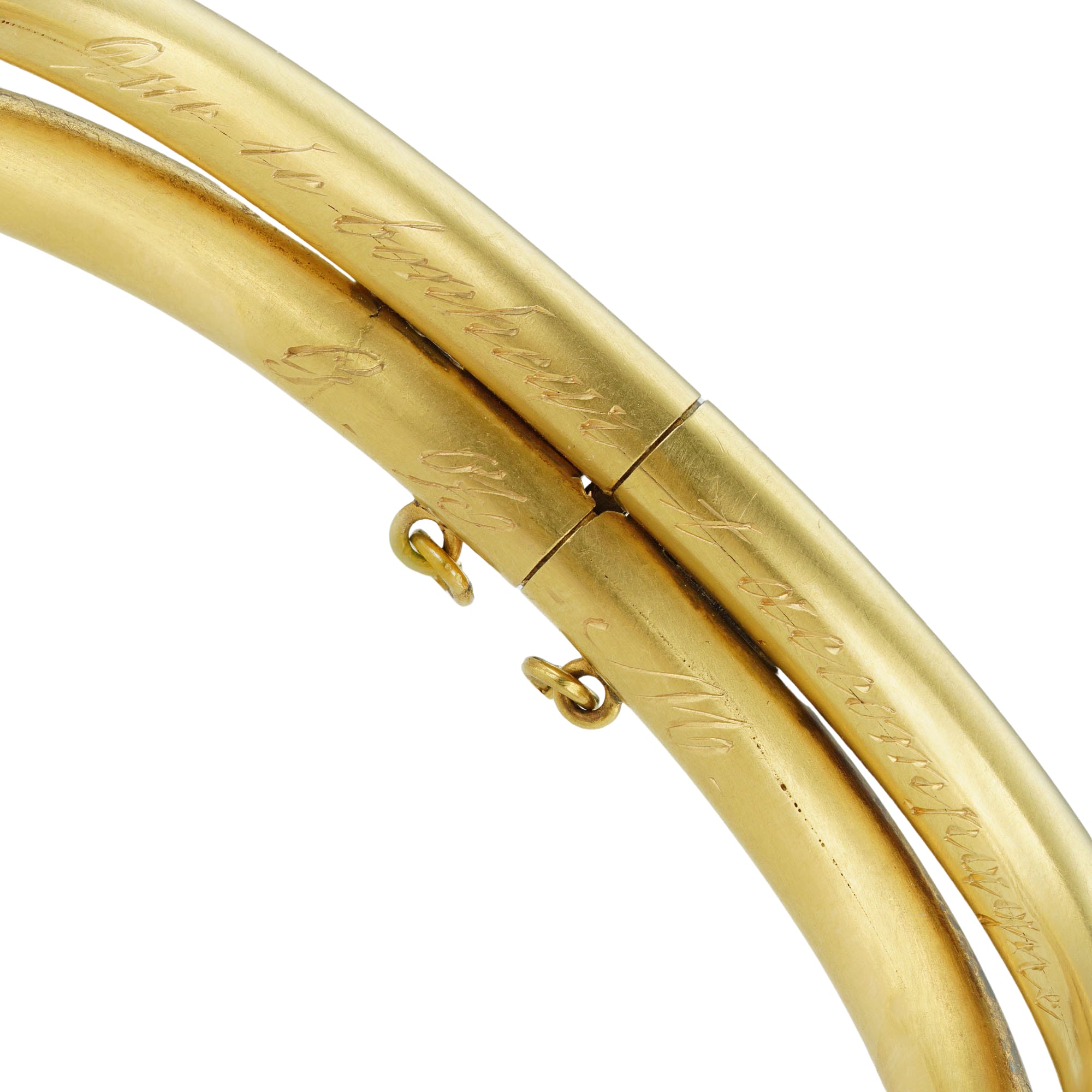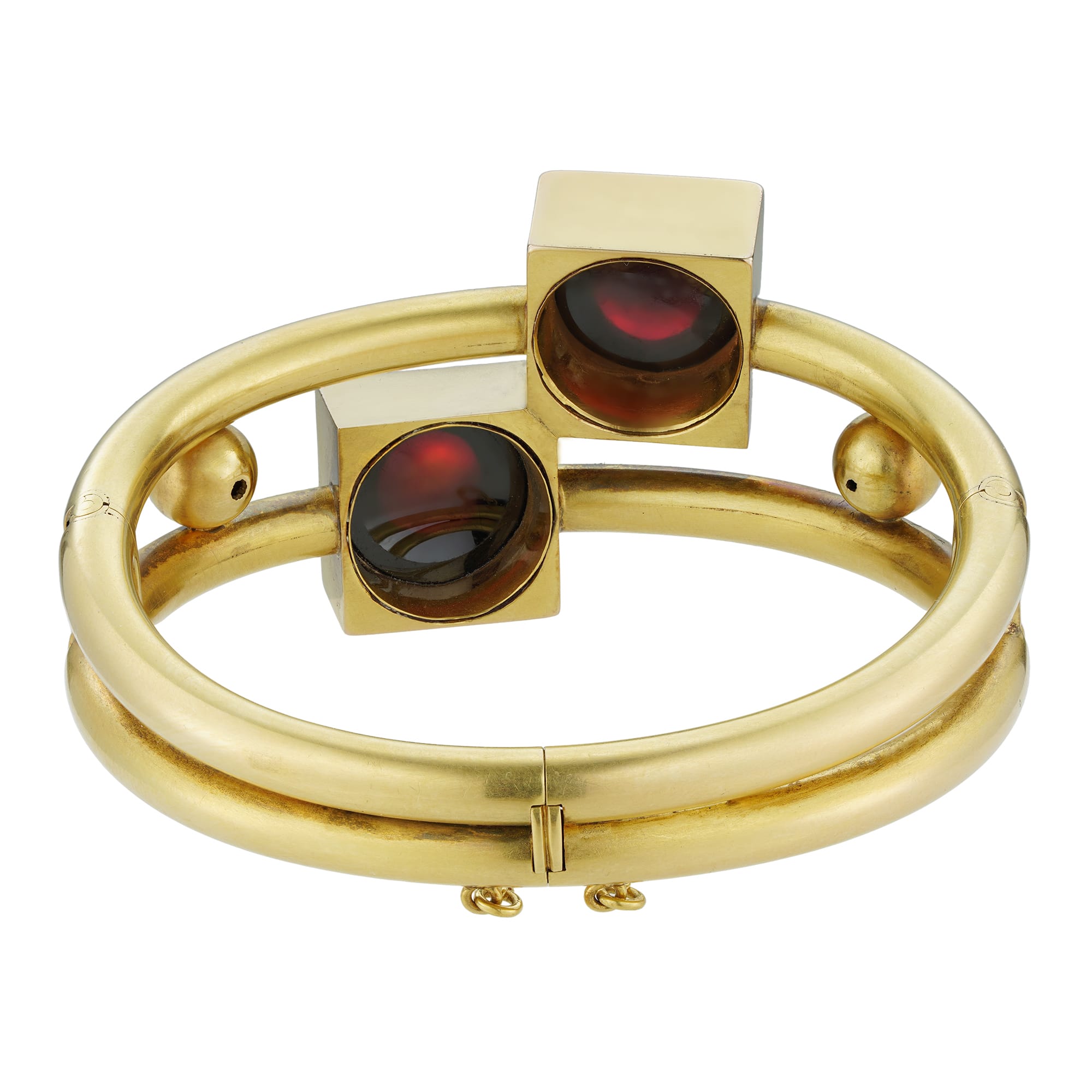 A late nineteenth-century gold and garnet bangle, the geometrical designed bangle centrally with the two gold cubes each set with a round carbuncle garnet, to a split yellow gold hinged bangle with concealed hinged clasp and safety chain, all in yellow gold with matt finish, circa 1870, internal diameter measuring approximately 5.8 x 5.1cm, gross weight 52 grams.