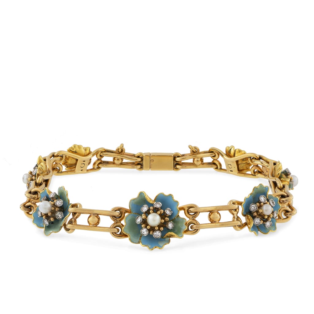 A mid-century blue enamel flower-set bracelet, the seven blue enamel flowers, graduating in size from the centre, each centrally set with pearl surrounded by seven Swiss-cut diamonds, attached to 18ct gold double bar links with gold clasp and safety chain, ...