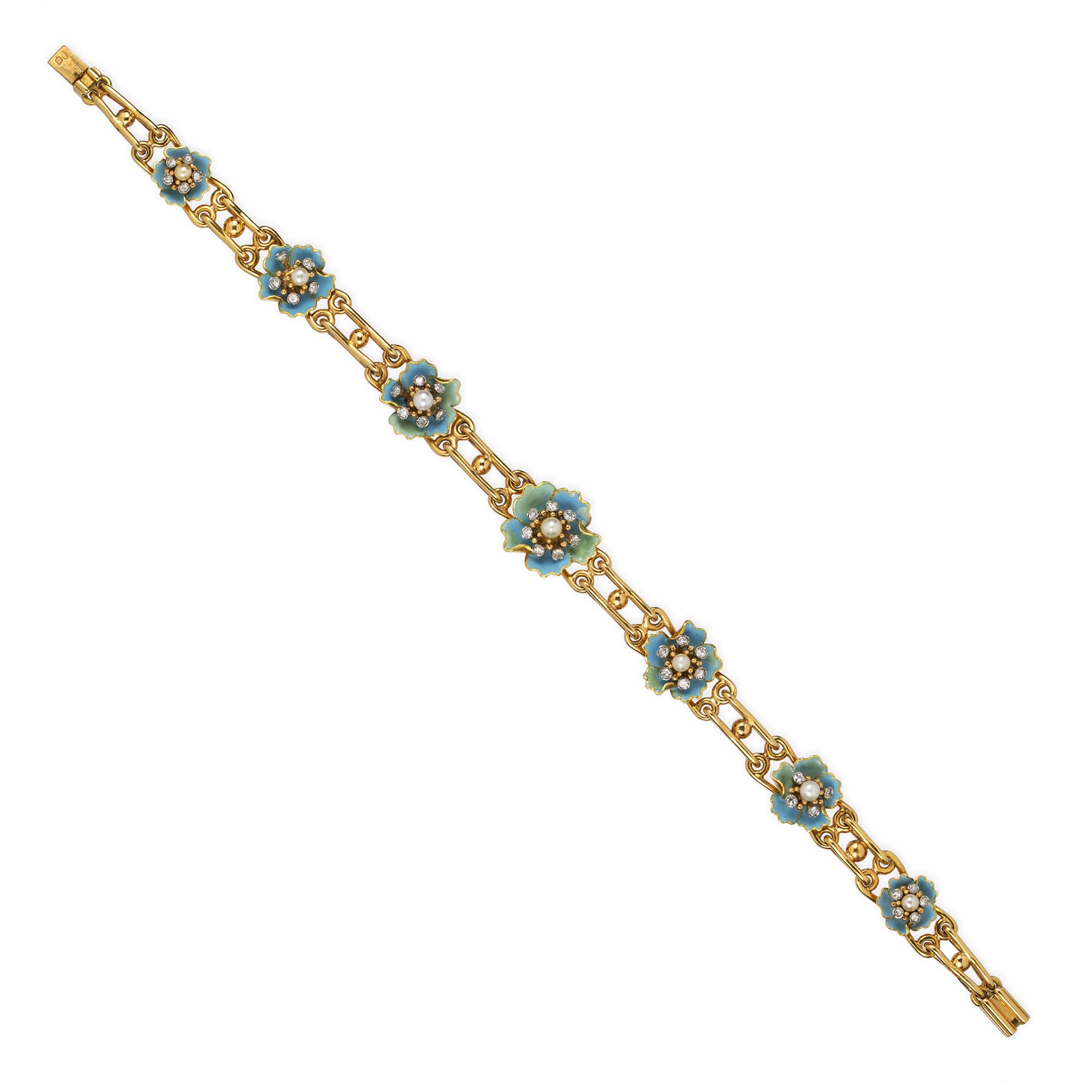 A mid-century blue enamel flower-set bracelet, the seven blue enamel flowers, graduating in size from the centre, each centrally set with pearl surrounded by seven Swiss-cut diamonds, attached to 18ct gold double bar links with gold clasp and safety chain, bearing Portuguese gold marks for Gonomar, circa 1950, measuring approximately 20.7 x 1.4cm, gross weight 26.8 grams.