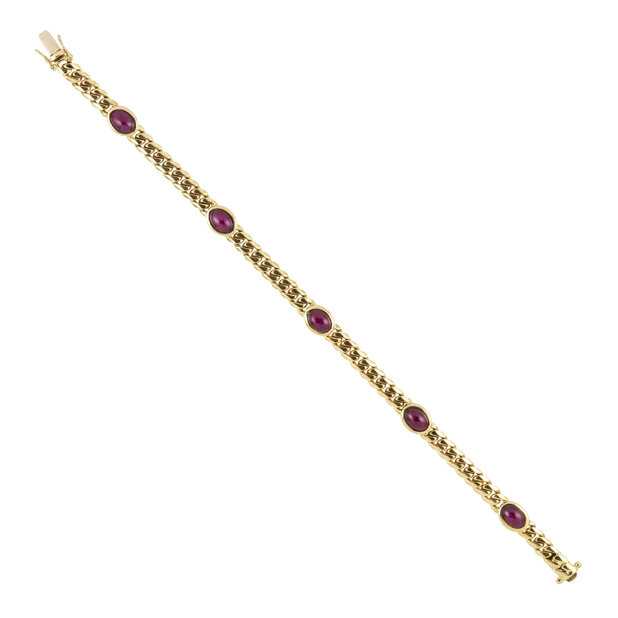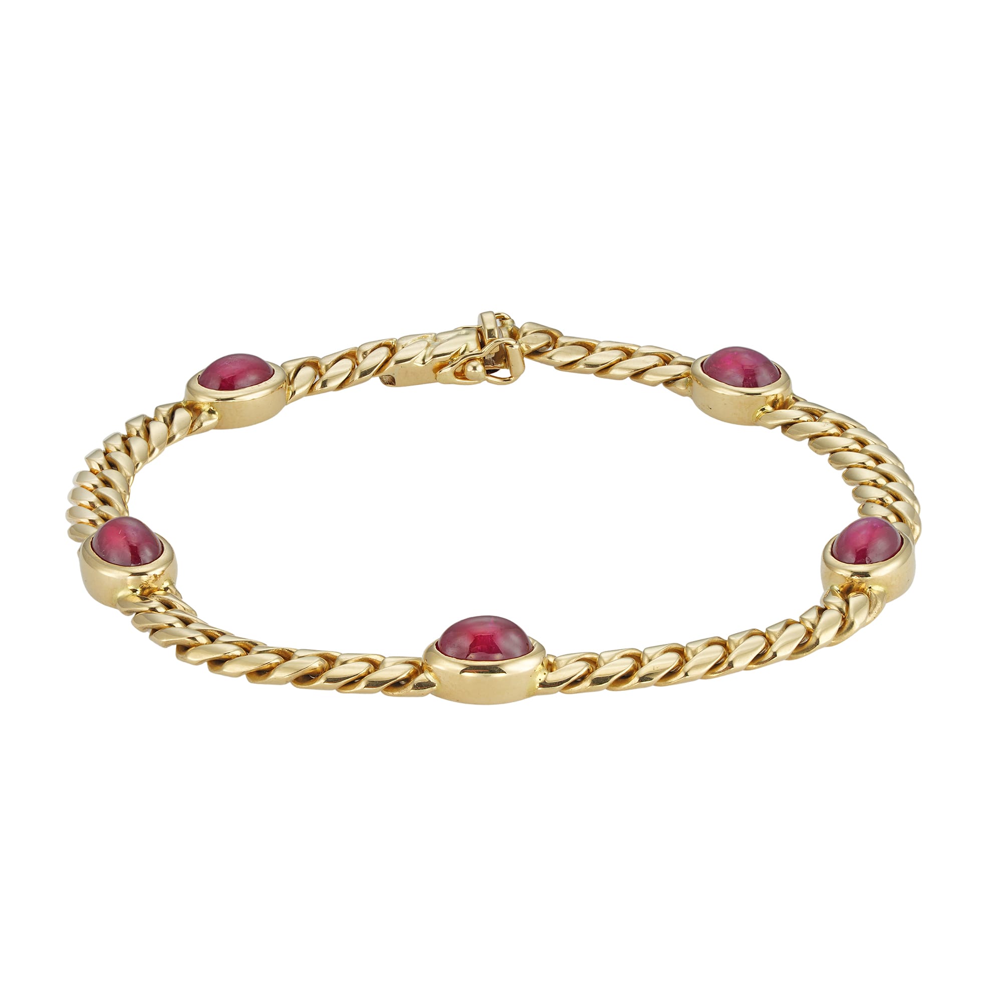 A vintage ruby and gold bracelet, the five cabochon-cut rubies each measuring approximately 7 x 3.5mm and rub-over-set to a gold collet, all collets connected with curb-link chain to a box clasp and two safety catches, Italian circa 1980, later ...