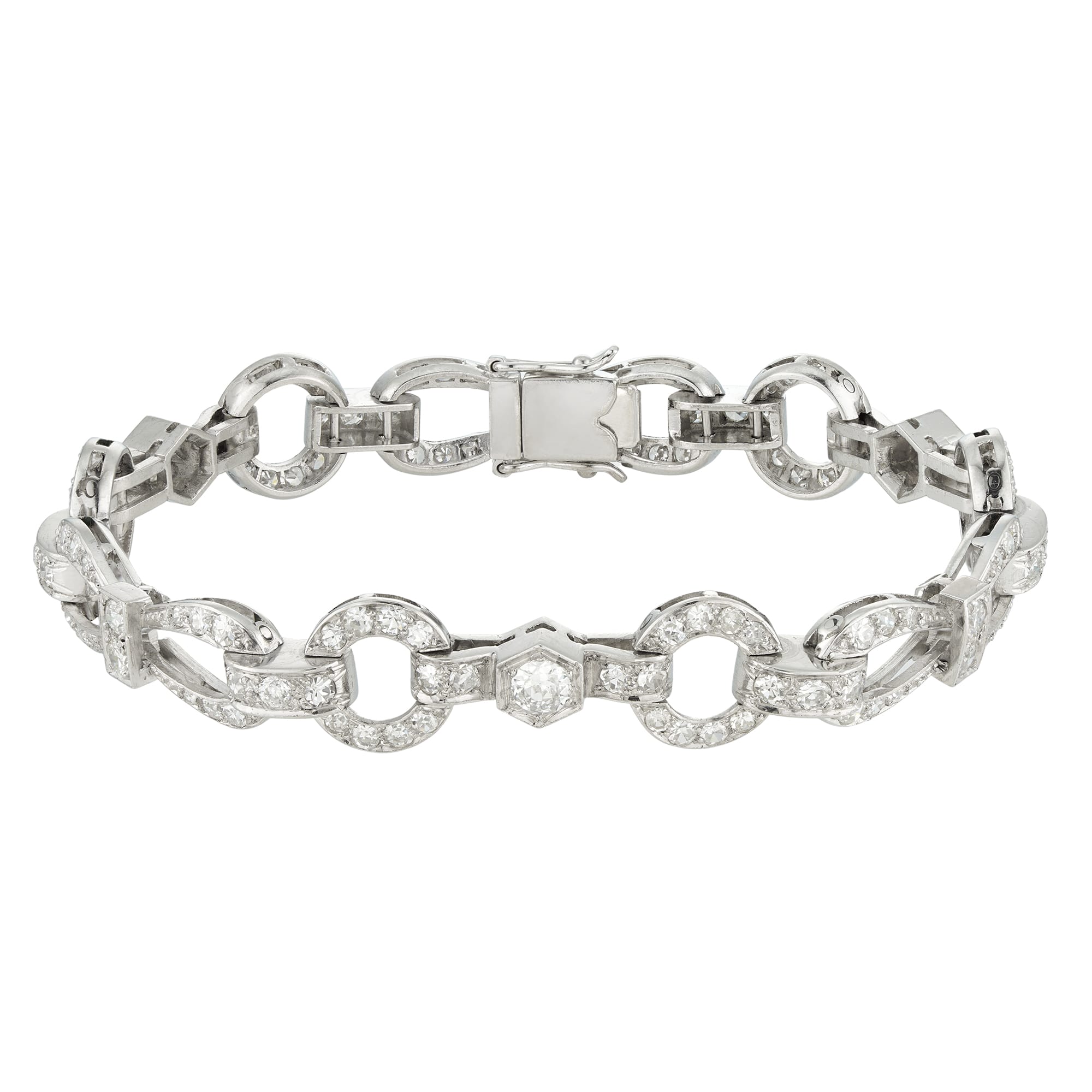 A mid-20th century diamond bracelet, the geometric design links embellished with old and Swiss-cut diamonds estimated to weigh 5 carats in total, all mounted in white gold, with hidden clasp and double safety catches, circa 1950, measuring 17 x 1cm, gross weight 25.1 grams.