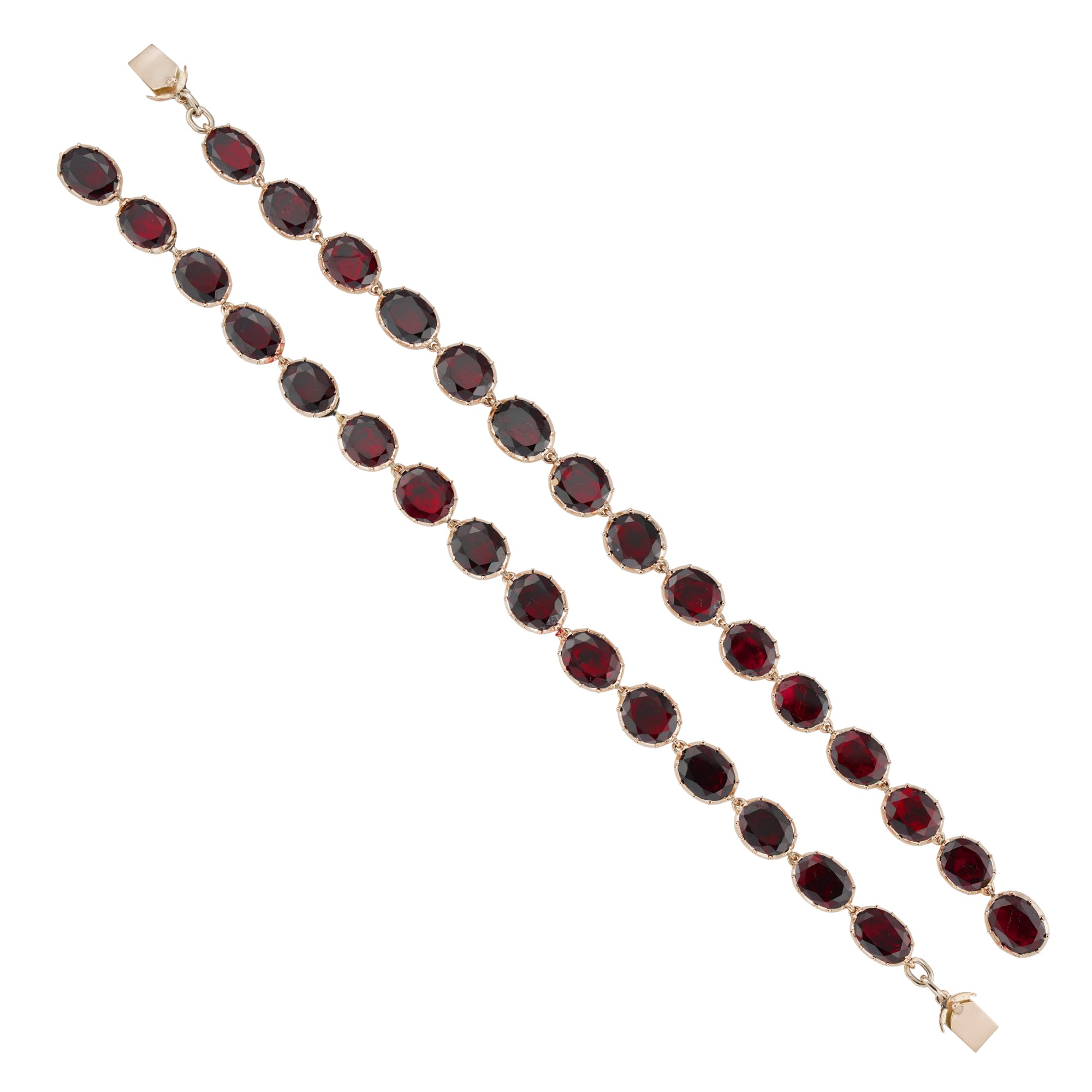 A pair of Victorian garnet bracelets, each consisting of fifteen oval-shaped faceted garnets, all individually set in gold cut-down collets with a closed back, to a hidden box clasp, circa 1860, can be combined and worn as a necklace, each ...