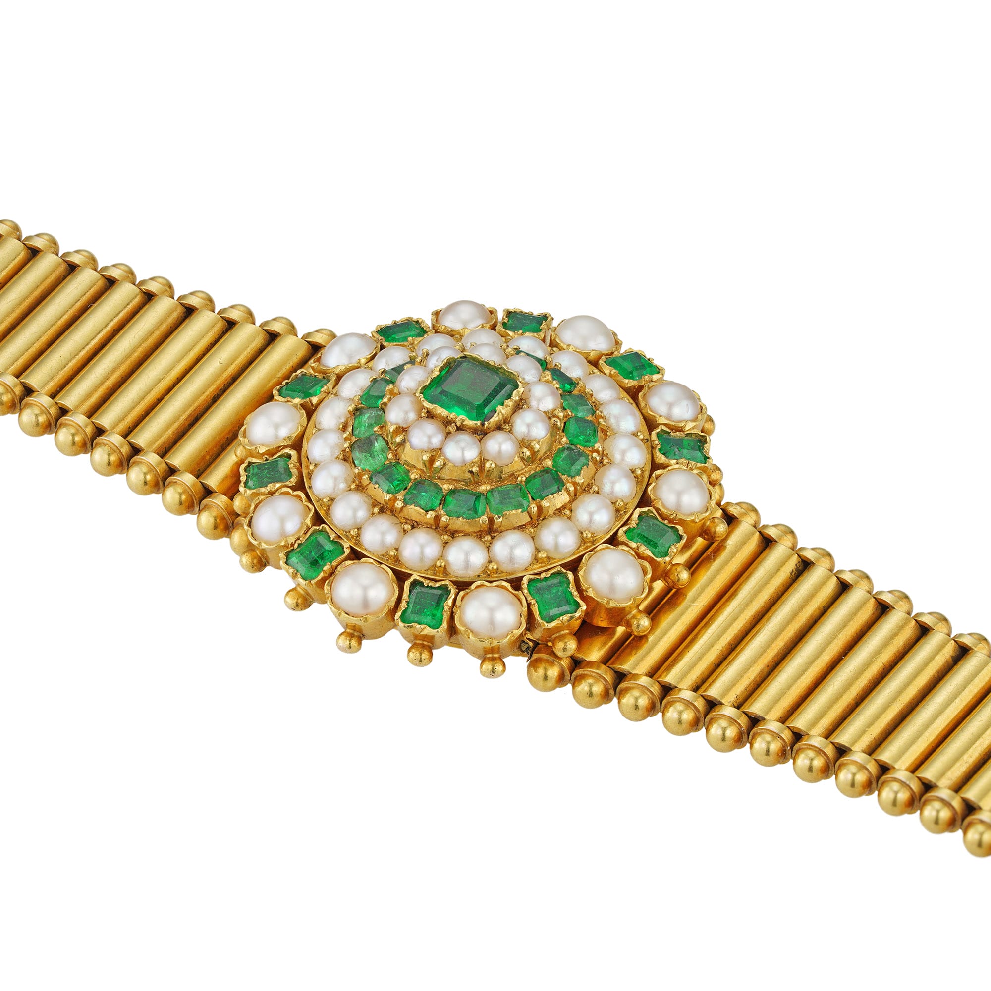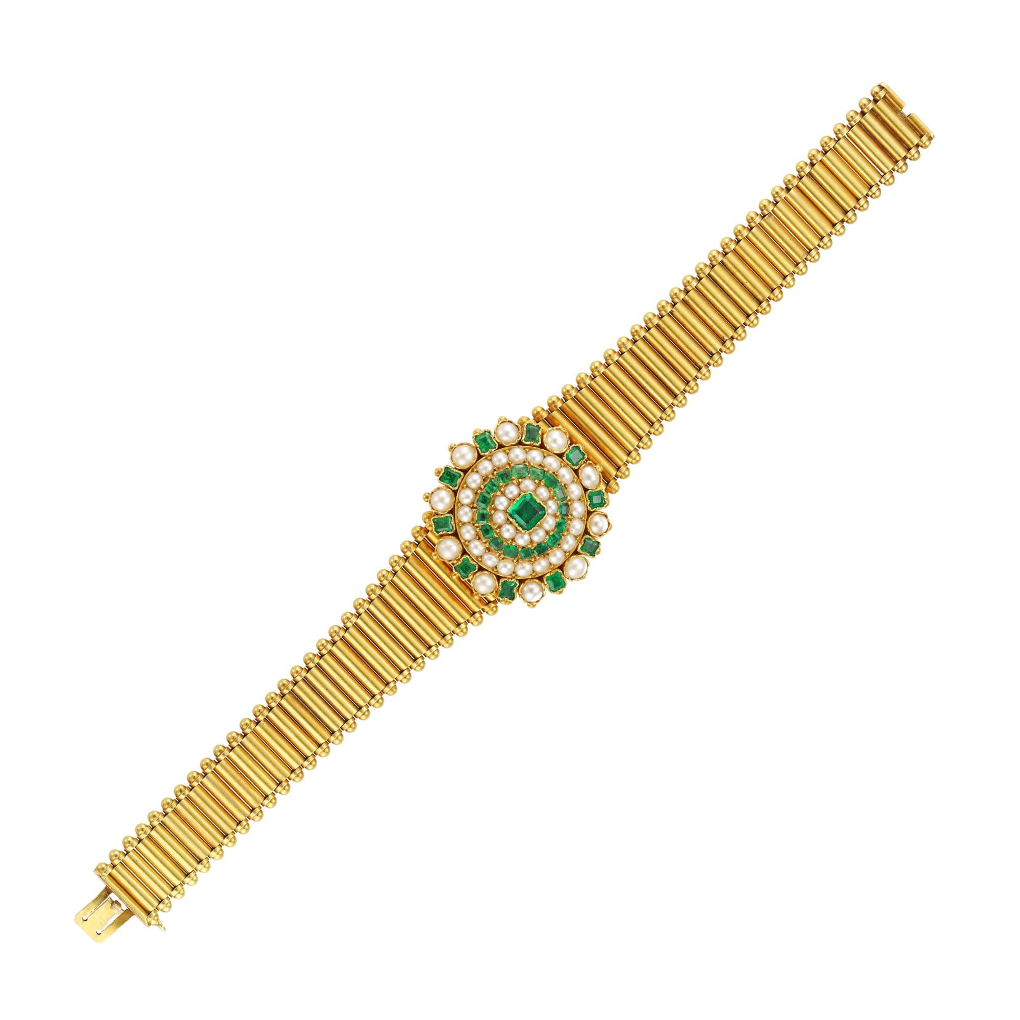A Victorian emerald and half pearl gold bracelet, the emerald and pearl cluster centrally-set with a square-cut faceted emerald estimated to weigh ½ carat, surrounded by alternating clusters of square-cut emeralds and half pearls, the emeralds estimated to weigh a ...