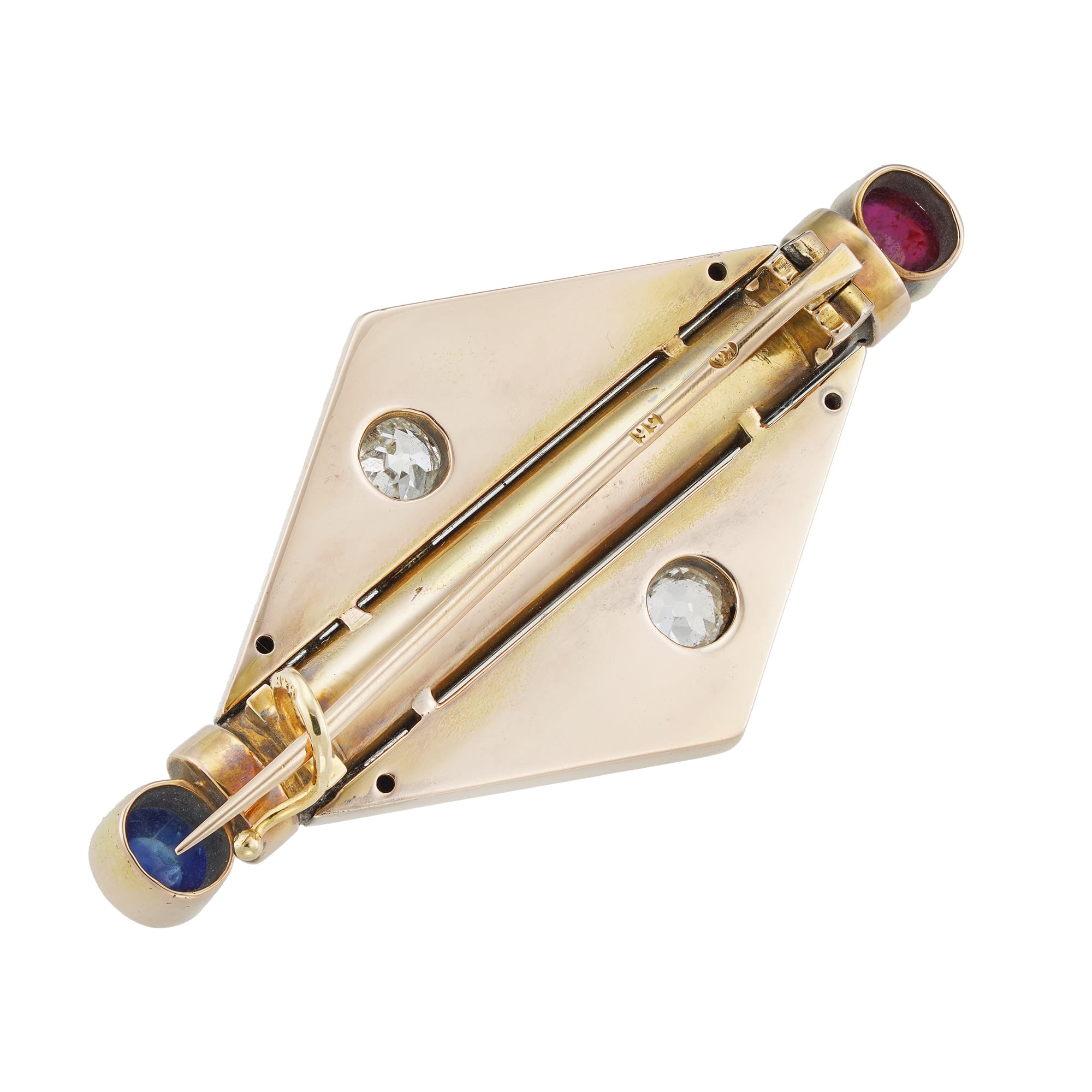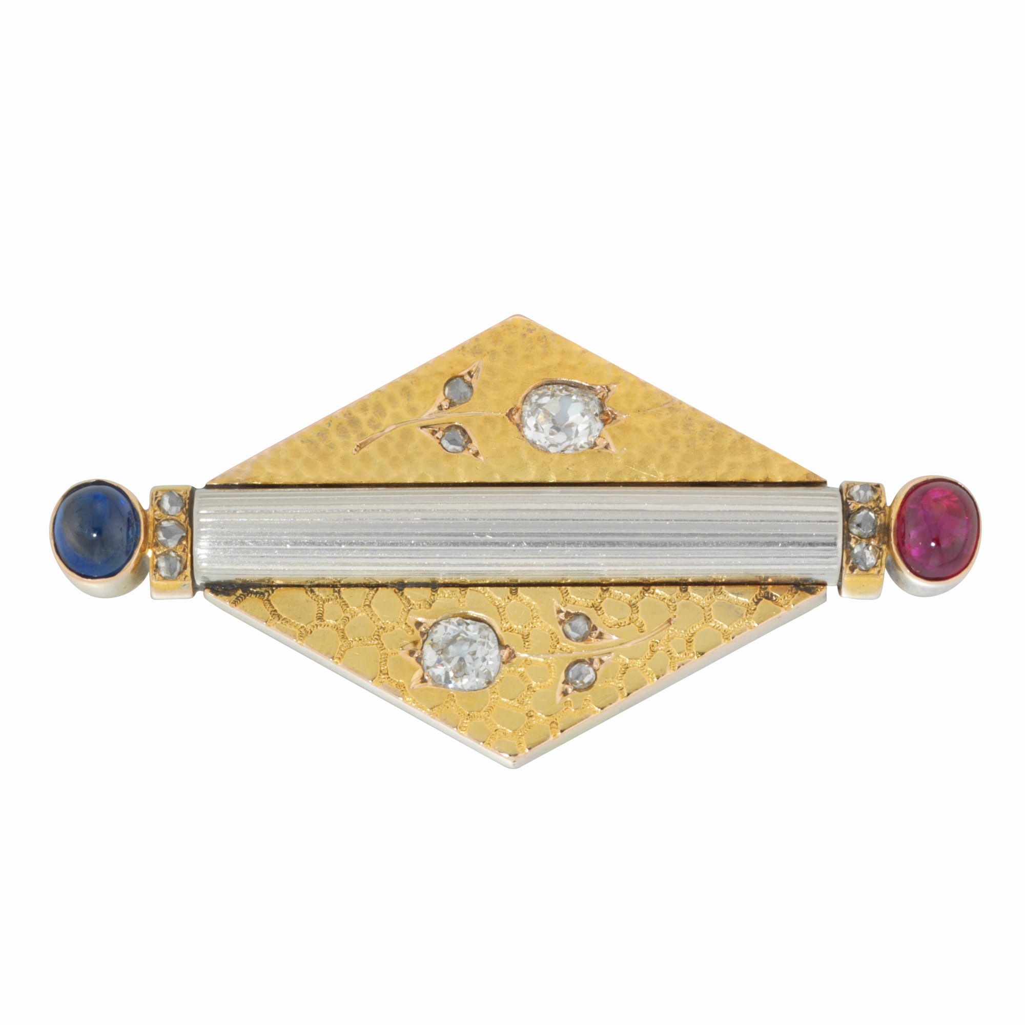 A Fabergé ruby, sapphire and diamond lozenge shaped brooch, with a white fluted baton-shaped motif set with a cabochon-cut sapphire and ruby at finials, with rose-cut diamond collars, on a yellow gold lozenge shaped plaque with two different textured finishes, ...