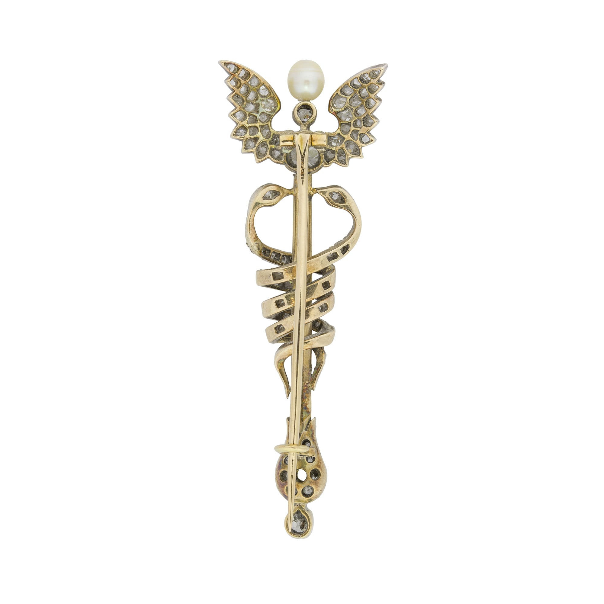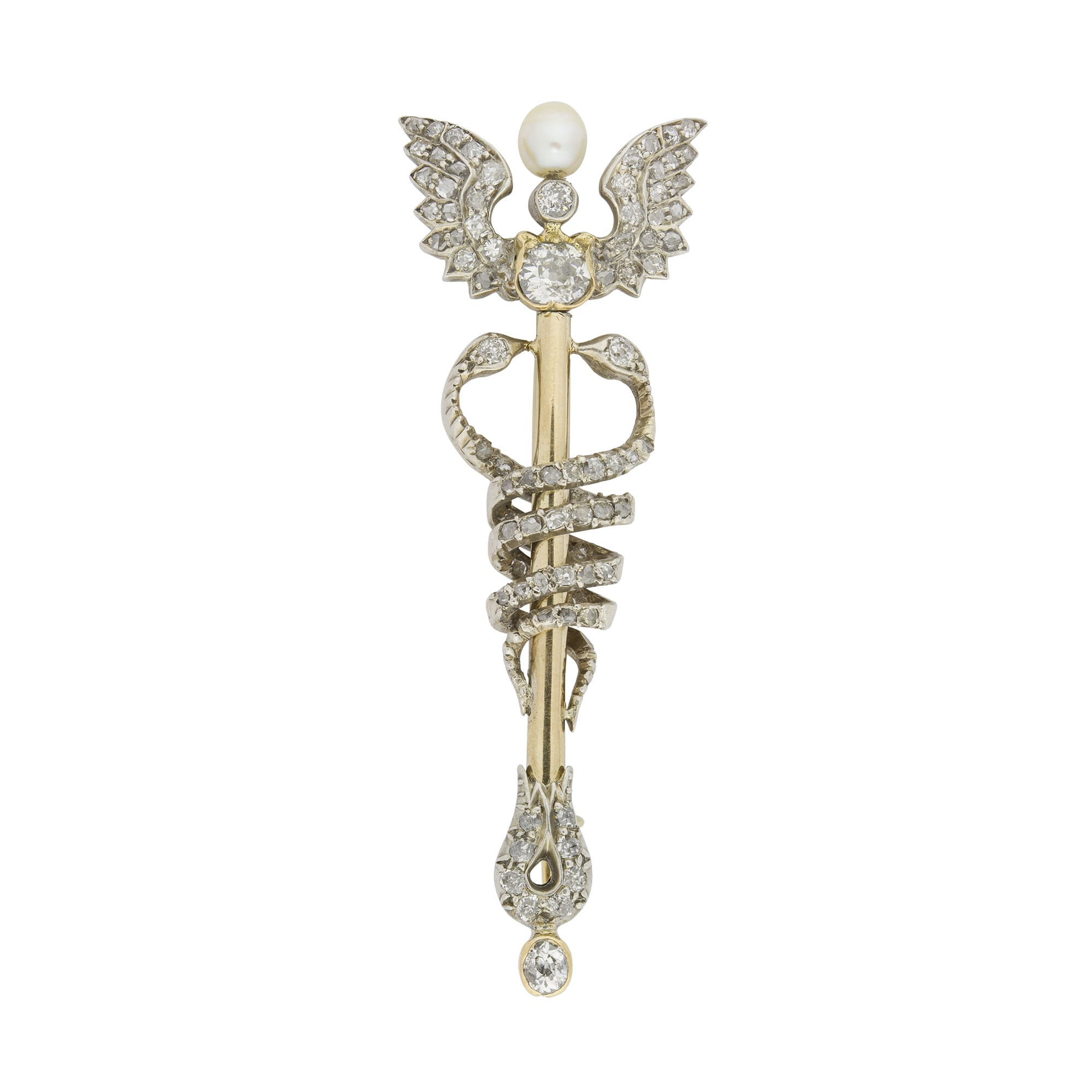 A late Victorian yellow gold and diamond Caduceus brooch, the winged staff white claw-set throughout with old brilliant-cut and rose-cut diamonds, a natural pearl raised to the centre, two diamond-set serpents entwined around the staff, all white claw set to ...