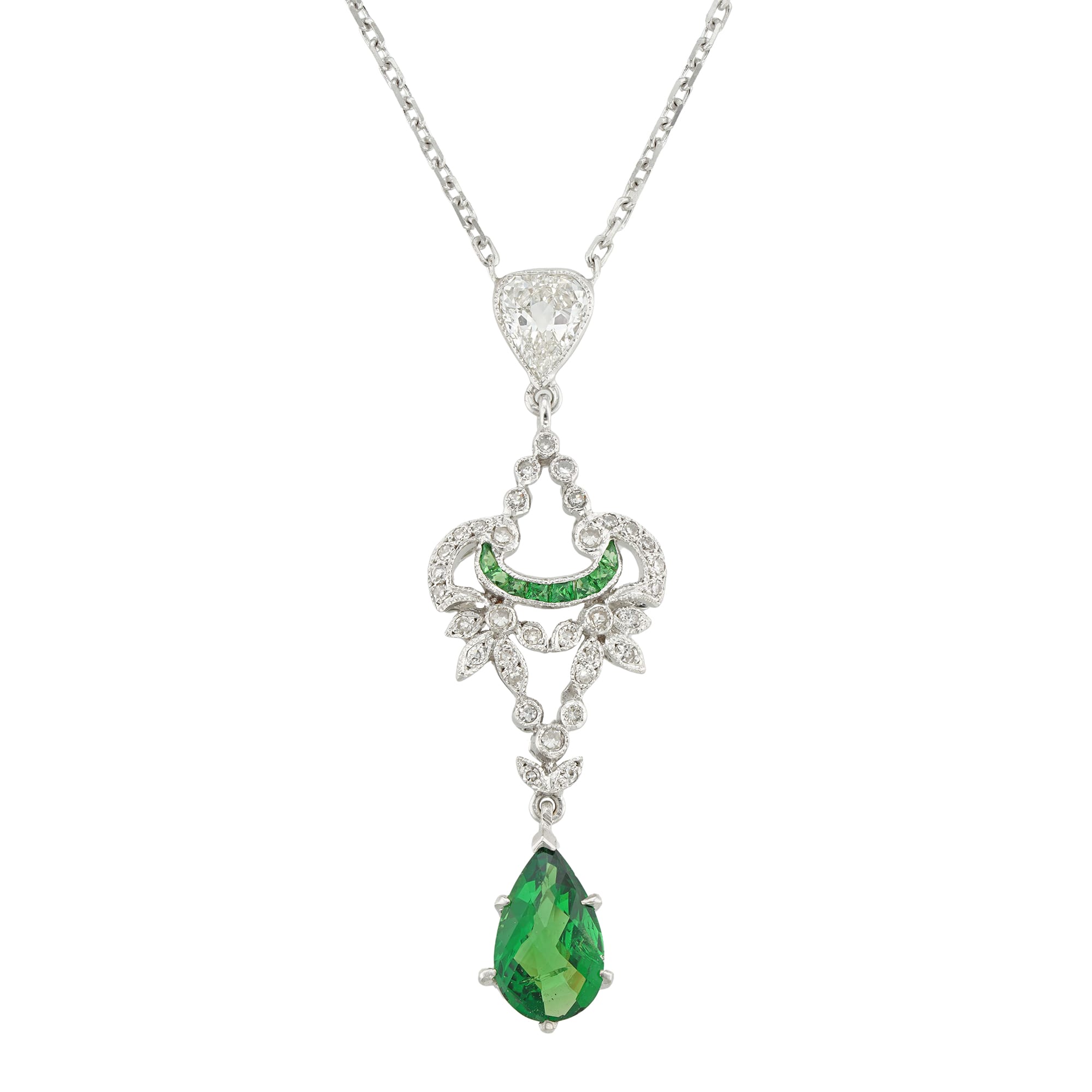 A green tourmaline and diamond drop pendant, the openwork scroll and foliate design plaque millegrain-set with small Swiss-cut diamonds and eight calibre-cut green garnets, with a pear-shaped rose-cut green tourmaline drop, all suspended by an old pear-shaped diamond estimated to ...