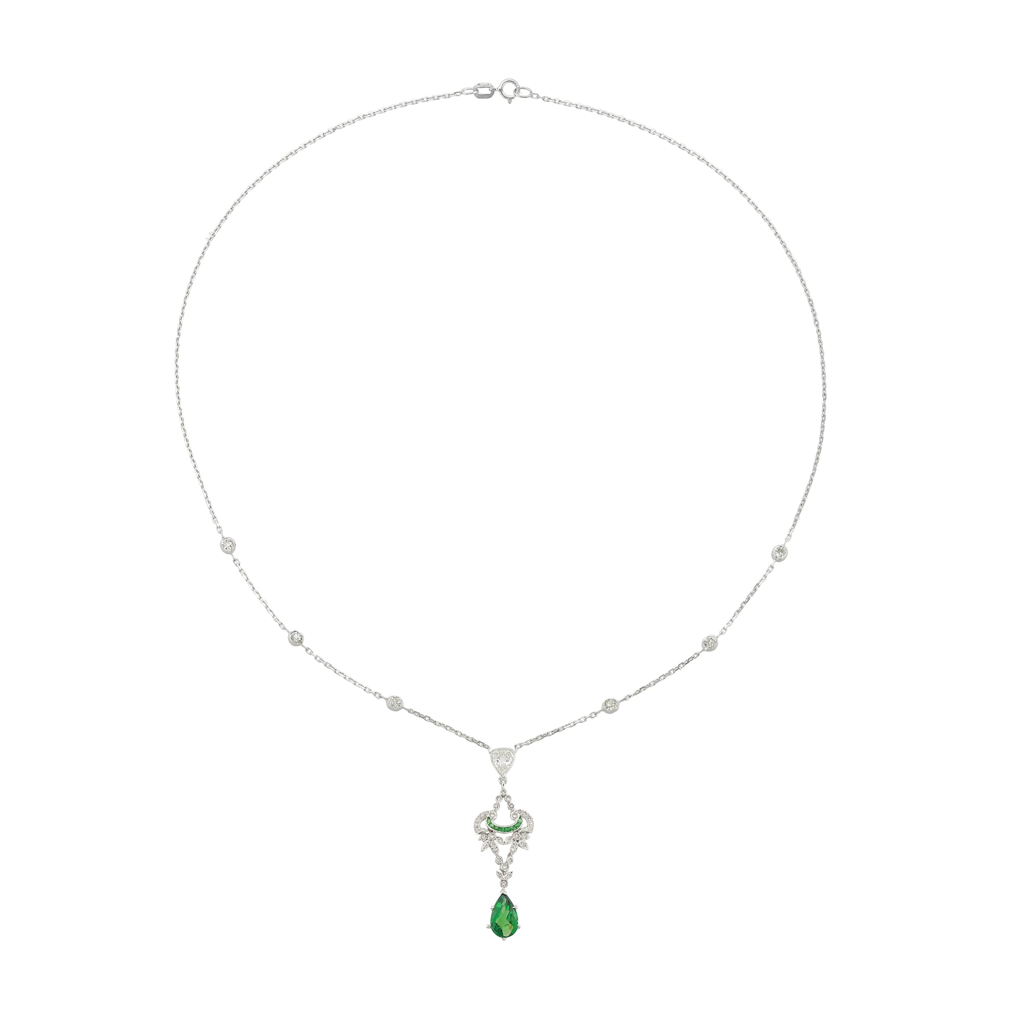 More informationA green tourmaline and diamond drop pendant, the openwork scroll and foliate design plaque millegrain-set with small Swiss-cut diamonds and eight calibre-cut green garnets, with a pear-shaped rose-cut green tourmaline drop, all suspended by an old pear-shaped diamond estimated to weigh 0.3 carats, with a white gold spectacle -set chain embellished with six ole European-cut diamonds and a bolt clasp, the diamonds estimated to weigh a combined total of 1 carat, all mounted in white gold, hallmarked 18ct gold London 2008, bearing the Bentley & Skinner sponsor mark, the pendant measuring 3.7 x 1.2cm, the chain measuring 40.5cm long, gross weight 4.5 grams.