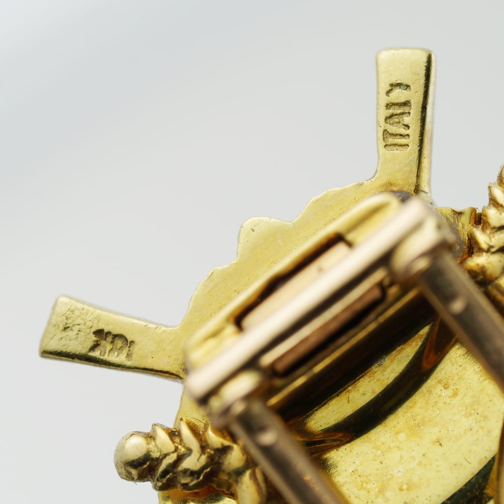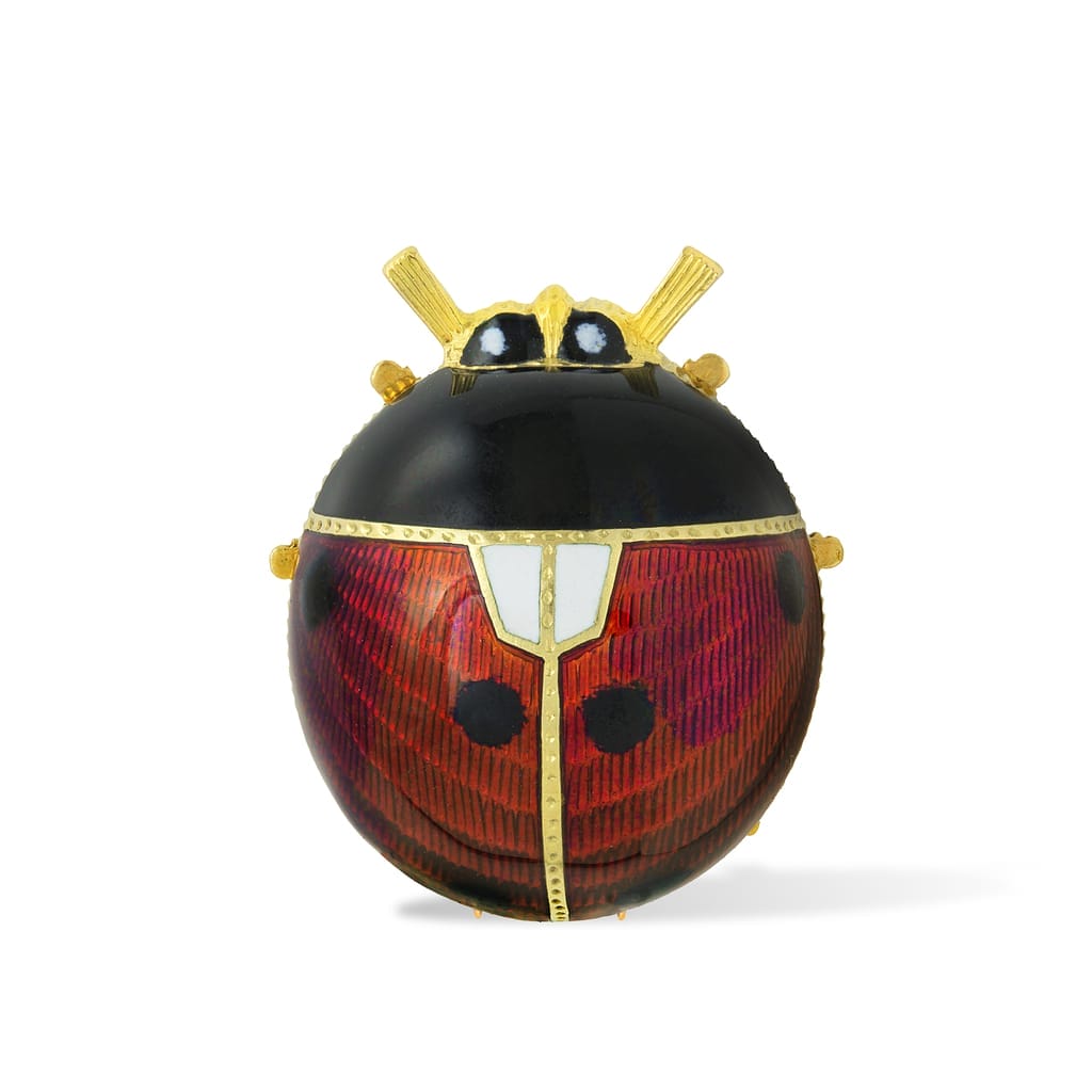 More informationA guilloché enamel ladybird brooch, the red, black and white enamelled body, all to a yellow gold mount with pin brooch fitting, marked 18ct gold, Italy, circa 1960, measuring approximately 2.7 cmin diameter gross weight 18.00 grams.