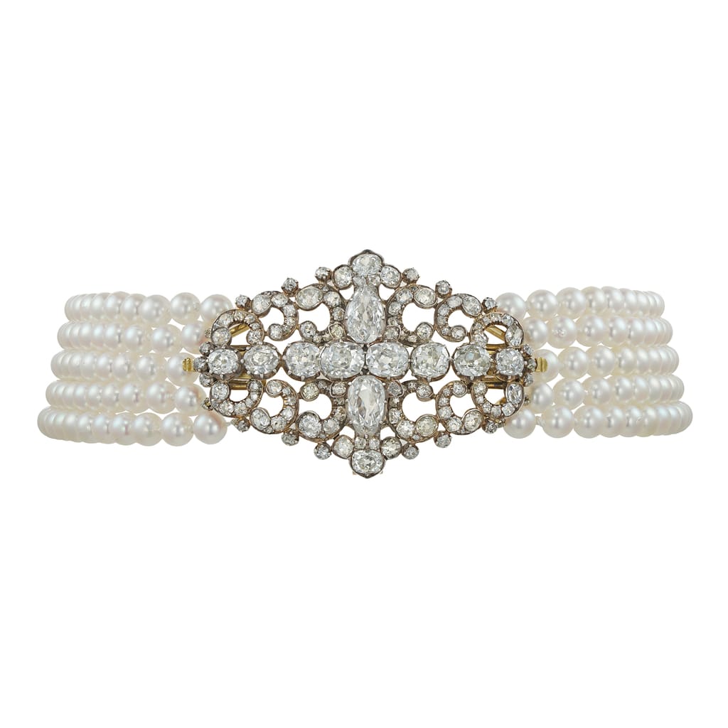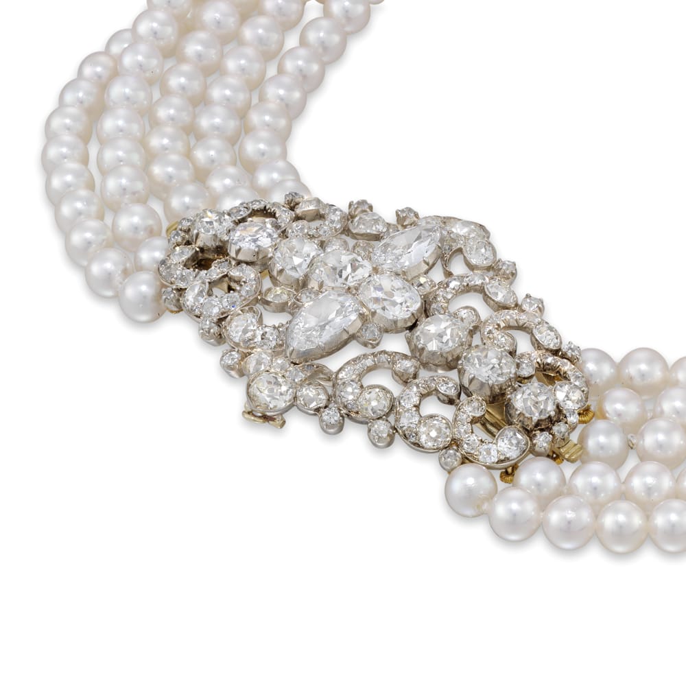 More informationA fine Victorian diamond scroll brooch strung here as a centrepiece on a cultured pearl choker necklace, centrally-set set with a row of graduating old European-cut diamonds and two old pear-shape-cut diamonds set vertically, all within an openwork panel of scroll design, set with approximately 14 carats of old-cut diamonds, all set in silver to yellow gold back, circa 1880, accompanied by detachable brooch fittings and five rows of cultured saltwater pearls each measuring approximately 5mm in diameter, the necklace measuring approximately 34.5 x 3.8cm, gross weight 74.9 grams, the diamond brooch centrepiece measuring approximately 5.4 x 3.8cm.