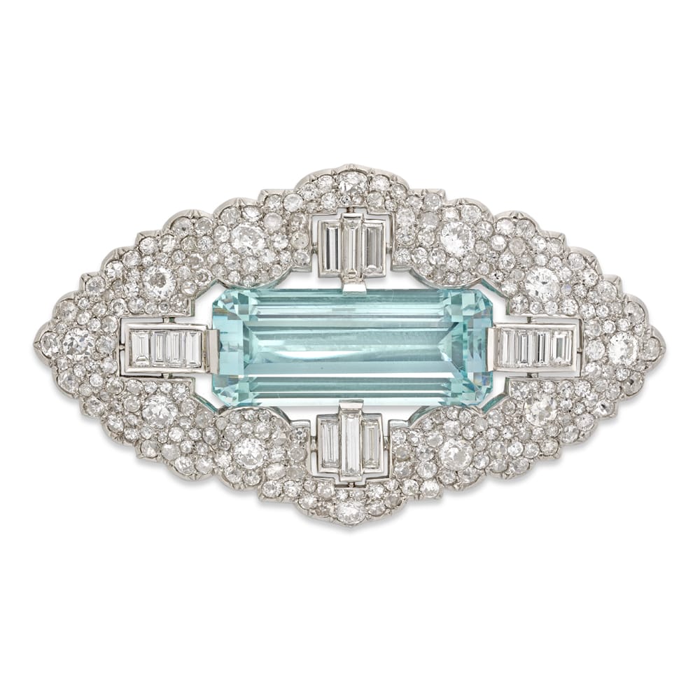 An Art Deco aquamarine and diamond brooch, the emerald-cut aquamarine weighing 27 carats between four sections set with baguette-cut diamonds, all surrounded by a Mughal-style design frame, set with old European and swiss-cut diamonds, the diamonds estimated to weigh 11 ...