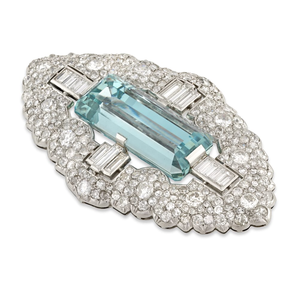 A stunning diamond and aquamarine brooch. This piece features a large emerald-cut aquamarine weighing 27 carats that shines with a lovely vivid blue hue. The aquamarine is set in an ornate and sparkling diamond frame with a Mughal design, which became popular in the Art Deco period. A gorgeous piece.