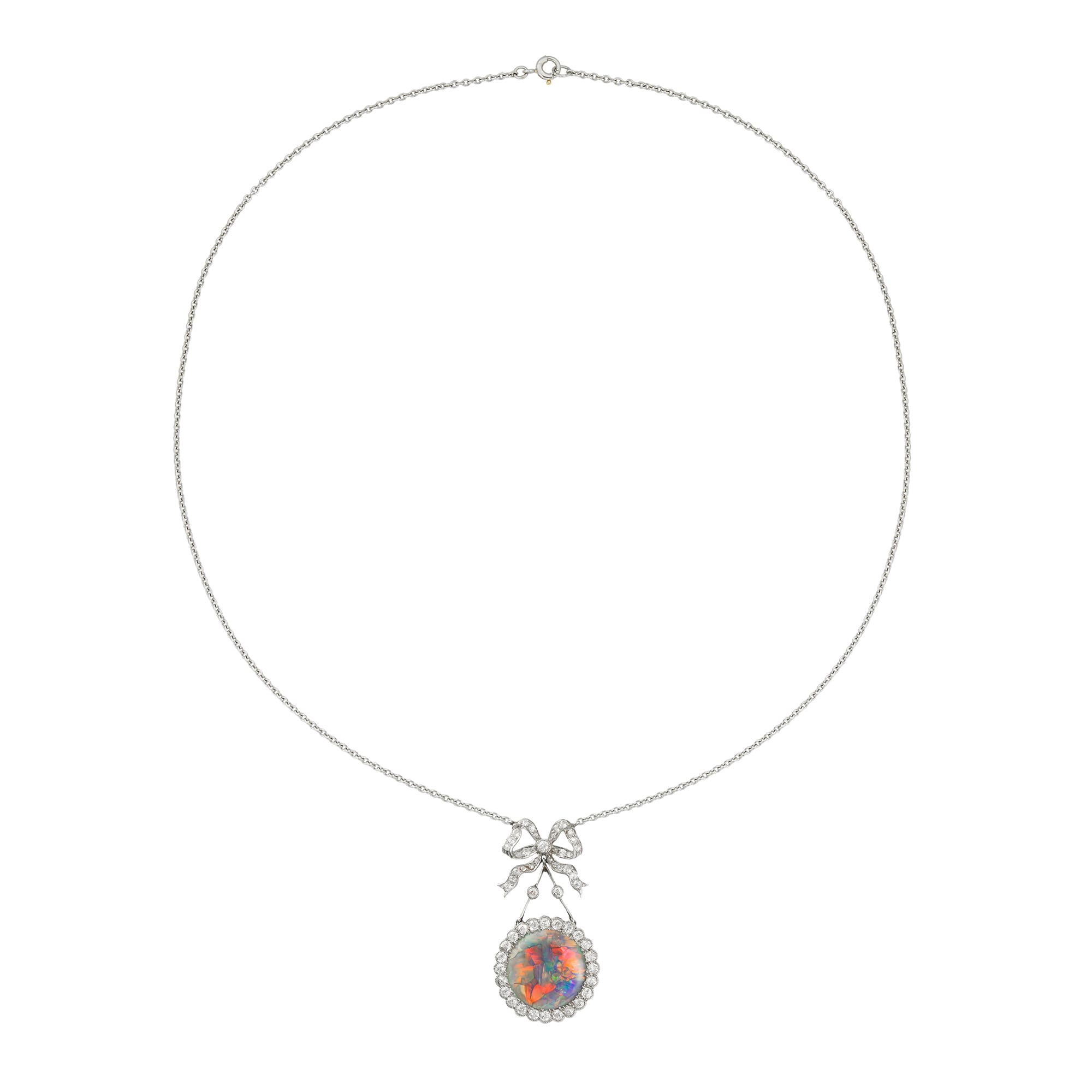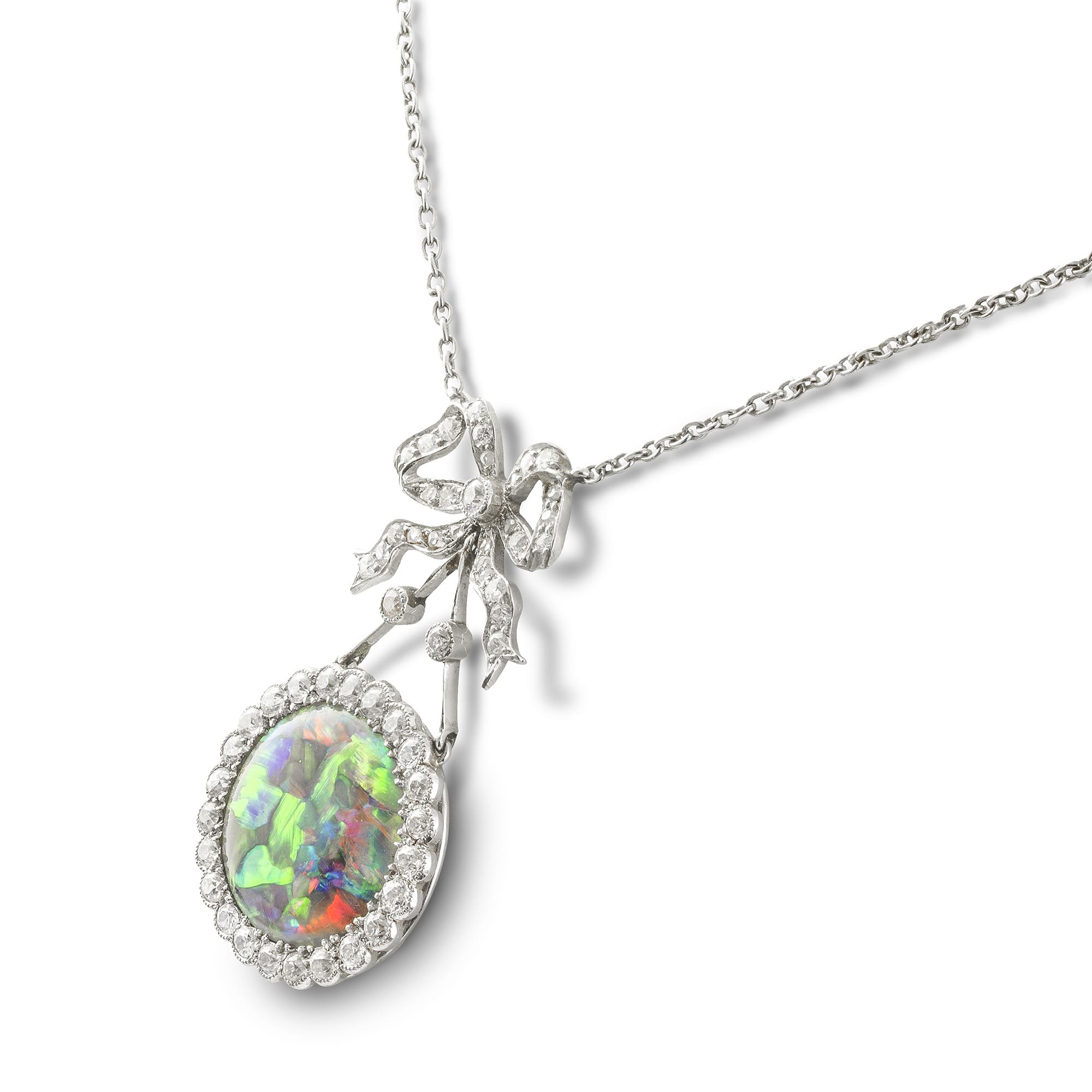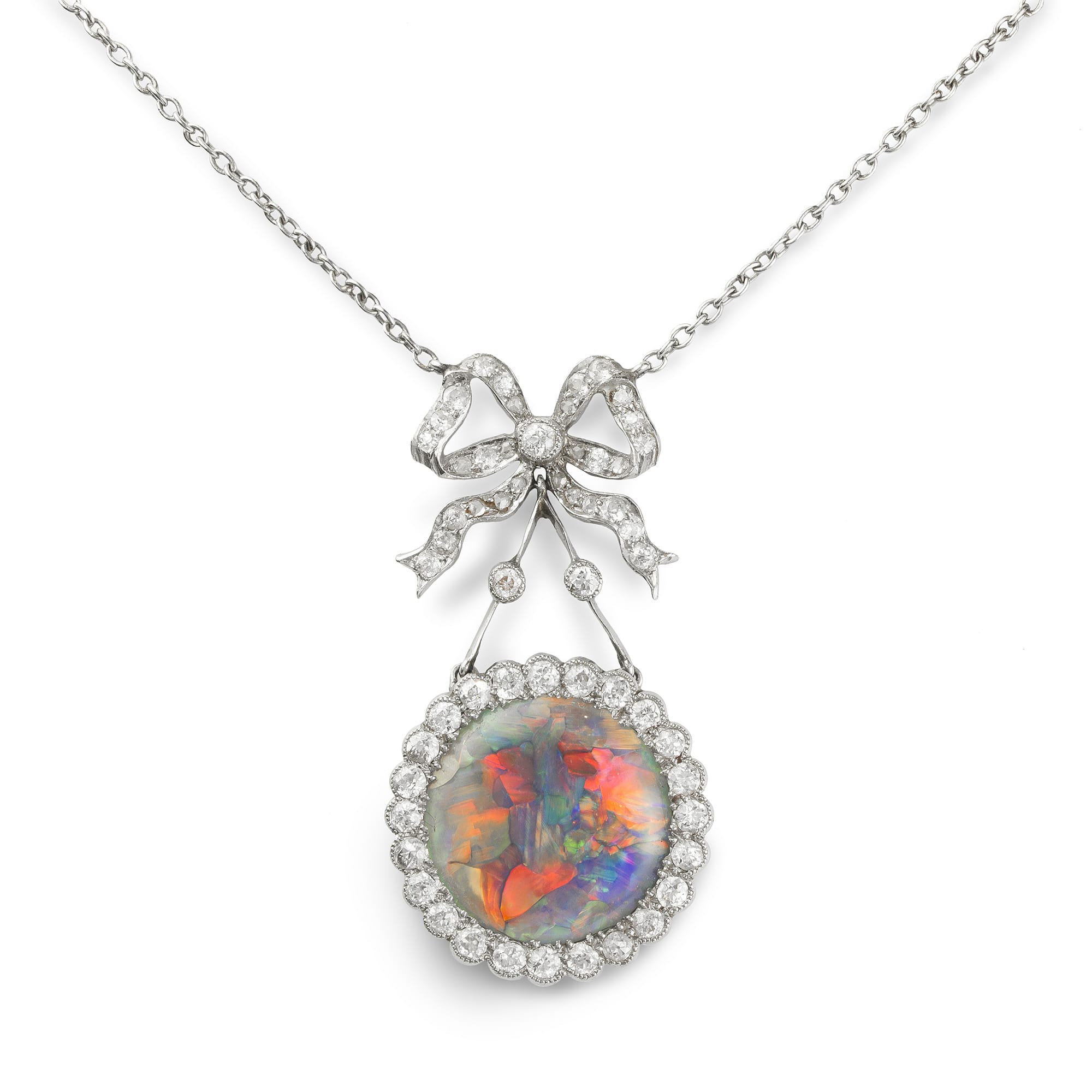 An Edwardian opal and diamond pendant, the central circular opal is surrounded by old brilliant-cut diamonds in a platinum millegrain setting suspended from a diamond-set bow attached to a platinum chain, circa 1910, the pendant measuring 3.4×1.8cm, gross weight 6.1grams. ...