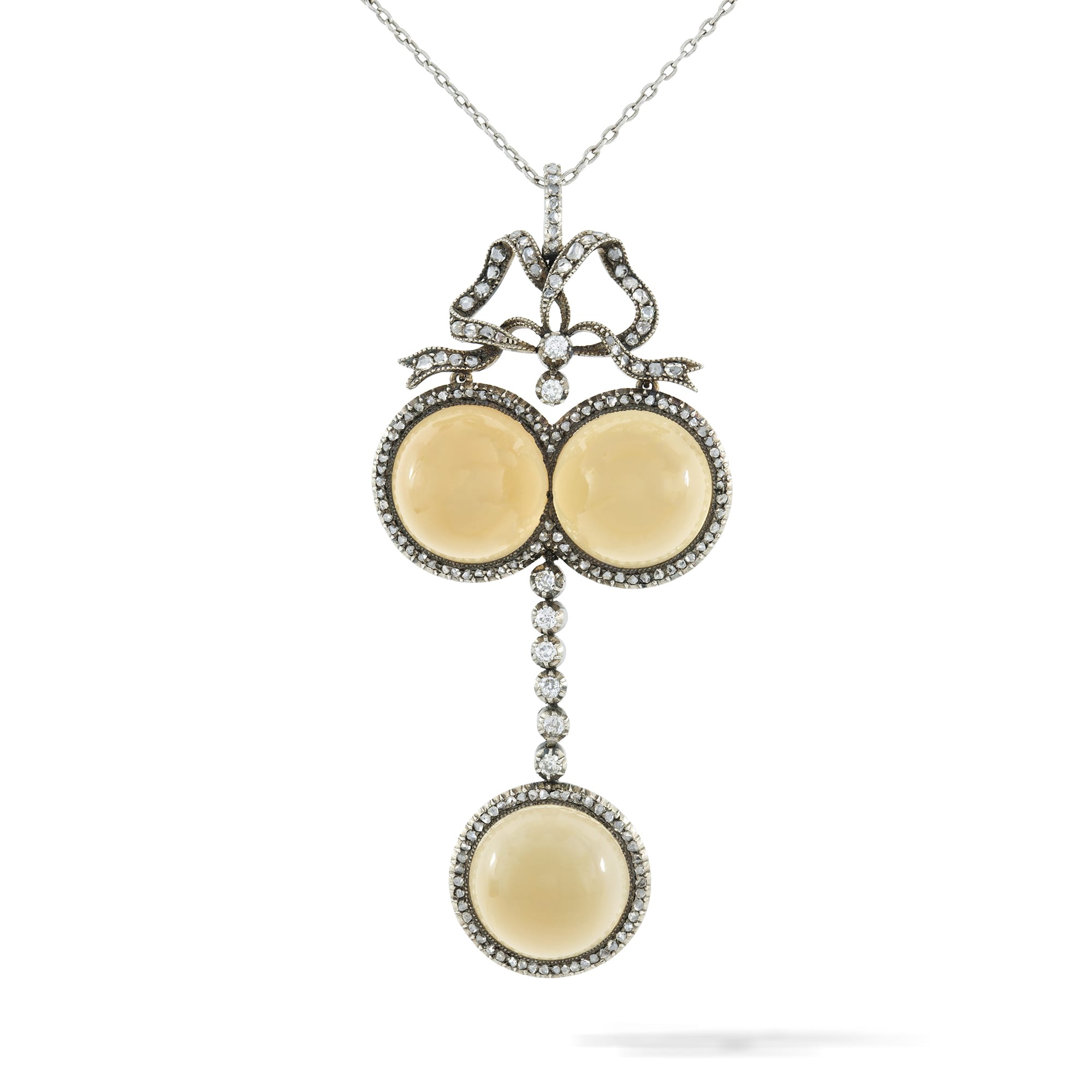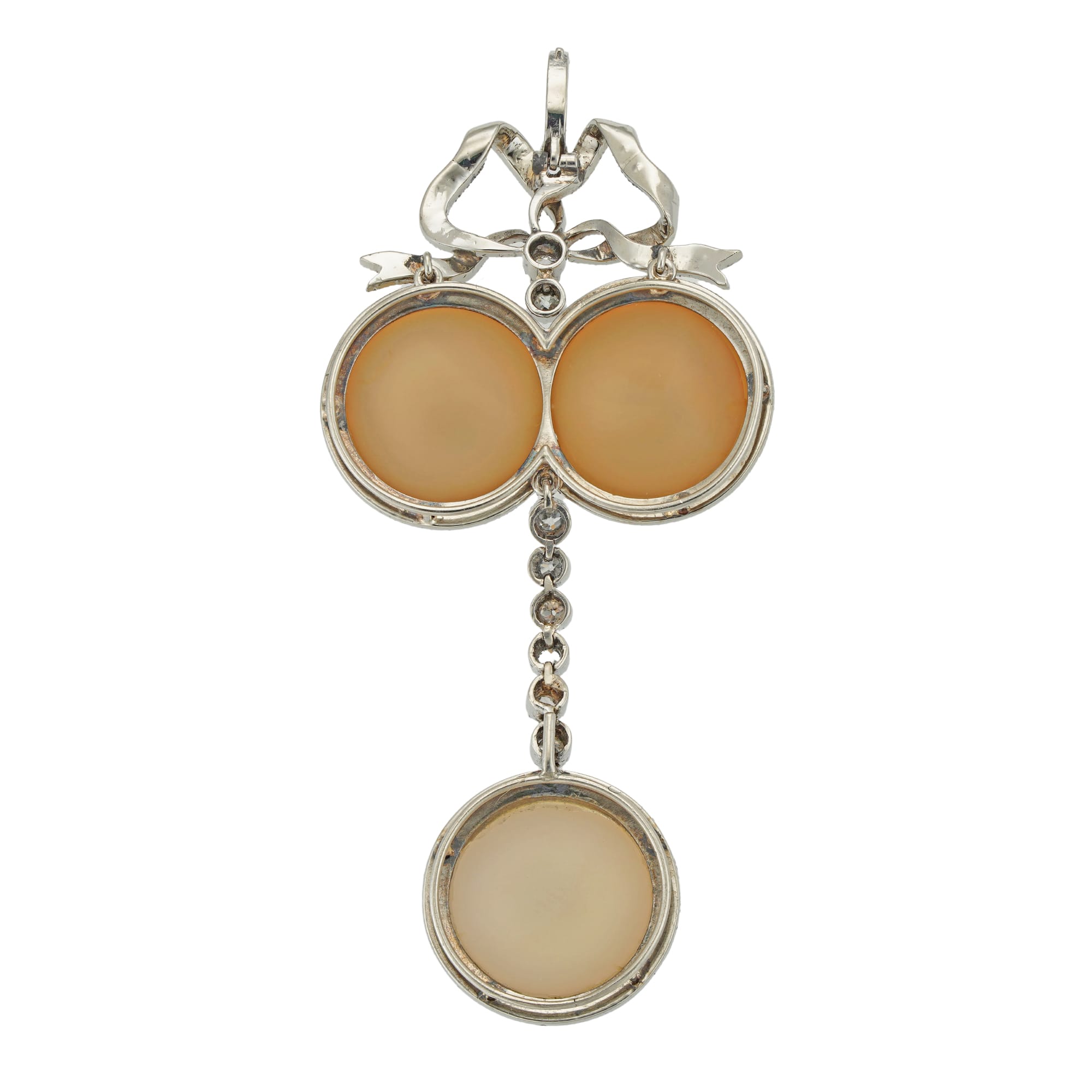 A Belle Epoque chalcedony and diamond pendant, in neoclassical style the two round cabochon-cut chalcedonies within a border of rose-cut diamonds, with rose-cut diamond-set bow surmount, suspending a line of six old European-cut diamonds terminating to a cabochon chalcedony with ...