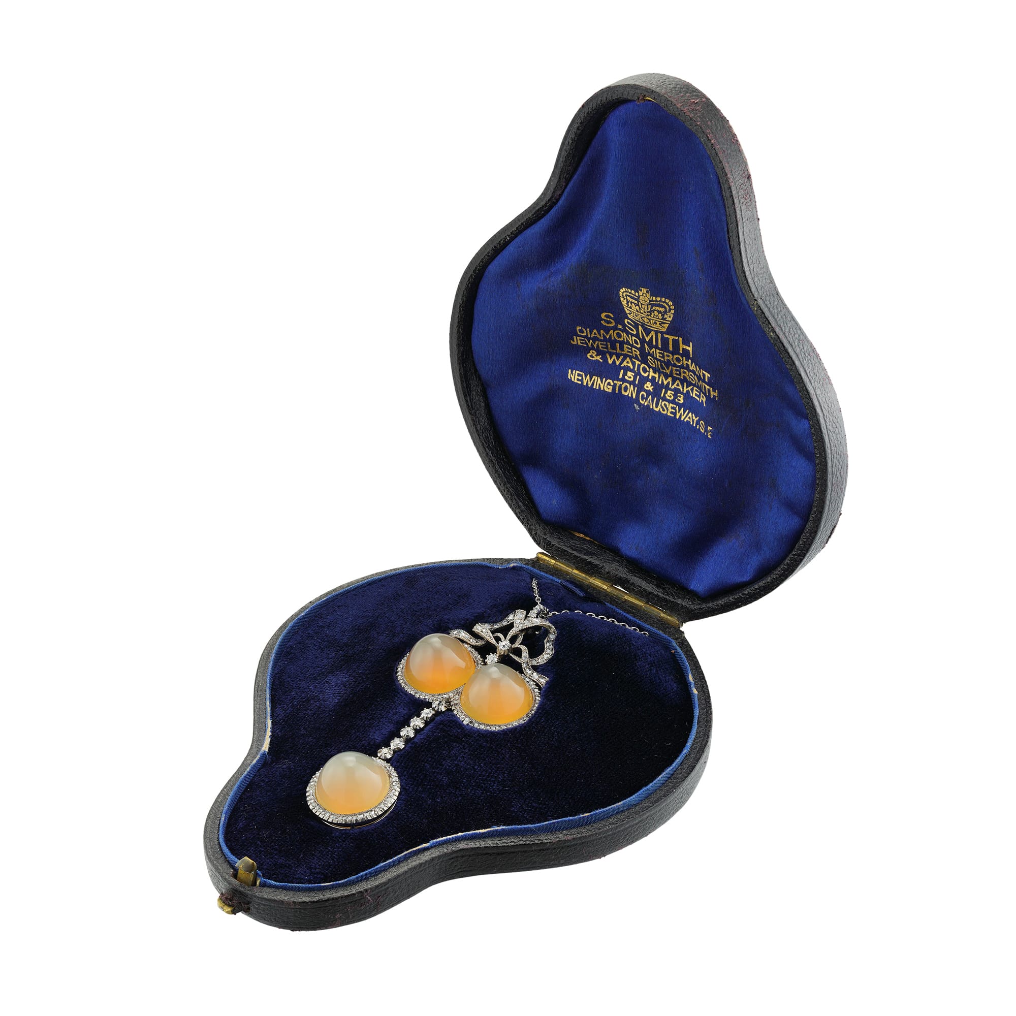 More informationA Belle Epoque chalcedony and diamond pendant, in neoclassical style the two round cabochon-cut chalcedonies within a border of rose-cut diamonds, with rose-cut diamond-set bow surmount, suspending a line of six old European-cut diamonds terminating to a cabochon chalcedony with diamond-set surround, all set in gold and suspended by platinum chain, Russian possibly by Bolin, circa 1900, measuring approximately 6.6 x 3cm, the chain measuring approximately 47cm long, gross weight 13.5grams, accompanied by later fitted case.