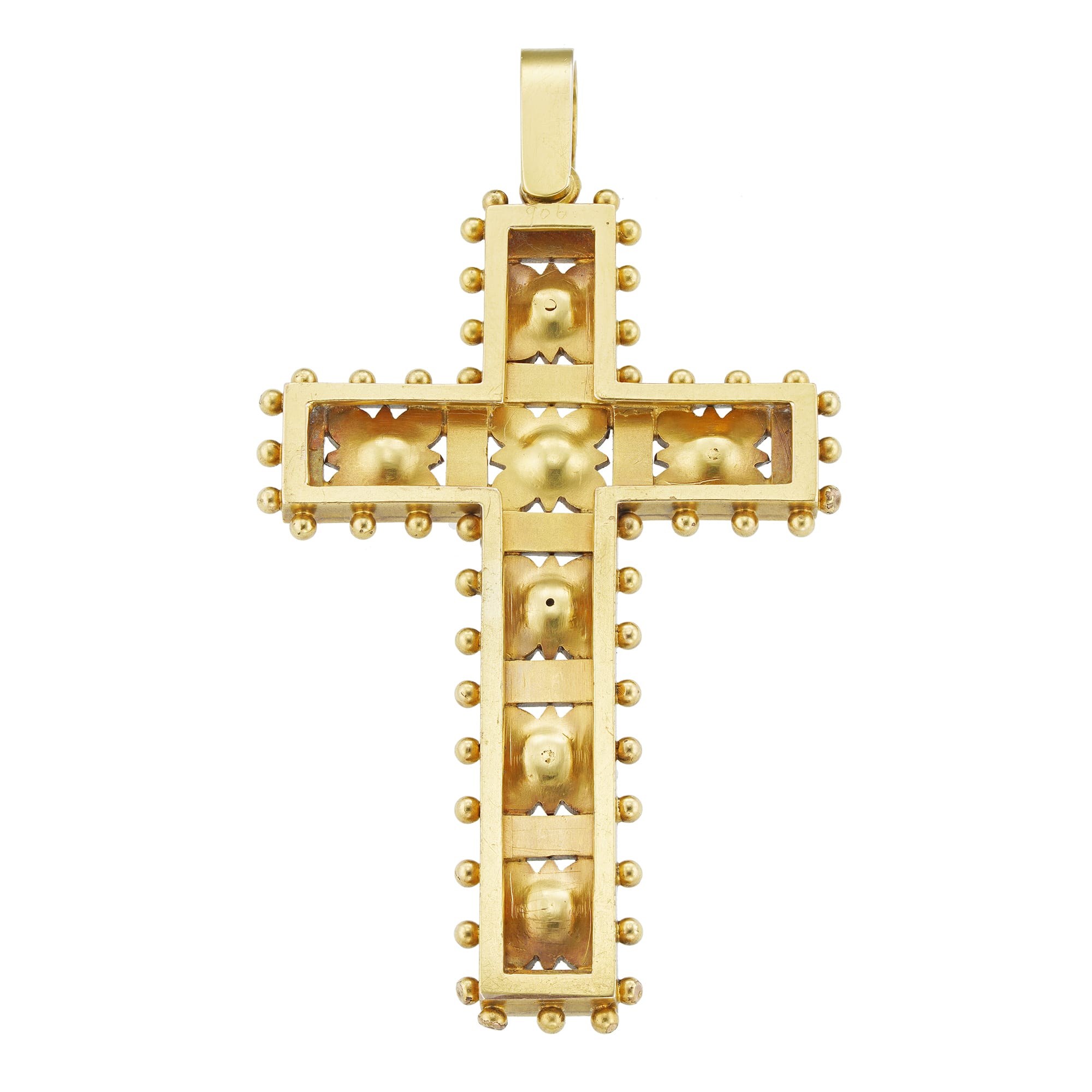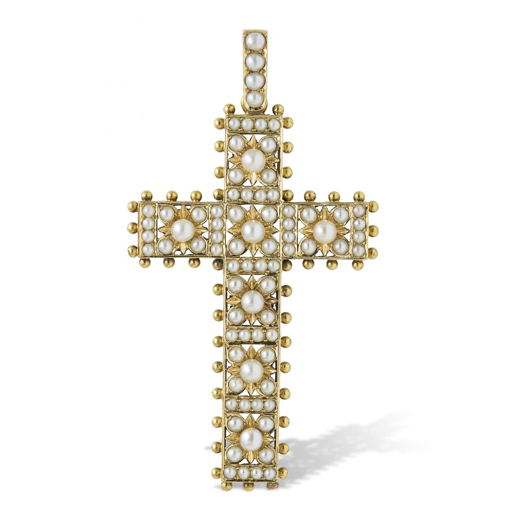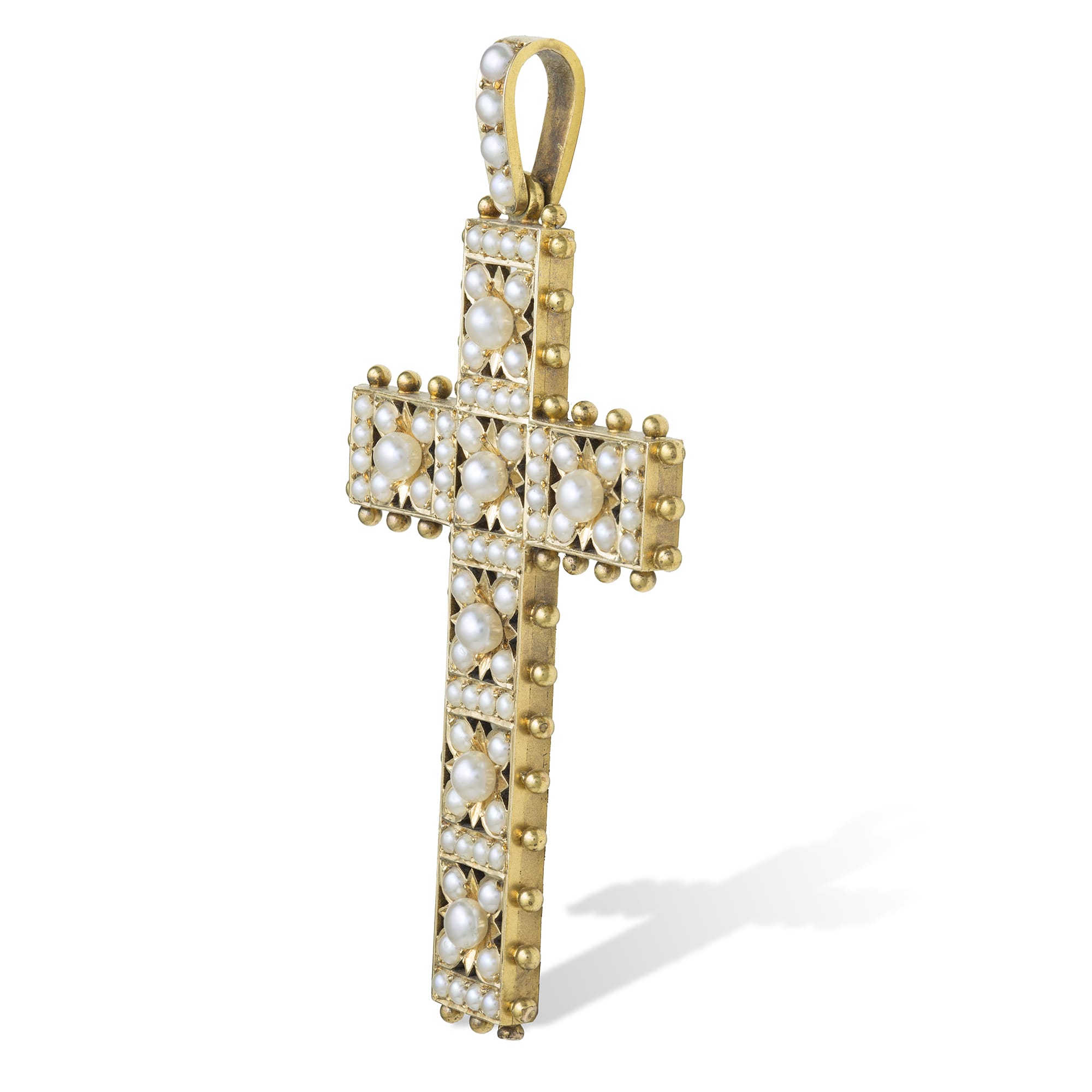More informationA Victorian pearl and yellow gold cross pendant, the openwork pendant in the form of a Latin cross, set throughout with natural half-pearls and embellished with yellow gold beaded decoration, to a yellow gold mount and pearl-set loop, circa 1870, measuring approximately 7 x 3.7cm, gross weight 15.58 grams.