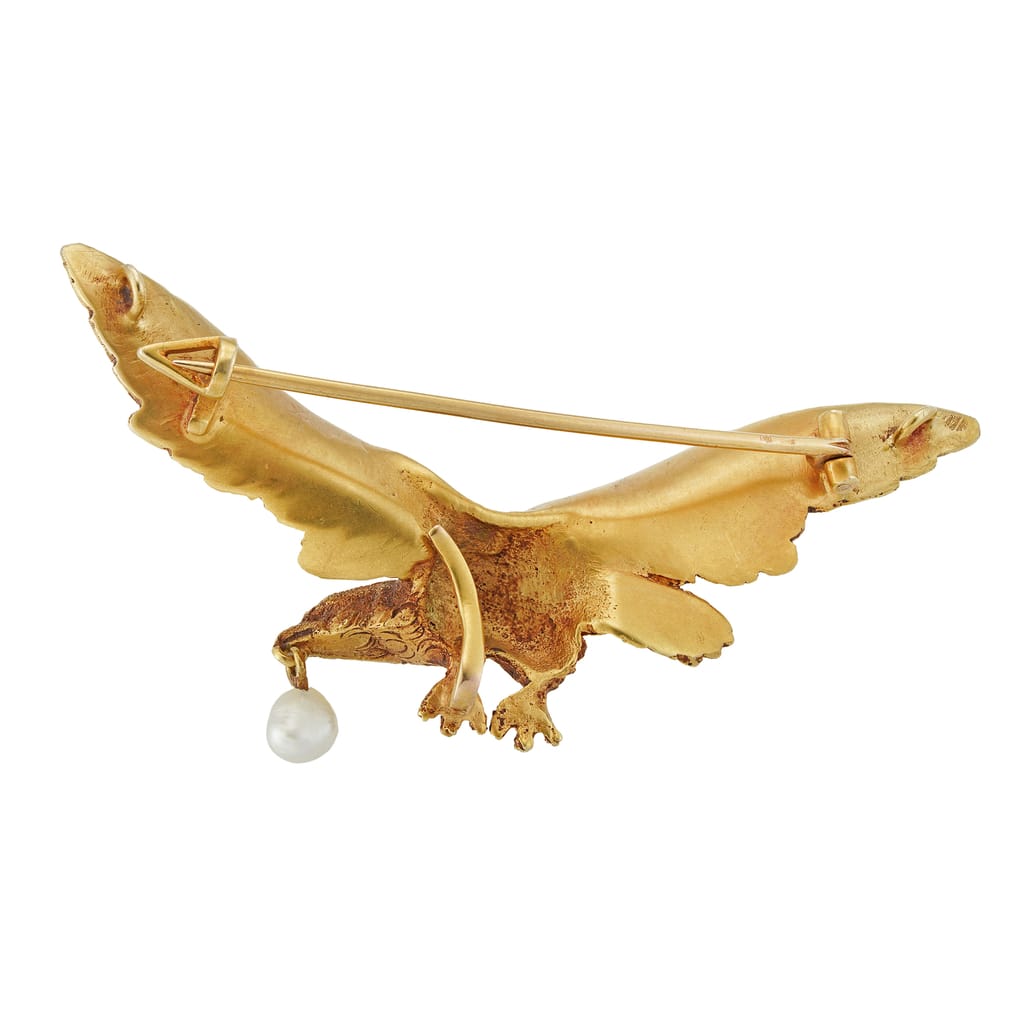 A French nineteenth century carved gold eagle brooch, the eagle magnificently carved in yellow gold with outstretched wings carrying an pearl in its beak with rat-tail and pin fitting to reverse, stamped with the French eagle head export mark, circa ...