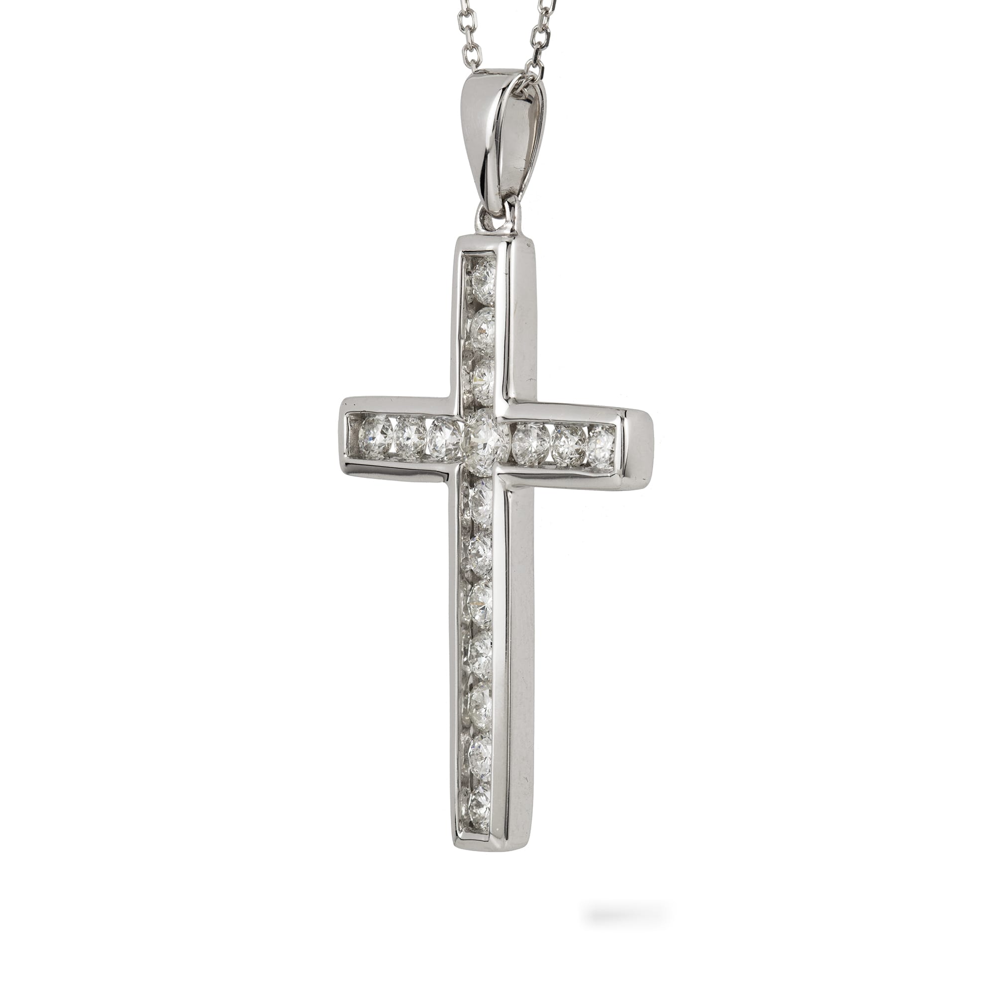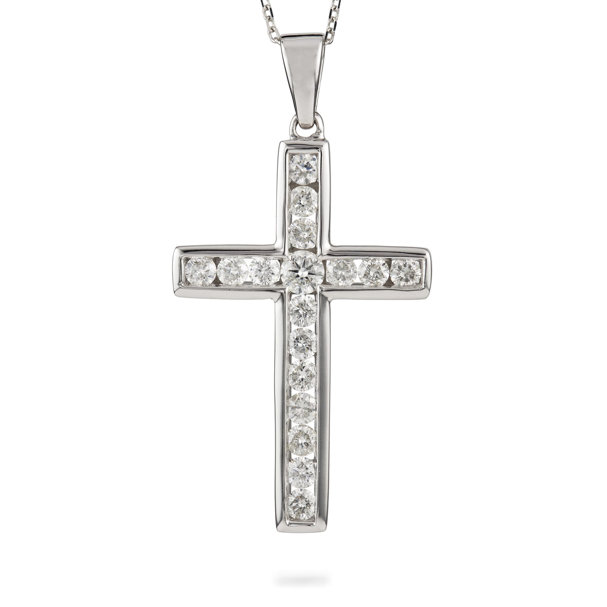 An elegant cross pendant and white gold chain. This simple cross is set with just under one carat combined weight of dazzling diamonds, which catch the light beautifully. This is the perfect piece for everyday wear, subtle enough to dress up a simple outfit.
