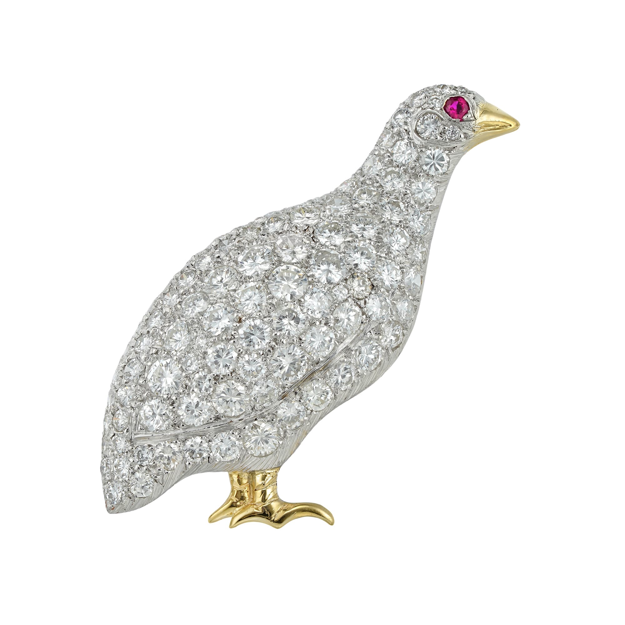A diamond-set partridge brooch, the body pave-set with round brilliant-cut diamonds estimated to weigh approximately 5 carats in total and a round faceted ruby-set eye, the beak and feet gold gilded, with a gold brooch fitting, hallmarked 950 platinum, London, ...
