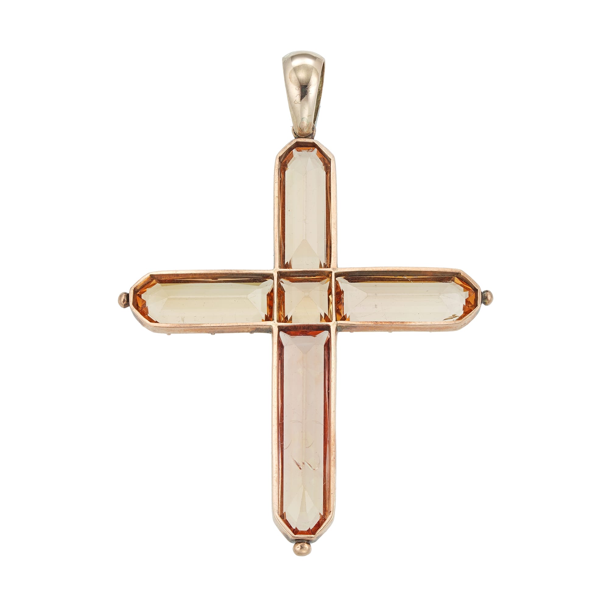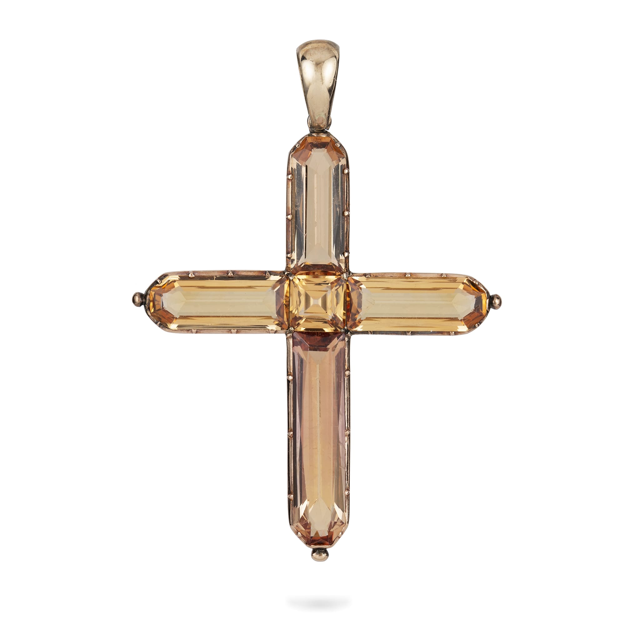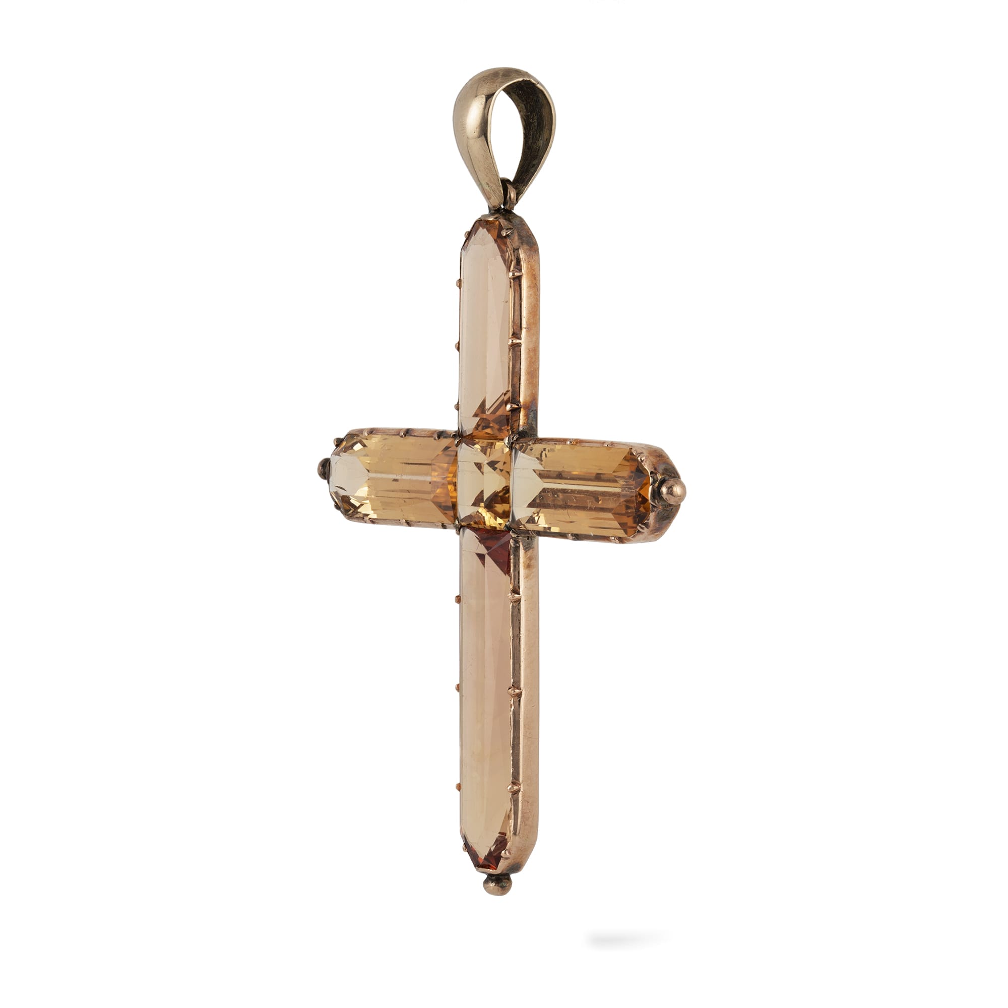 A Georgian topaz cross pendant, the centre and the arms of the Latin style cross set with sherry coloured faceted topazes, cut-down collet set to a gold mount and pendant loop, circa 1810, measuring approximately 6 x 4.2cm, gross weight ...
