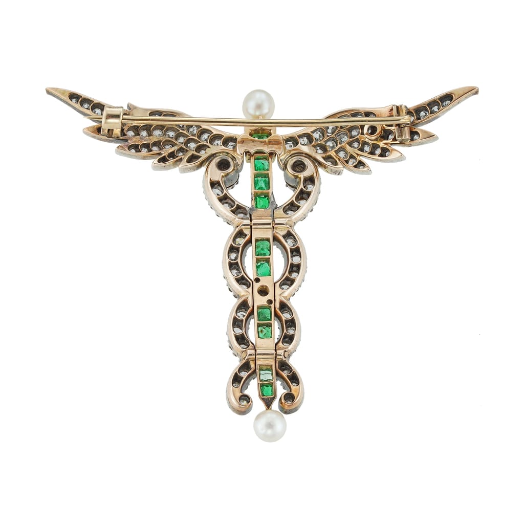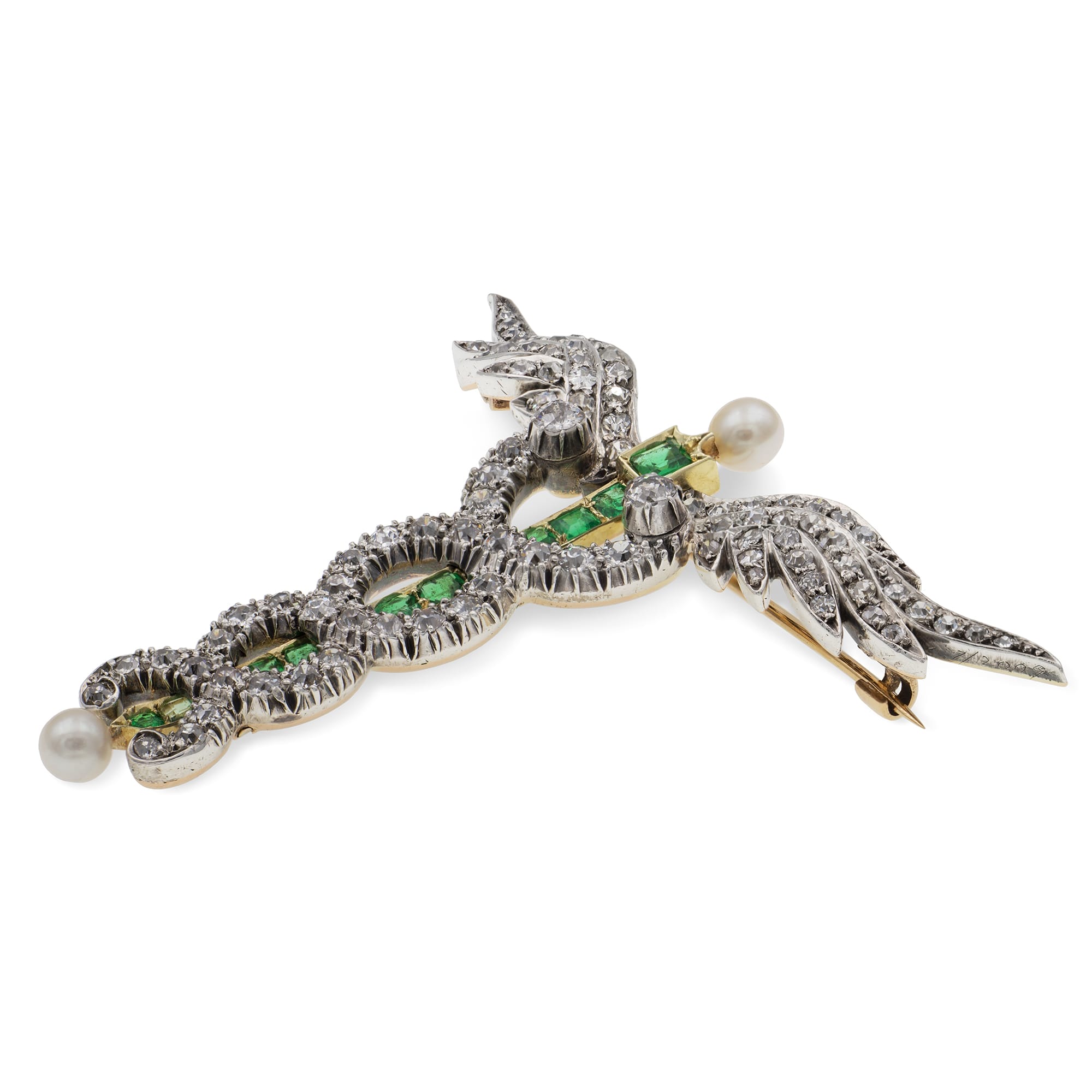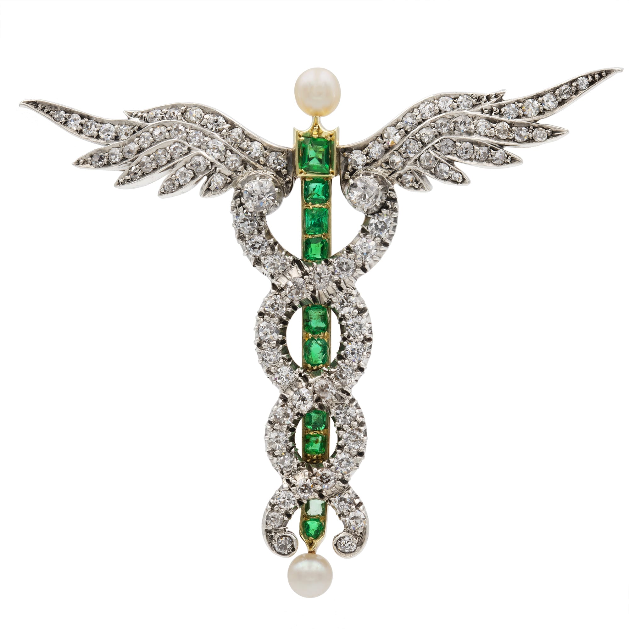 A wonderful Victorian brooch in the form of a Caduceus. Taking inspiration from Greek mythology, this is a stylish and elegant depiction of the staff of Hermes. The eye is drawn to the central rod of brilliant emerald, around which diamond serpents coil, their heads meeting glistening outstretched diamond wings