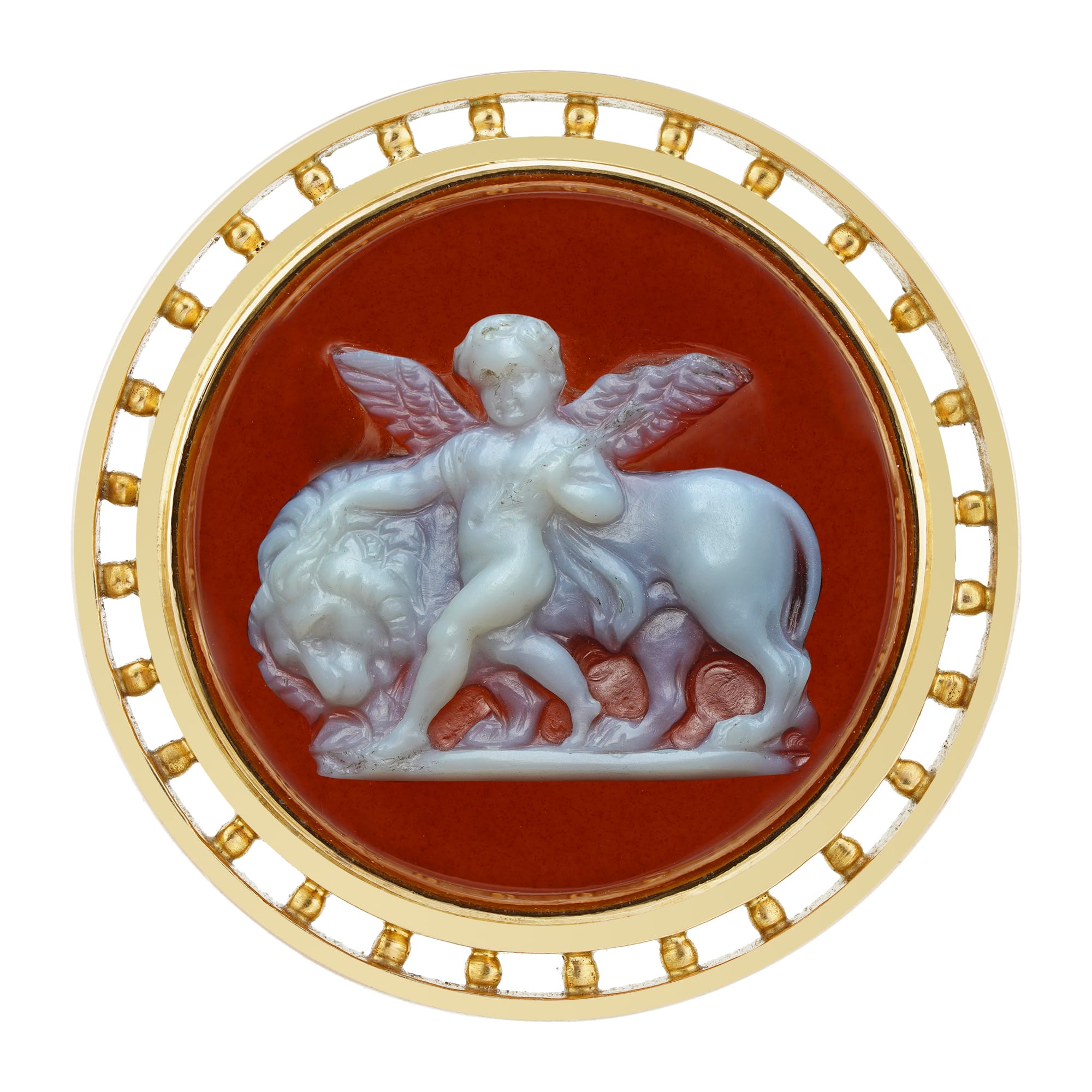 A very fine example of a neoclassical cameo brooch. This brooch features a carved hardstone depicting eros and a lion, a popular theme in Hellenistic art that was revived in the nineteenth century. The cameo is finely carved and set in a frame of warm yellow gold with a beaded border which adds to the charming neoclassical design. This piece would look lovely pinned to a jacket lapel or a silk scarf.