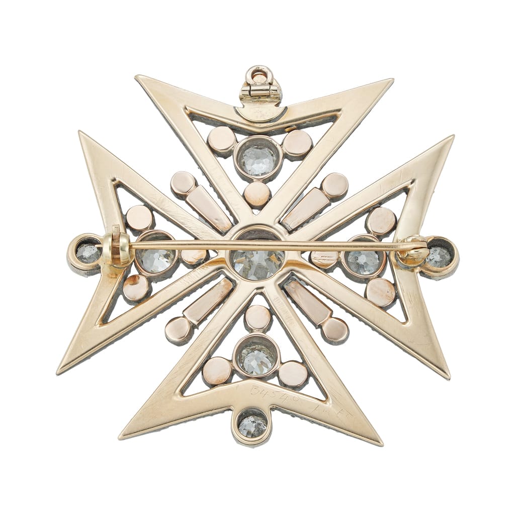 More informationA Regency diamond Maltese cross pendant/brooch, to the centre a cushion-shaped diamond estimated to weigh 1.4 carats, the openwork arms set throughout with a hundred and fifty-two old mine-cut diamonds estimated to weigh a further total of 9.1 carats, all to silver cut-down settings with yellow gold back, with later drop-down pendant loop and brooch pin with roller catch fitting, circa 1820, measuring approximately 4.6 x 4.6cm, gross weight 22.5 grams.