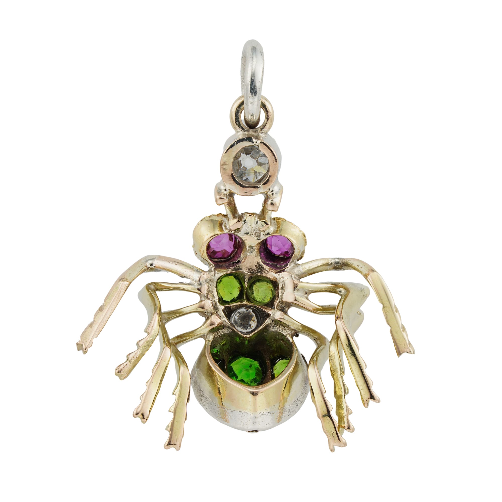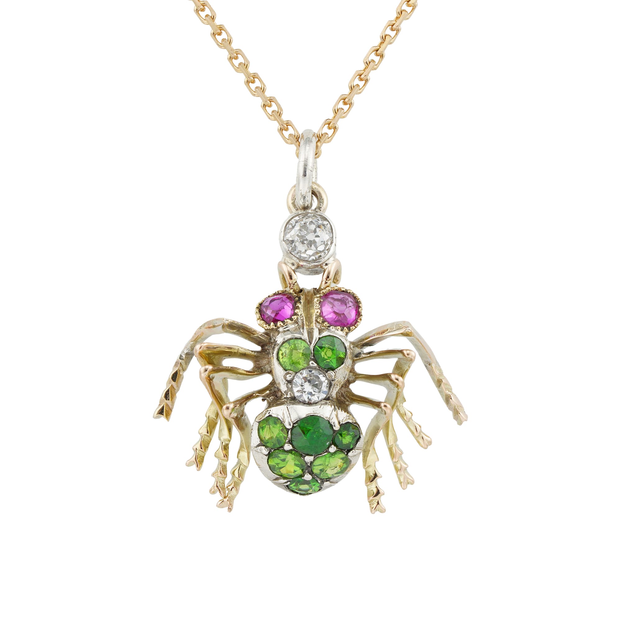 A turn of 20th century spider pendant, the body set with small demantoid garnets and a small old-cut diamond, with eyes set with cushion shaped faceted rubies, all set in silver and yellow gold mount, with a single old-cut diamond-set ...