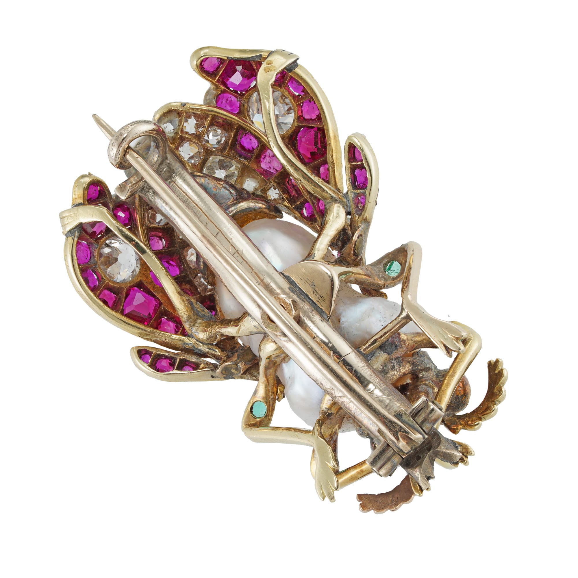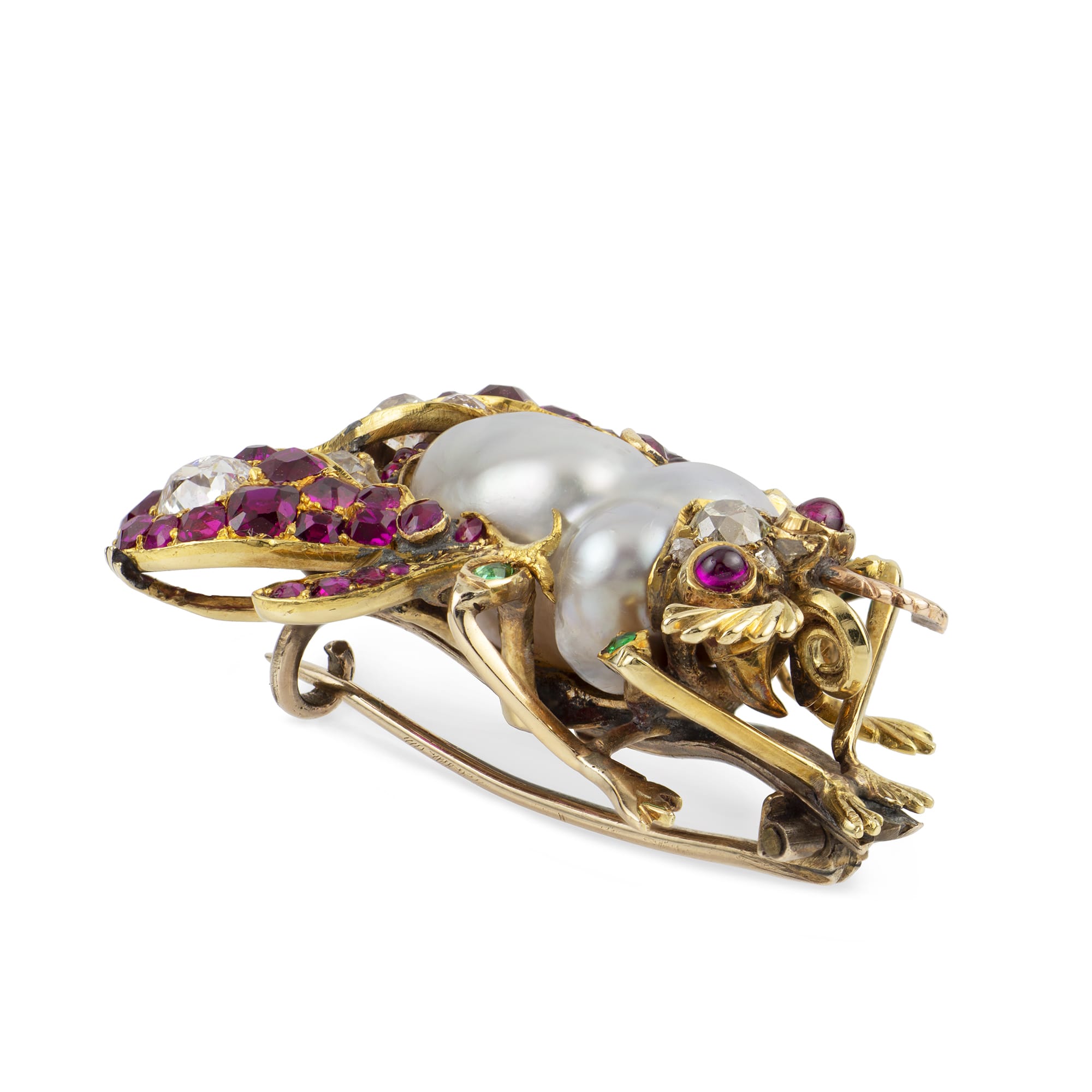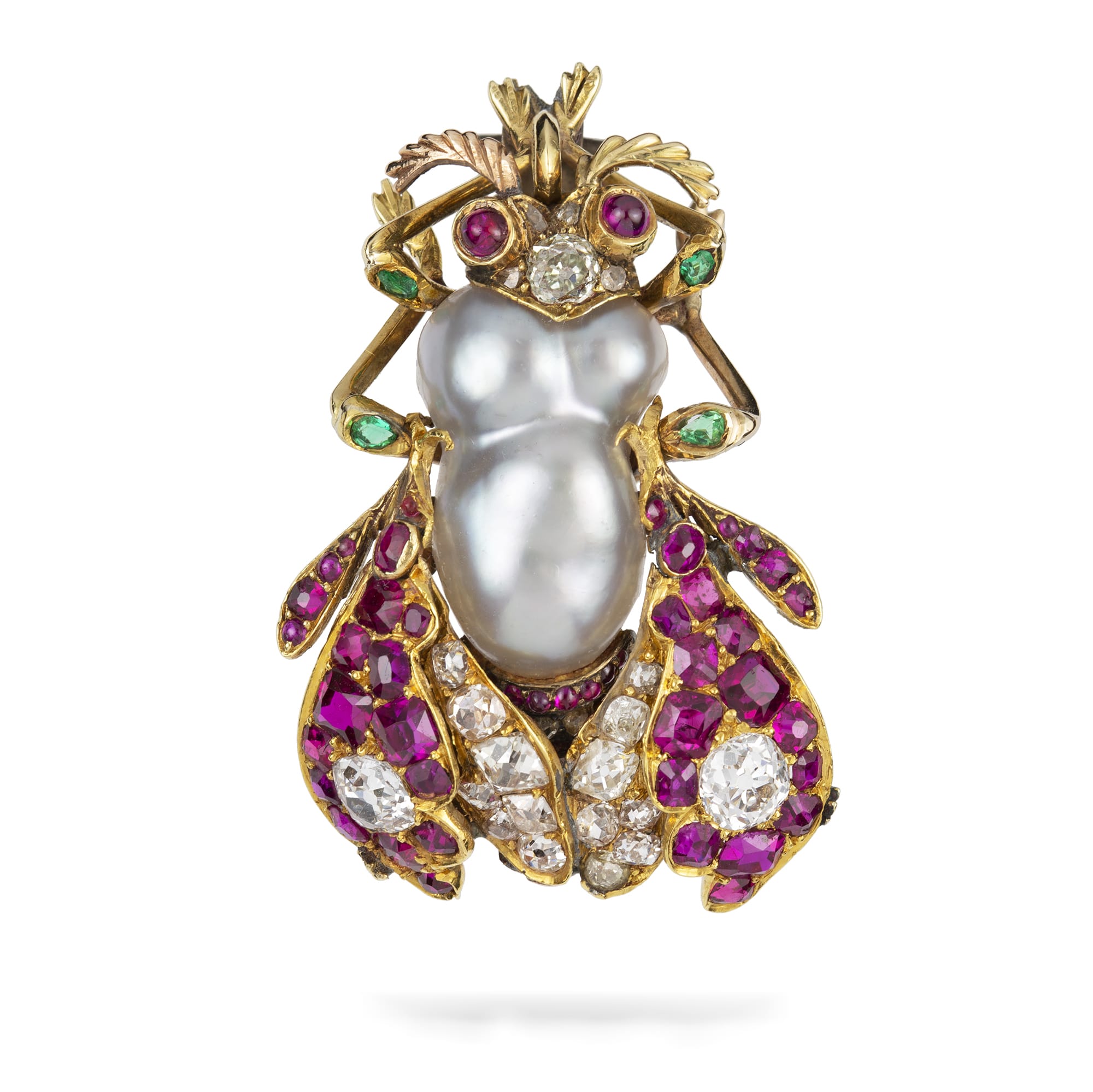 A Victorian natural pearl ruby and diamond bug brooch, the body with a baroque pearl, the legs embellished with emeralds and the wings with faceted rubies and old-cut diamonds, the head with old-cut diamonds and cabochon-cut ruby eyes, the diamonds ...