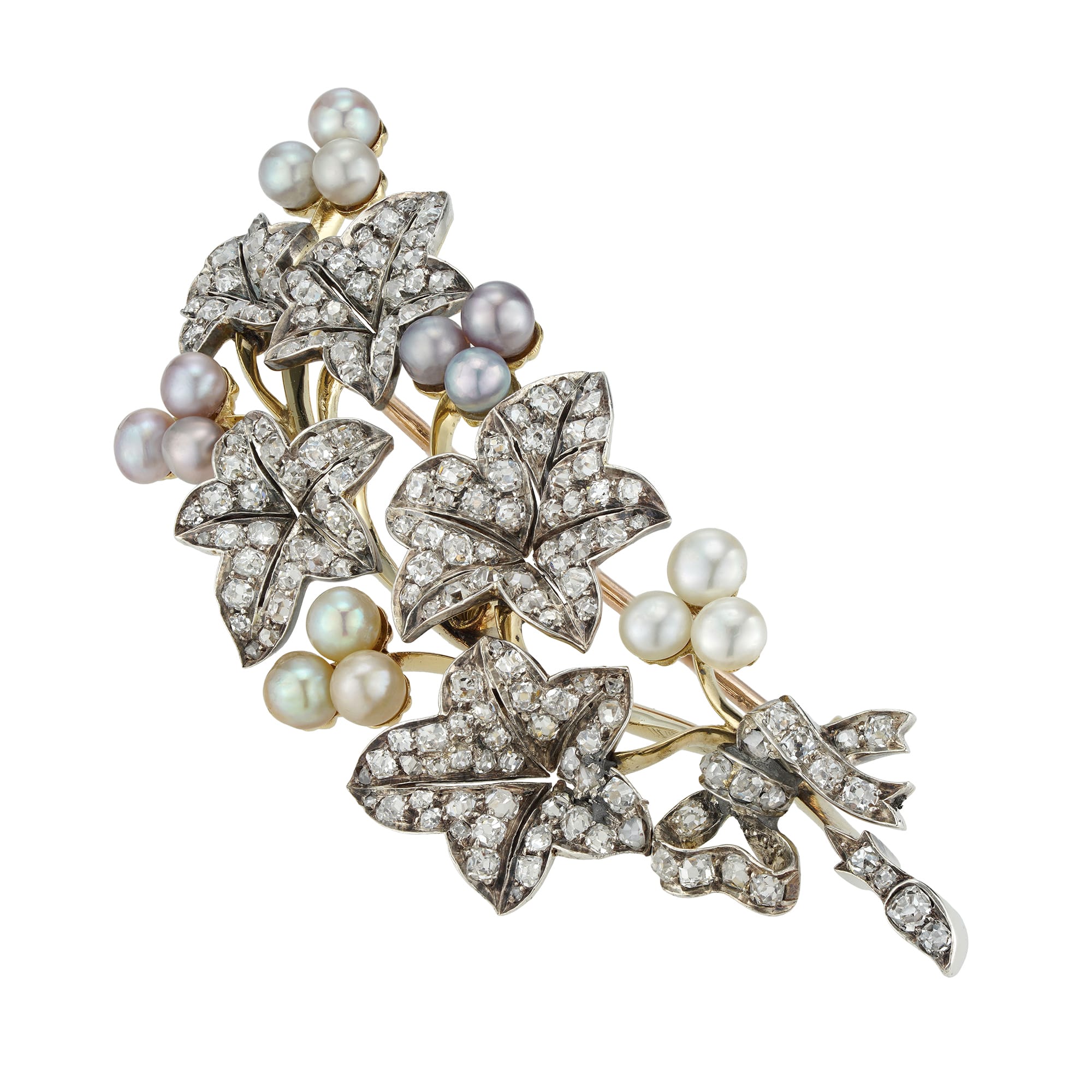 A Victorian natural pearl and diamond ivy spray brooch, consisting of five leaves encrusted with small old-mine cut diamonds and flanked with five natural peal-set clovers, each clover set with a different colour pearls, accompanied by GCS report stating that ...