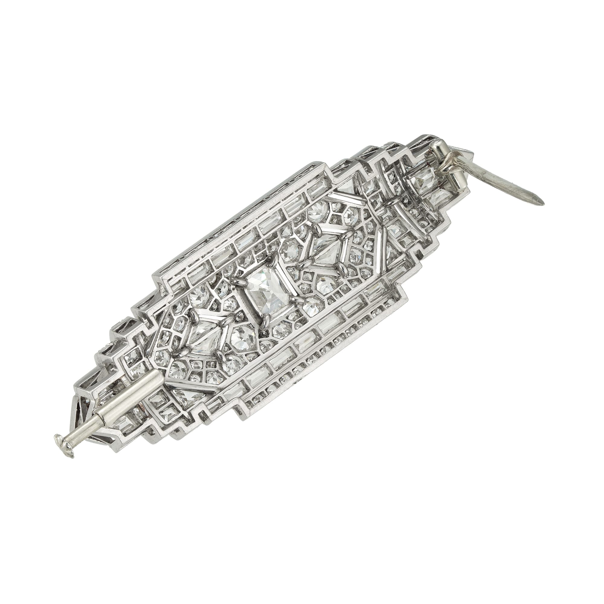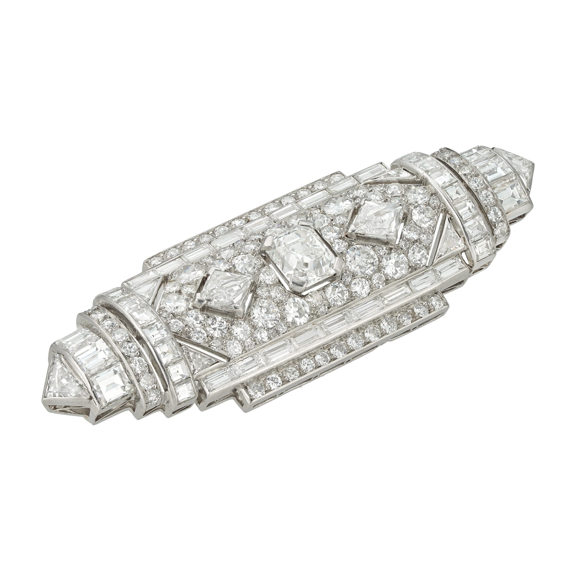 More informationAn Art Deco diamond brooch by Leon Hatot, the semi-cylindrical shaped brooch set to the centre with an octagonal-cut diamond estimated to weigh 1 .2 carats with two sets of trillion-cut diamonds on either side, all to a pave-set panel with four trillion-cut diamonds one set on each corner, on the two sides with two rows of diamonds, the one set with baguette-cut diamonds and the other set with old-cut diamonds the other two sides and bullet-shaped finials set with carré, old European, emerald and trillion-cut diamonds, the small diamonds estimated to weigh a further total of 6 carats, all set to a platinum openwork mount with hand-pierced gallery and white gold brooch fittings, bearing French platinum and gold marks and makers marks for Leon Hatot, circa 1930, measuring 5.7 x 1.9cm gross weight 14.1 grams.
