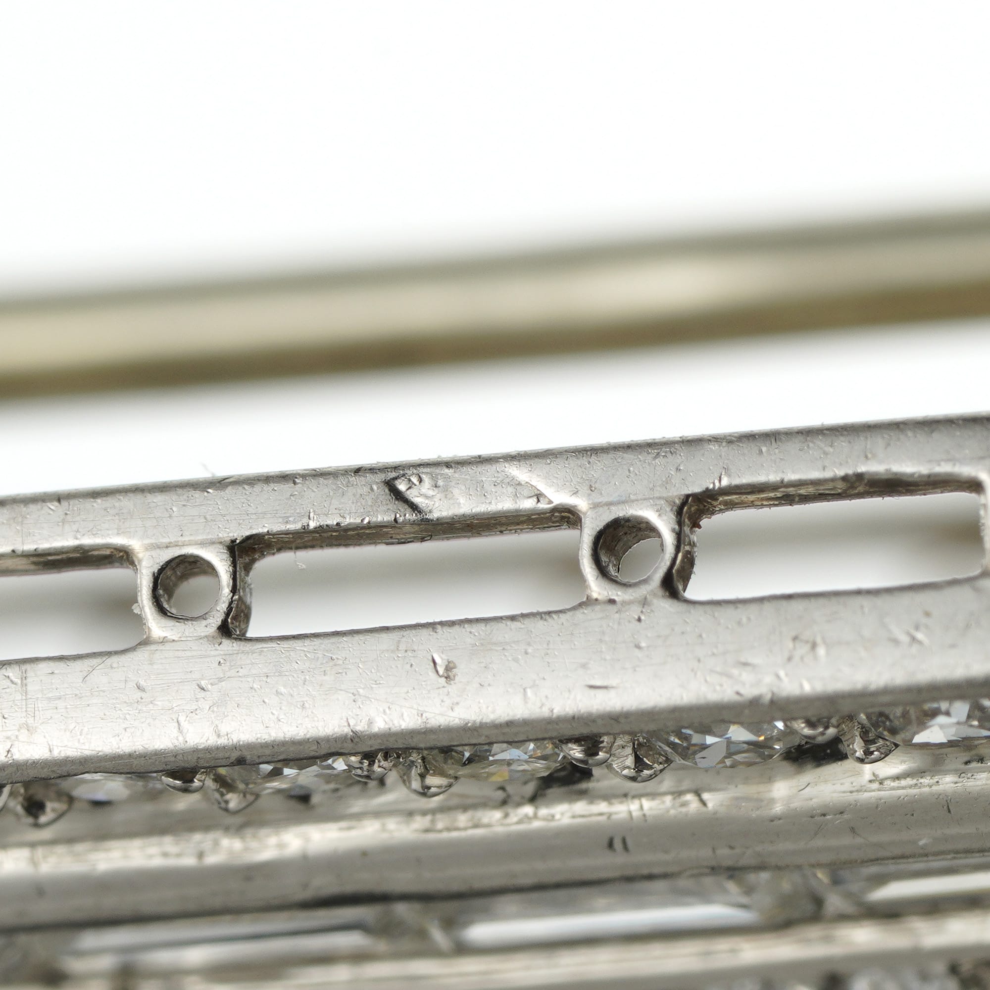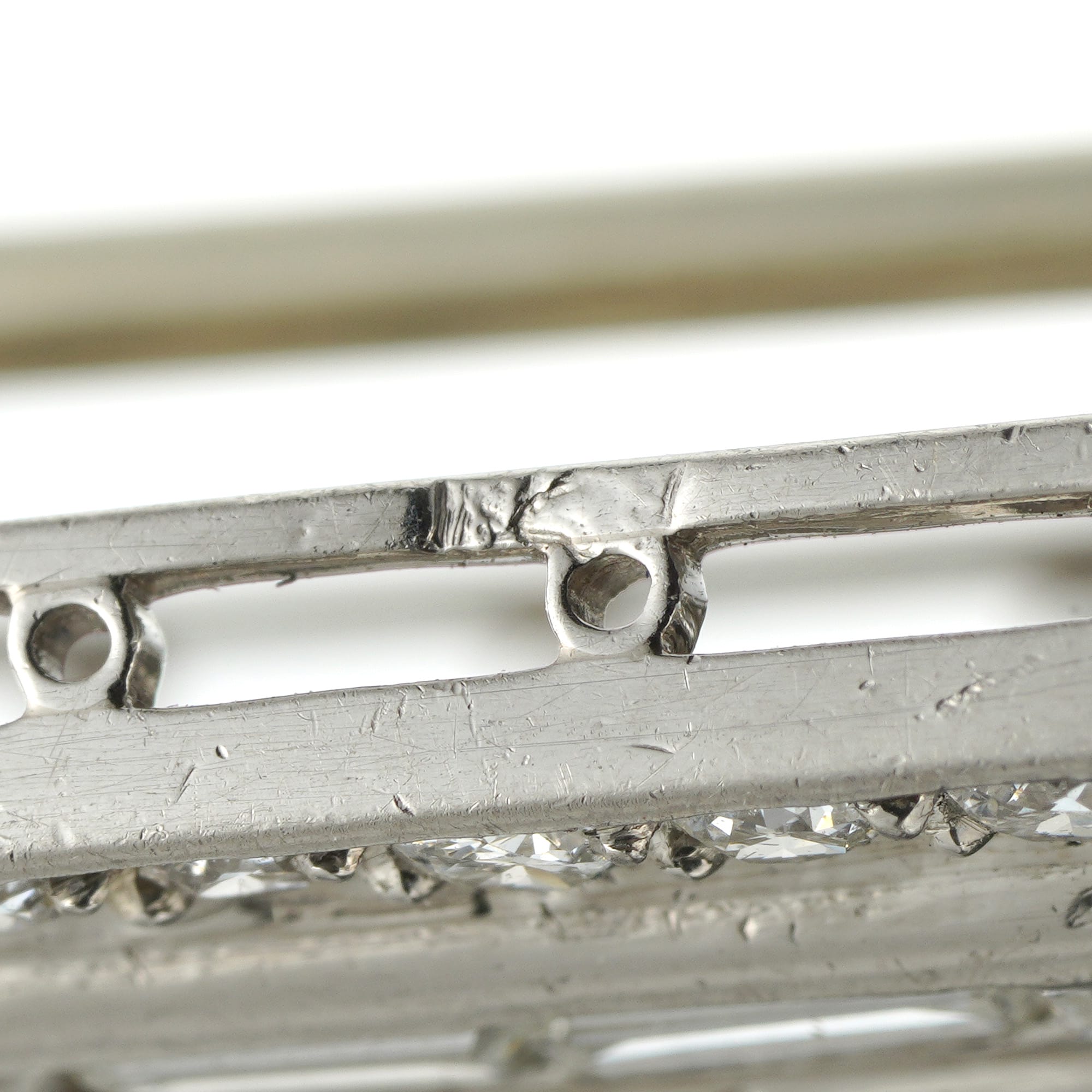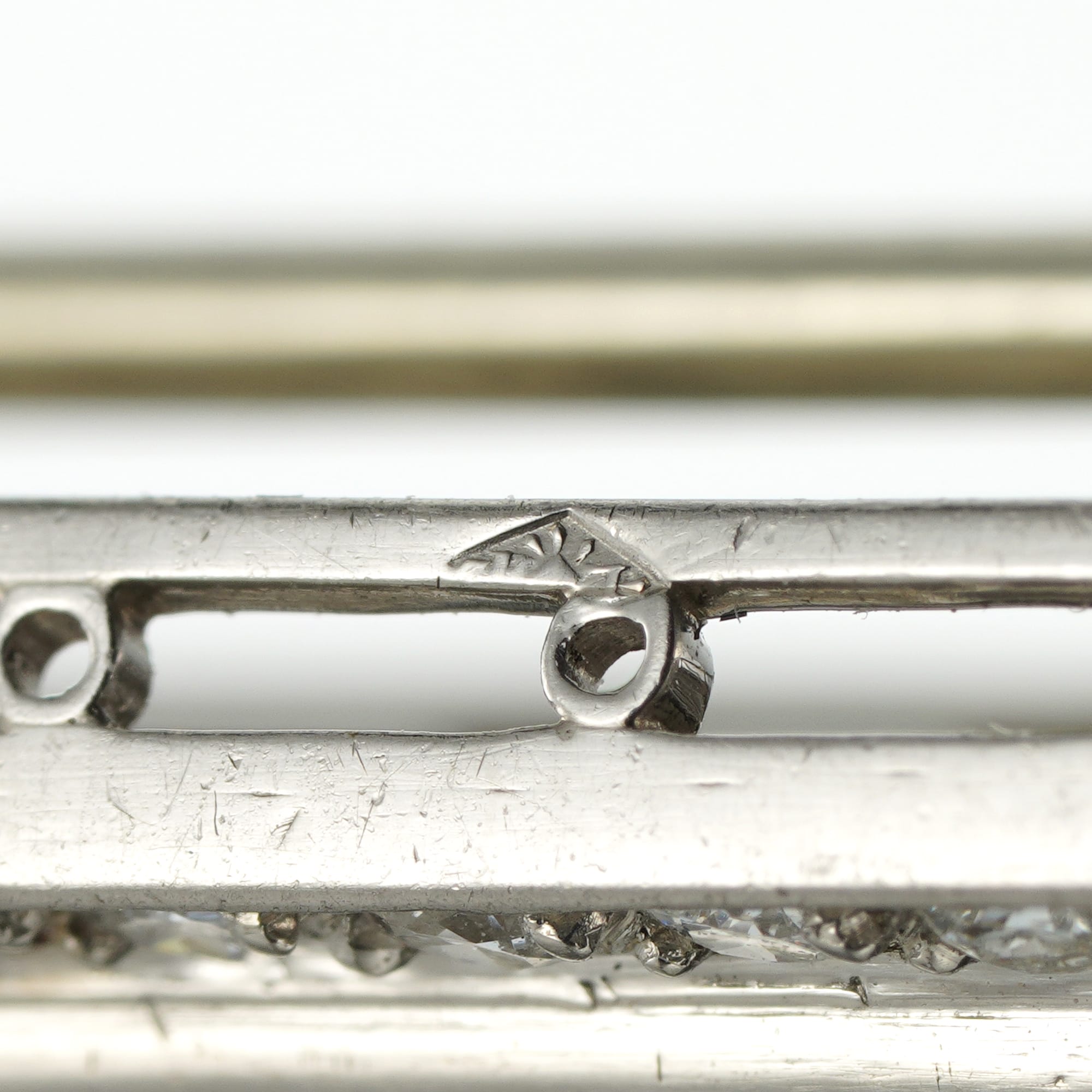A glamorous Art Deco diamond brooch by Leon Hatot. This piece dazzles with its geometric design and sparkling diamonds. At its centre is a dazzling octagonal-cut diamond, flanked by two sets of trillion-cut diamonds. Surrounding them are rows of diamonds, all meticulously arranged for maximum brilliance. Adding to its charm are intricate a mix cut diamonds. Crafted with meticulous attention, the platinum mount features a delicate hand-pierced gallery work, enhancing the diamonds’ brilliance. Made by the incredible Leon Hatot, this brooch exudes elegance and sophistication in every detail.
