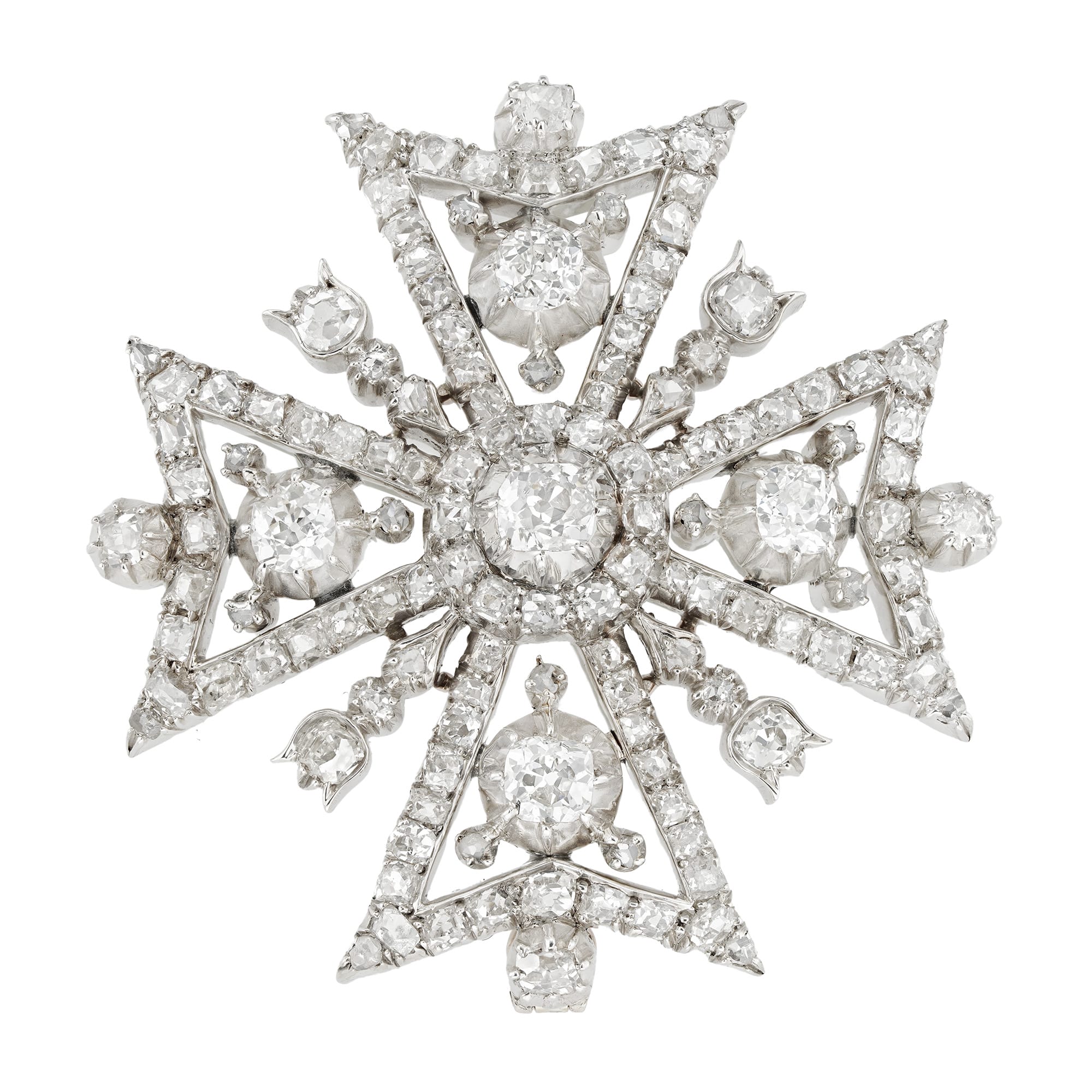 An exquisite early Victorian diamond-set Maltese cross. At the heart of the majestic cross lies an exquisite old mine-cut diamond. The arms of the cross are encrusted in small shiny old mine and rose-cut diamonds, each adding to the splendour of the piece. Set in silver and mounted in gold, this creation exudes opulence and refinement. Furthermore, the cross features a detachable brooch fitting and a foldable pendant loop, allowing it to be worn in various elegant arrangements. Dating back to circa 1840, this piece stands as a symbol of unparalleled elegance and sophistication.