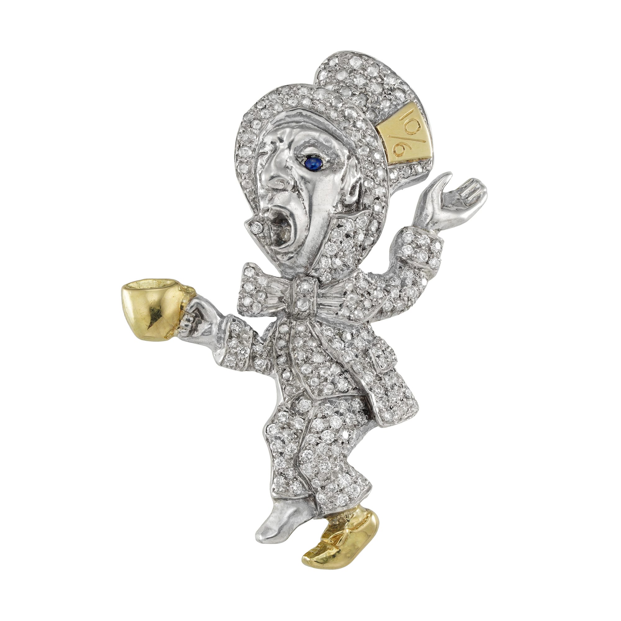 The diamond-set Mad Hatter brooch, the upright white Mad Hatter holding a yellow gold cup of tea in his right hand, and wearing a top hat with a yellow gold price ticket “10/6” (10 shillings and 6 pence), the left ...