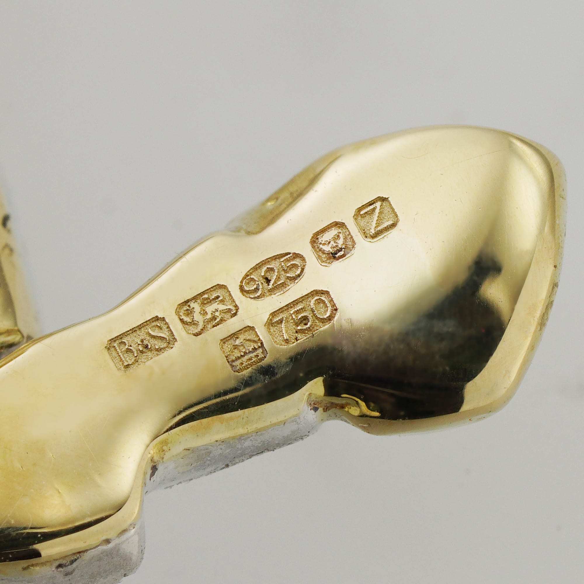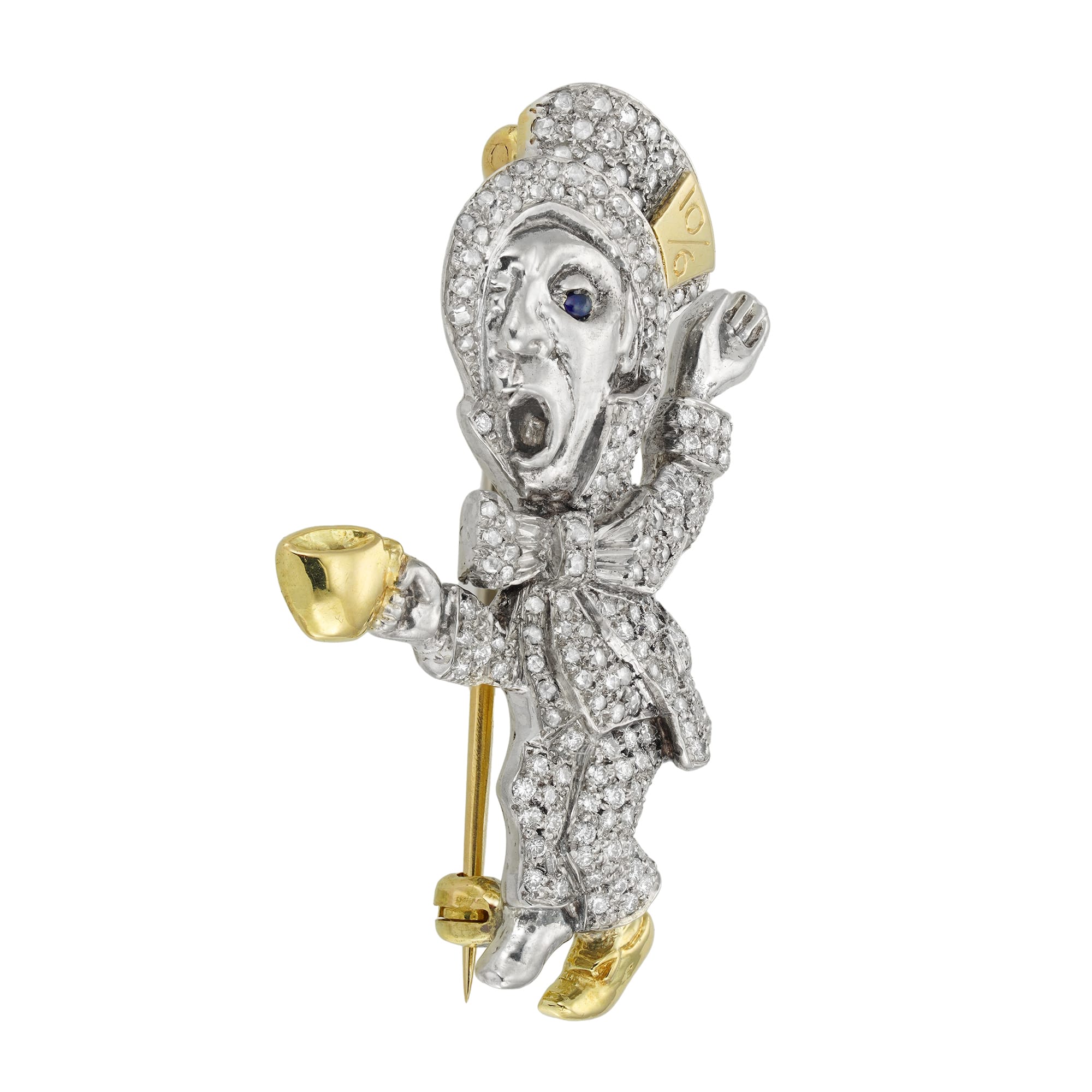 More informationThe diamond-set Mad Hatter brooch, the upright white Mad Hatter holding a yellow gold cup of tea in his right hand, and wearing a top hat with a yellow gold price ticket “10/6” (10 shillings and 6 pence), the left foot in a yellow gold boot, set throughout with a mixture of fifty-three rose- and sixty-eight brilliant-cut diamonds, weighing 1.4 carats in total, with a blue cabochon-cut sapphire eye, all set in silver to a yellow gold back with a brooch pin and a safety clasp fitting, hallmarked sterling silver & 18ct gold, London 2024, bearing the Bentley & Skinner sponsor mark and the Platinum Jubilee mark, measuring approximately 3.9x3cm, gross weight 10.4 grams.