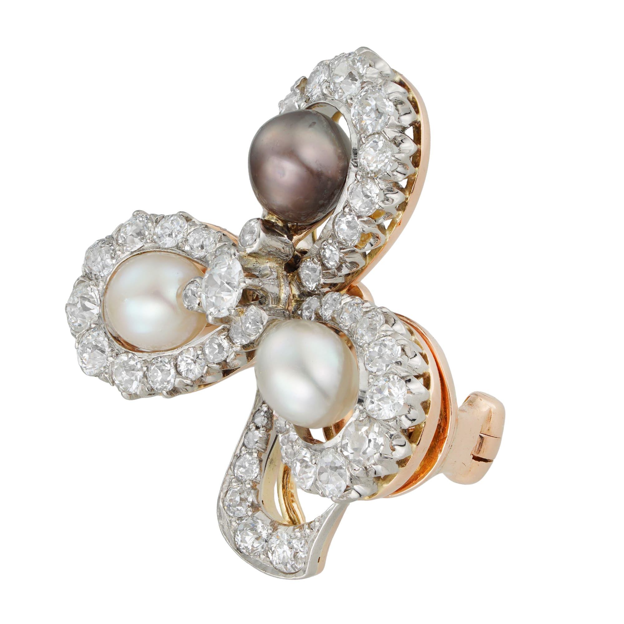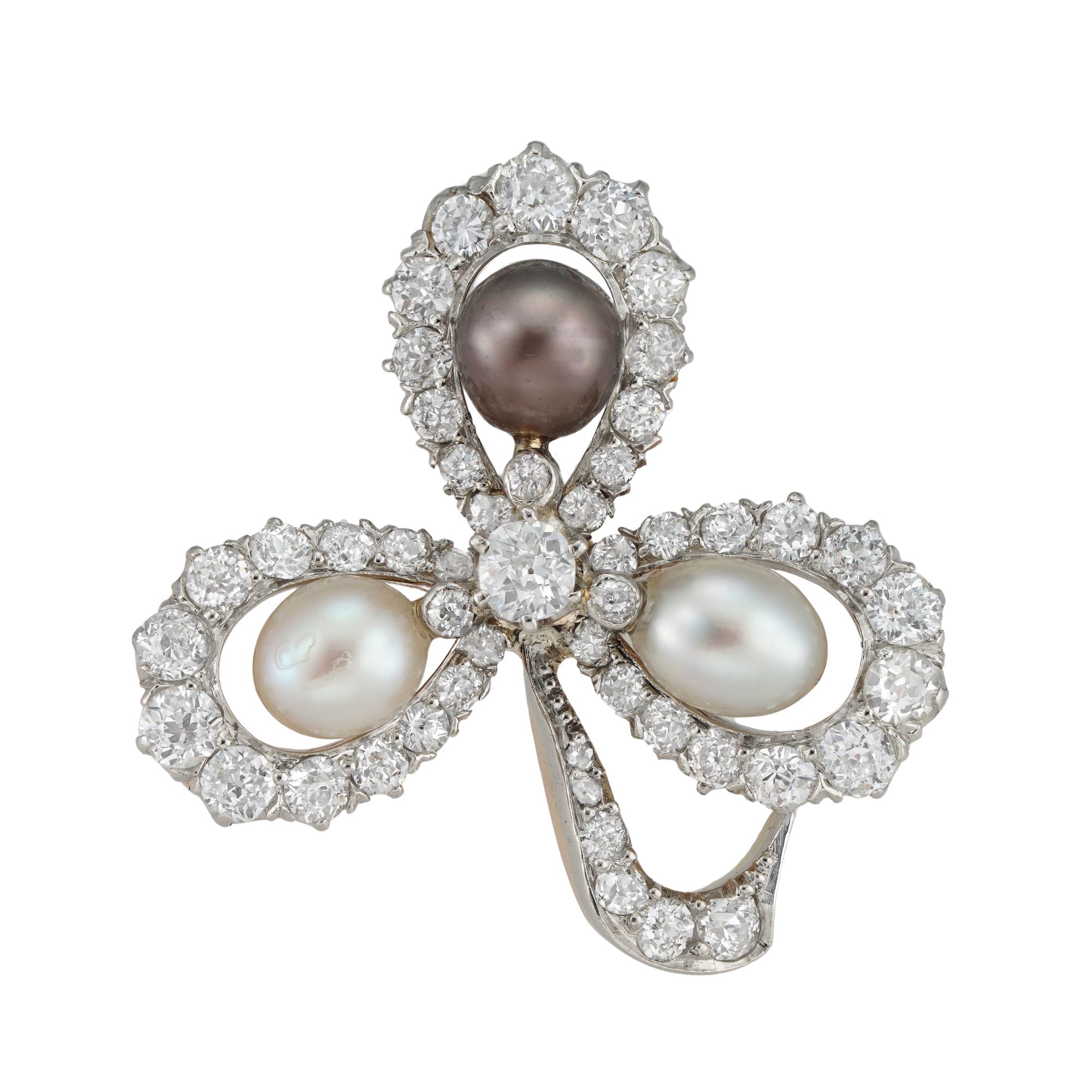 An early 20th century pearl and diamond clover brooch, to the centre an old-cut diamond estimated to weigh 0.1 carats, the three pearls, one grey and two white/cream colour, accompanied by Gem and Pearl laboratory report stating to be natural, ...