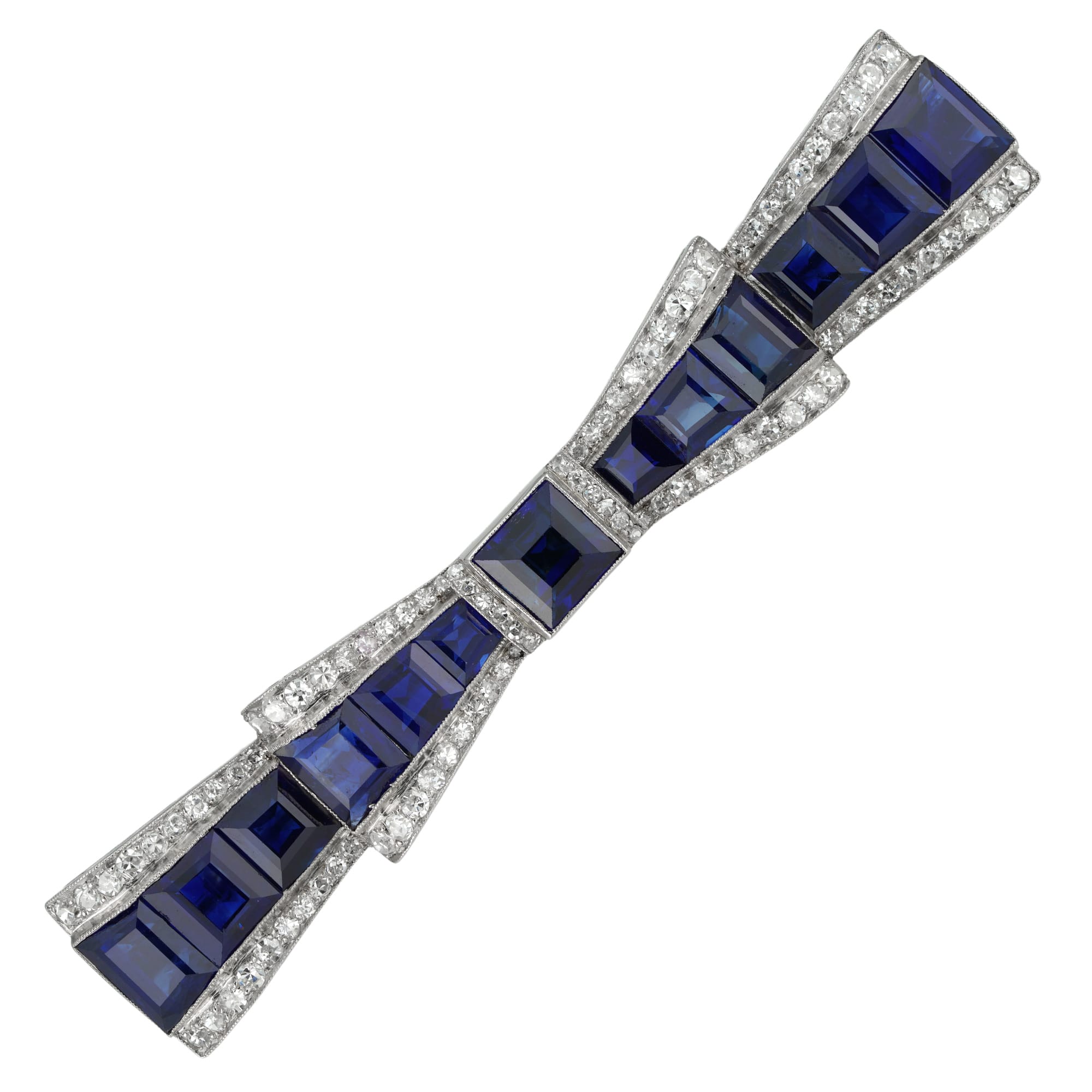 A mid-20th century sapphire and diamond bow brooch, to the centre a step-cut sapphire estimated to weigh 1¼ carats set between two lines of Swiss-cut diamonds, on each side six trapeze-cut sapphires, the total weight of sapphires estimated to be ...