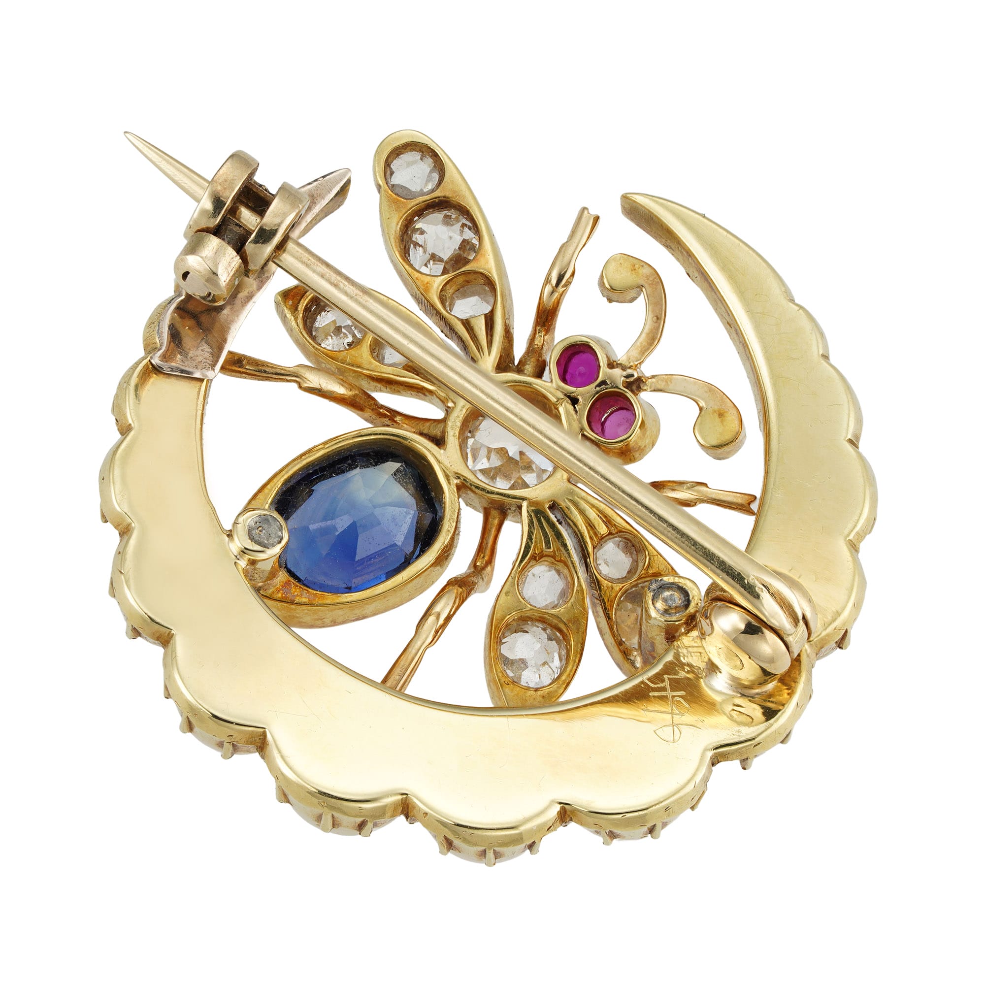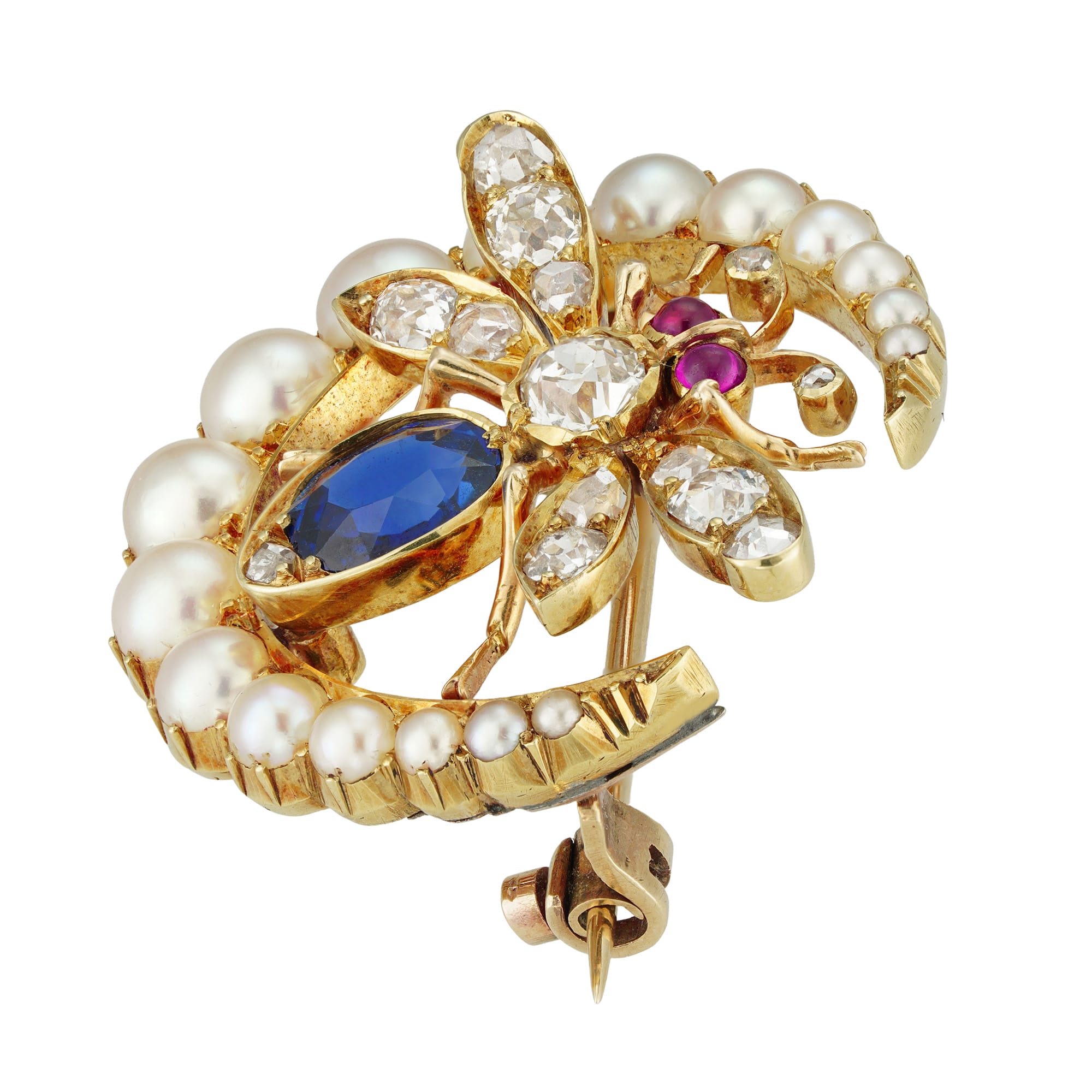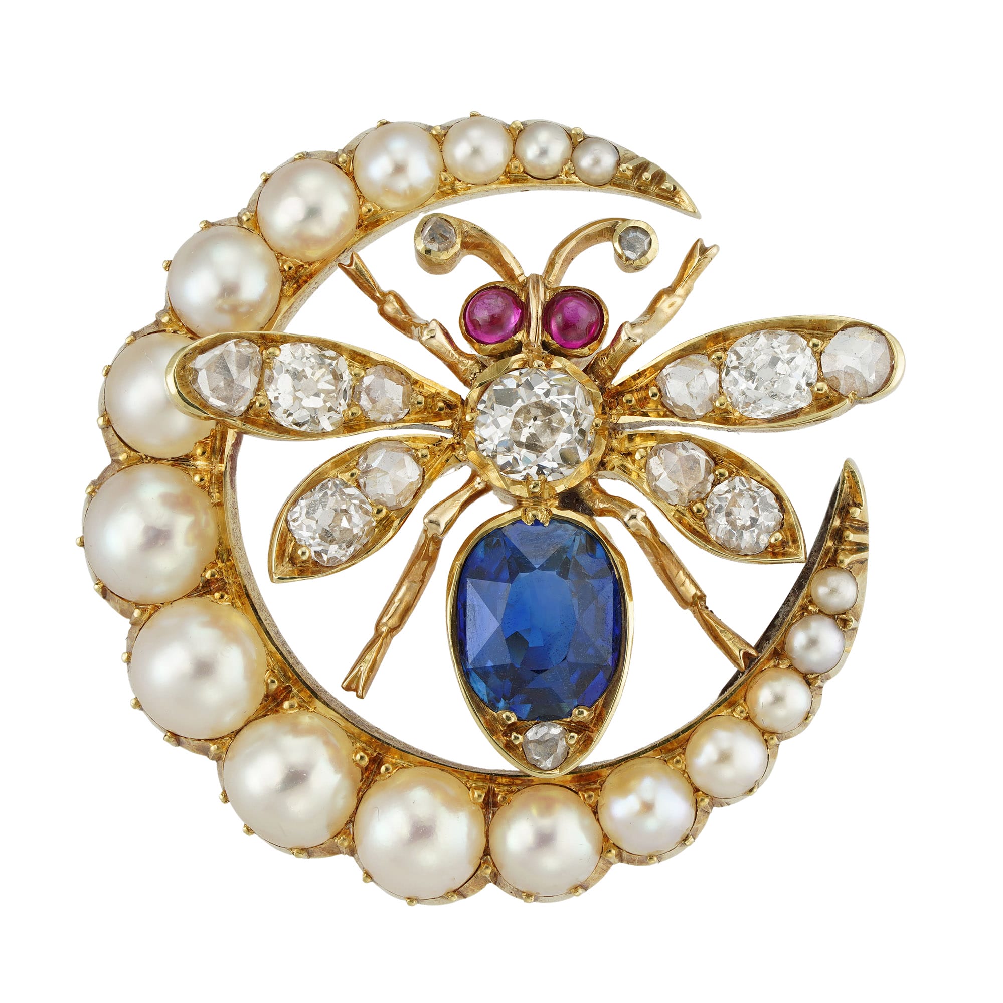 A charming Victorian sapphire, diamond, pearl, and ruby-set bee brooch. The brooch showcases a charming bee, meticulously adorned with an oval-shaped faceted sapphire on its abdomen, while its thorax and wings gleam with old mine and rose-cut diamonds. Its eyes, set with round rubies, add a touch of vibrancy. Resting within a crescent moon, the bee is surrounded by seventeen half-pearls of graduating sizes, all set in luminous yellow gold. This exquisite piece, dating back to circa 1895, comes accompanied by its original fitted case from C.J. Hill, completing its aura of elegance and historical charm.