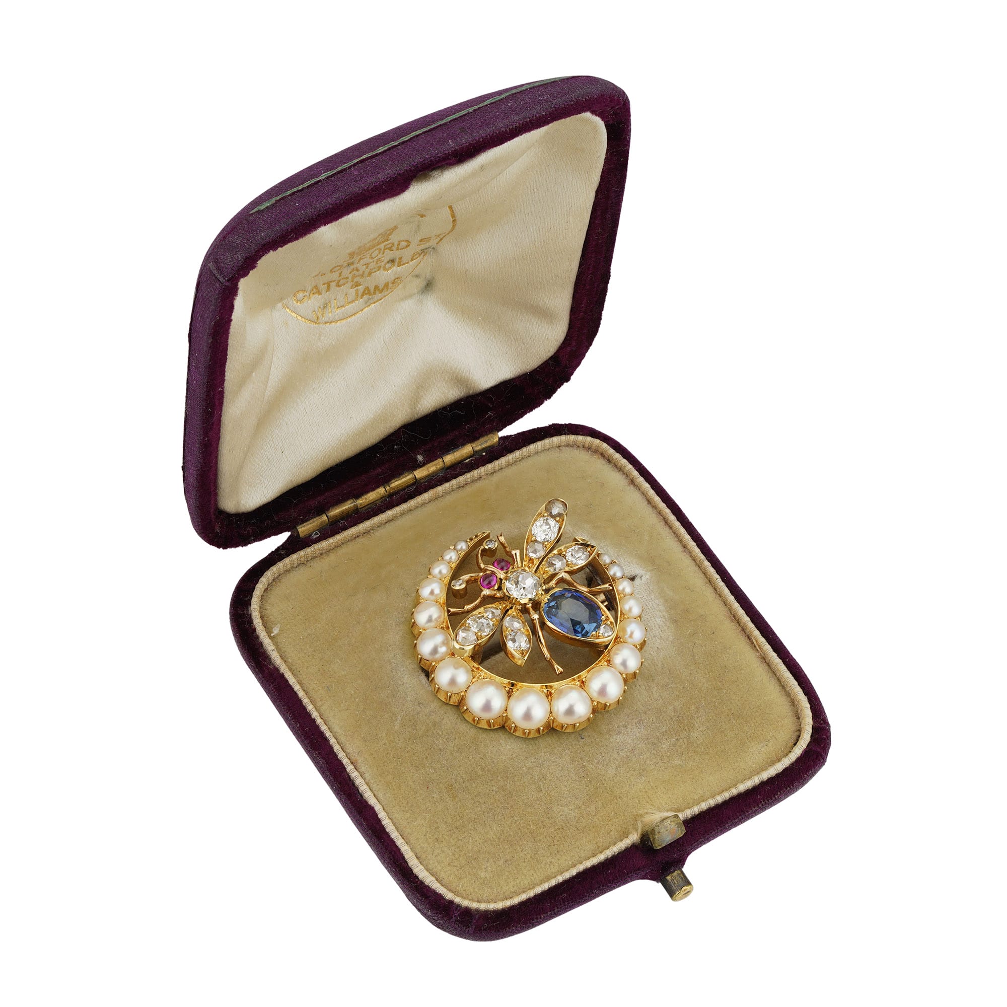 More informationA Victorian sapphire, diamond, pearl, and ruby-set bee brooch, the abdomen set with an oval-shaped faceted sapphire estimated to weigh ¾ carat, the thorax and wings set with old mine and rose-cut diamonds, with round cabochon-cut ruby-set eyes, resting within a crescent moon embellished with seventeen graduating in size half-pearls, all mounted in yellow gold, with gold brooch fitting, accompanied by original fitted case of C.J. Hill, circa 1895, measuring 2.5cm in diameter, gross weight 8.4 grams.