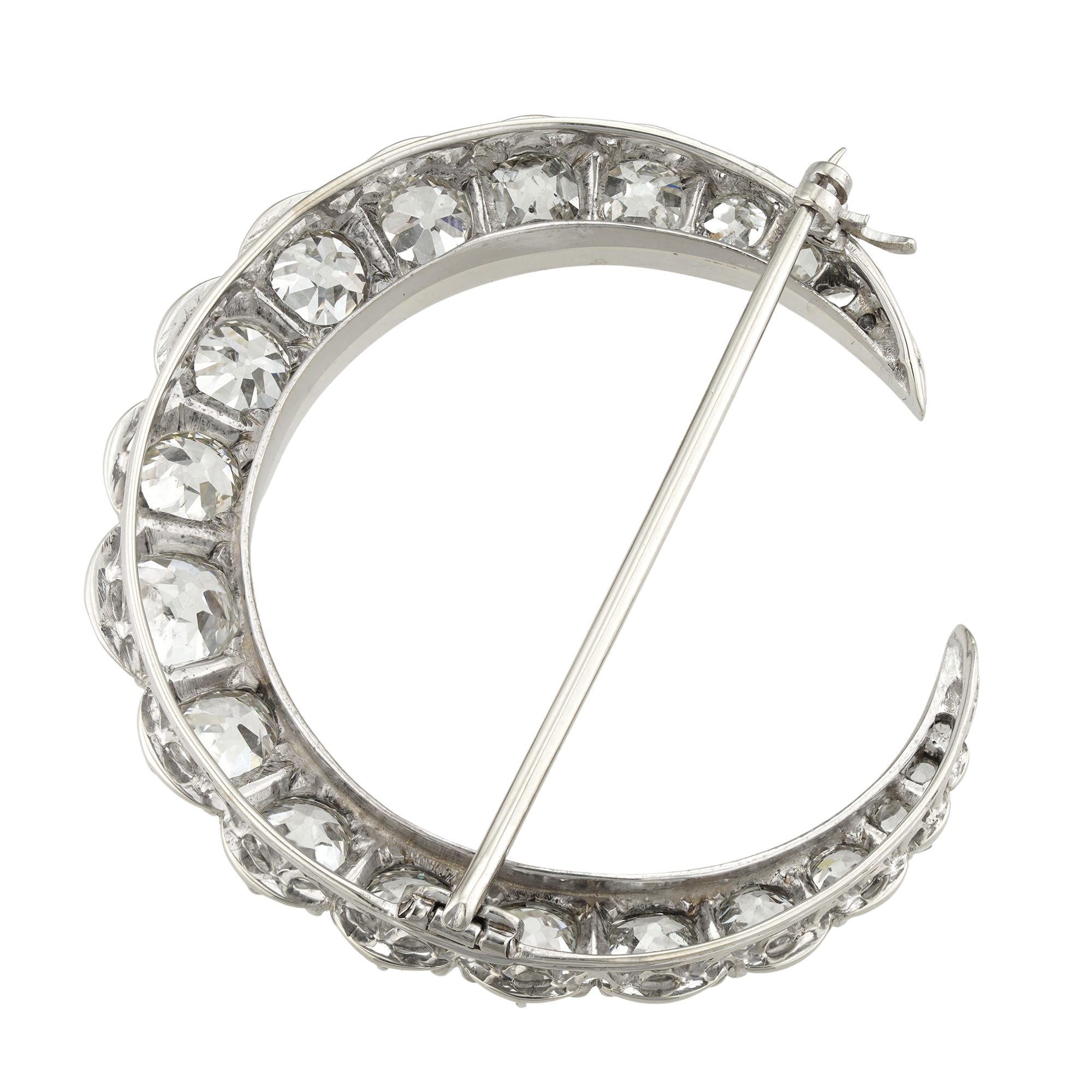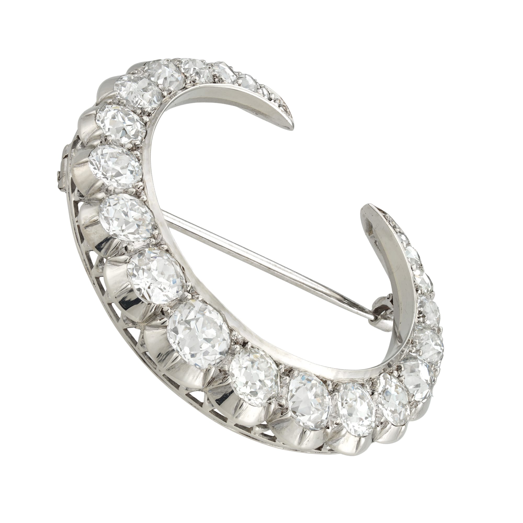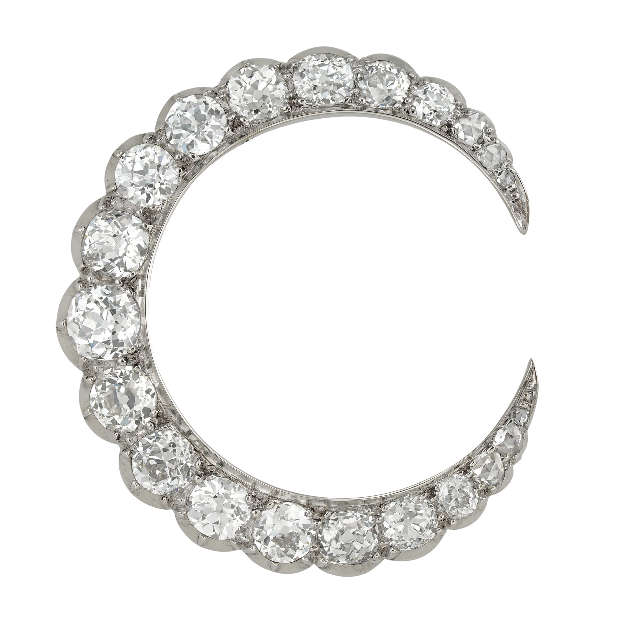 A 20th century diamond crescent brooch, the fifteen old-cut diamonds graduating in size from the centre set with three small rose-cut diamonds on each side, the diamonds estimated to weigh 8 carats in total, all cut-down set in white gold ...