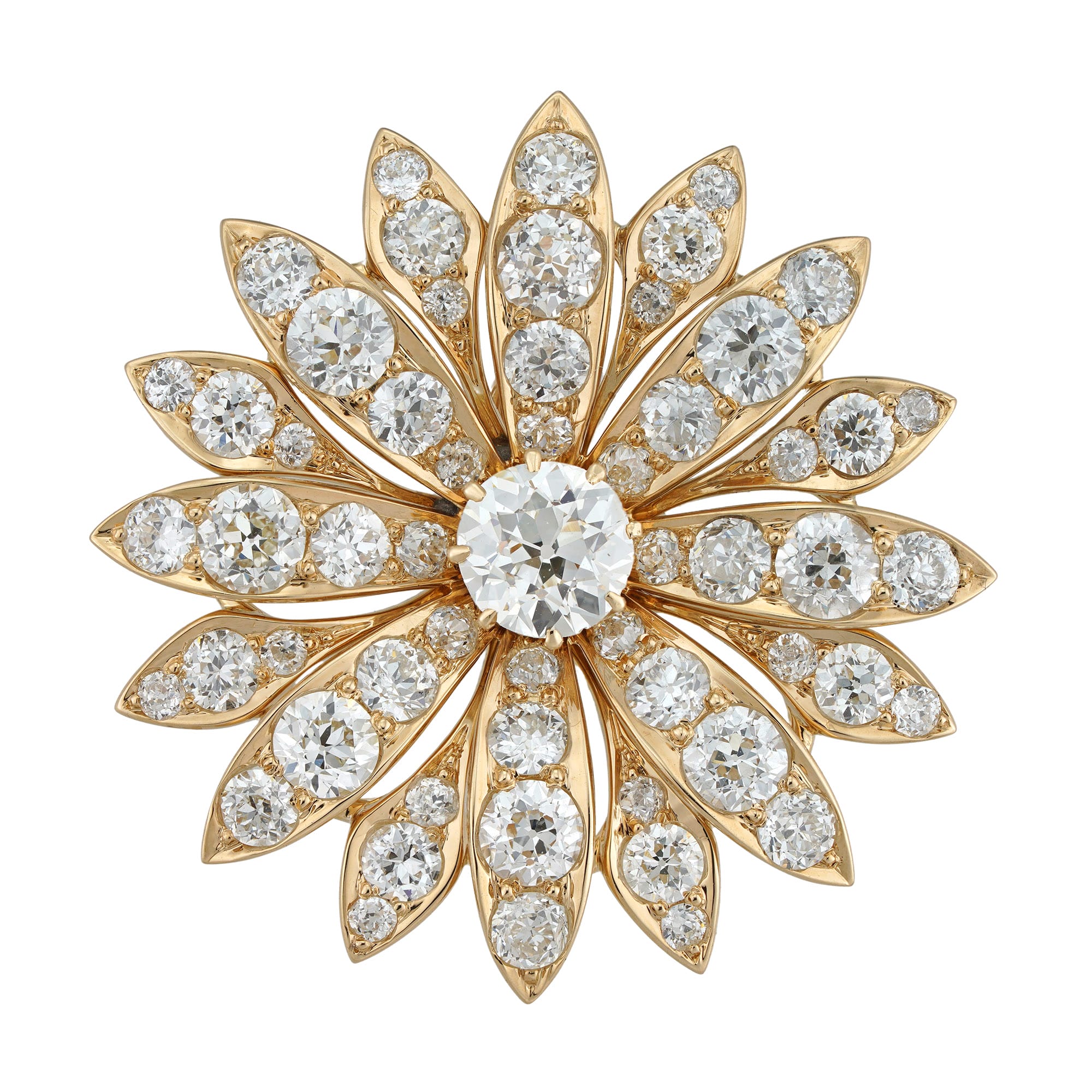 An early 20th century diamond flower brooch-pendant, to the centre an old brilliant-cut diamond weighing 1.14 carats and assessed to be of J colour and VS2-SI1 clarity, claw-set and surrounded by sixteen petals set with smaller old-cut diamonds estimated to ...