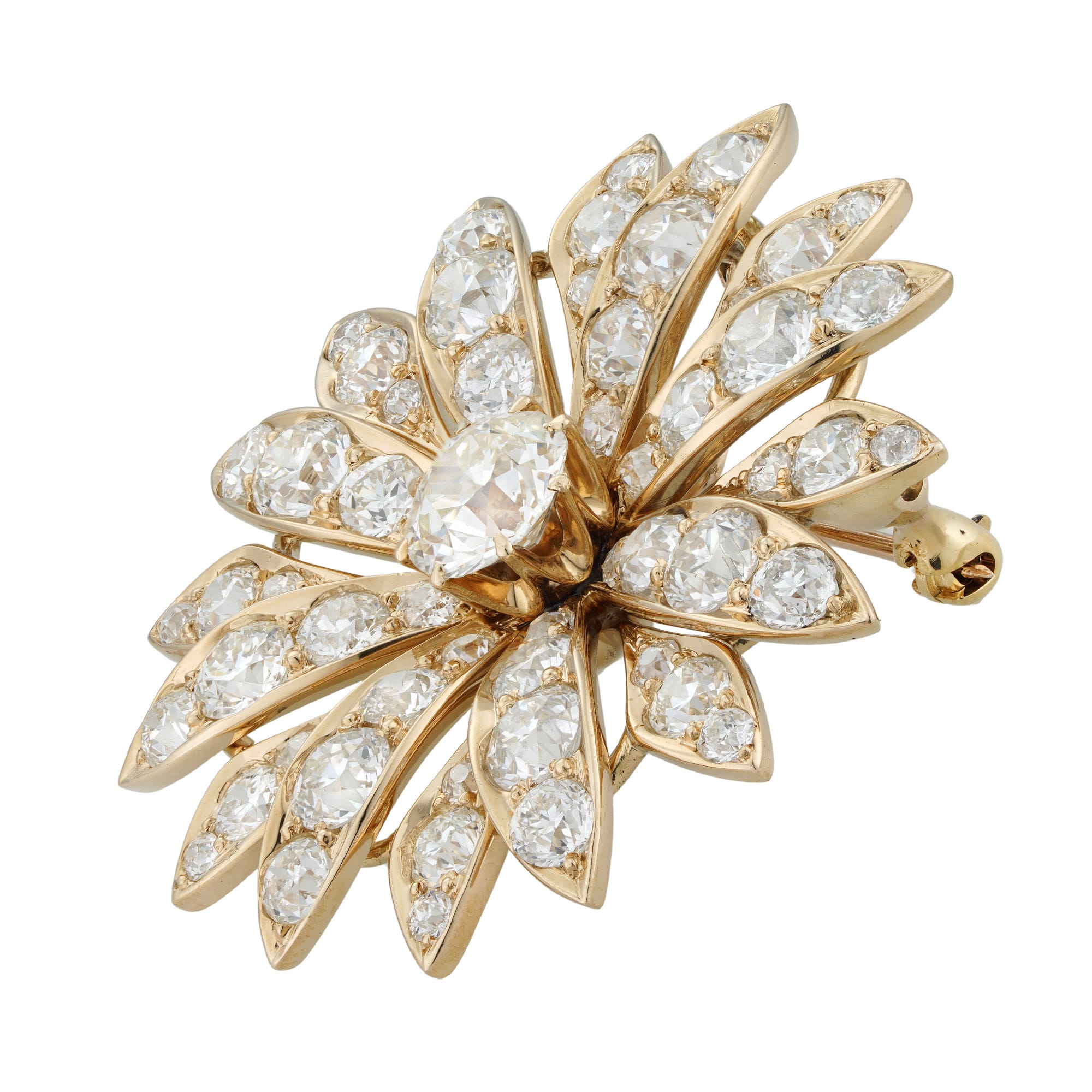 More informationAn early 20th century diamond flower brooch-pendant, to the centre an old brilliant-cut diamond weighing 1.14 carats and assessed to be of J colour and VS2-SI1 clarity, claw-set and surrounded by sixteen petals set with smaller old-cut diamonds estimated to weigh a further combined total of 5½ carats, all set in gold mount with foldable pendant loop and gold brooch fitting, circa 1930, measuring 4.5cm in diameter, gross weight 11.9 grams.