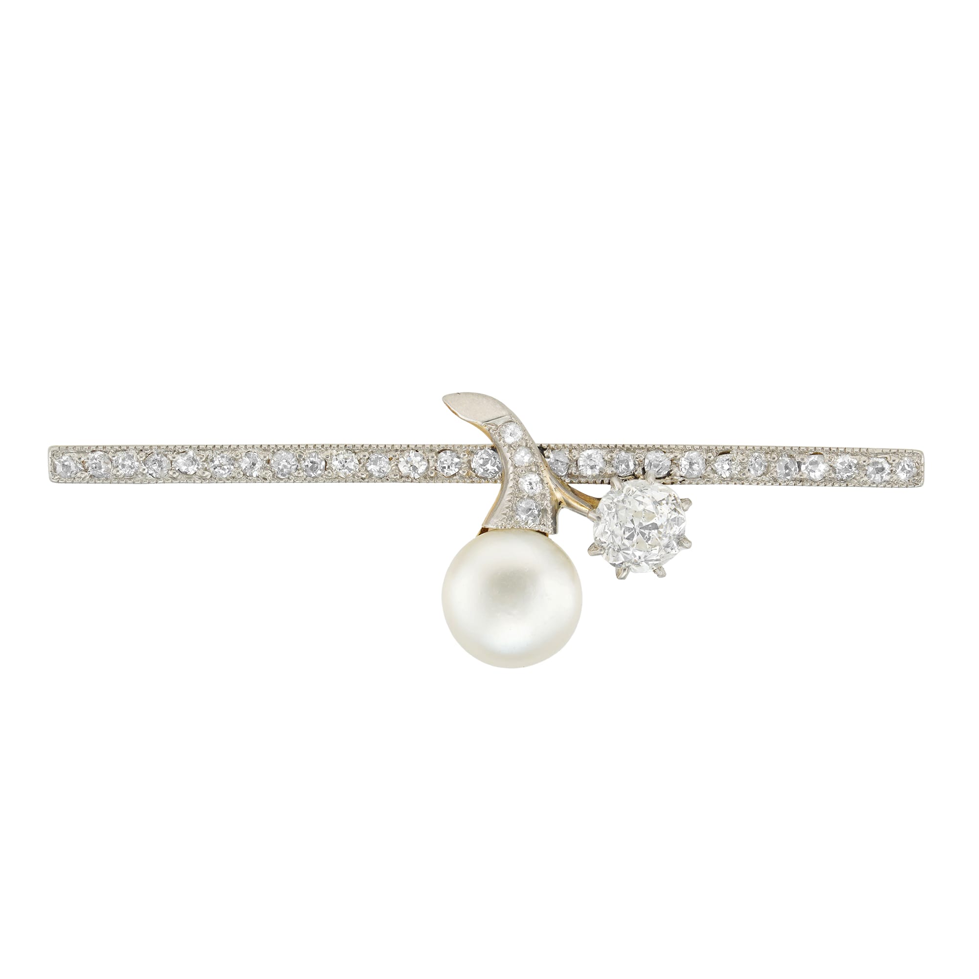 An Edwardian pearl and diamond berry brooch, the button-shaped pearl measuring approximately 6.7 mm in diameter, accompanied by GCS report stating to be natural of saltwater origin, the old European-cut diamond weighing 0.42 carats, assessed to be of G colour ...