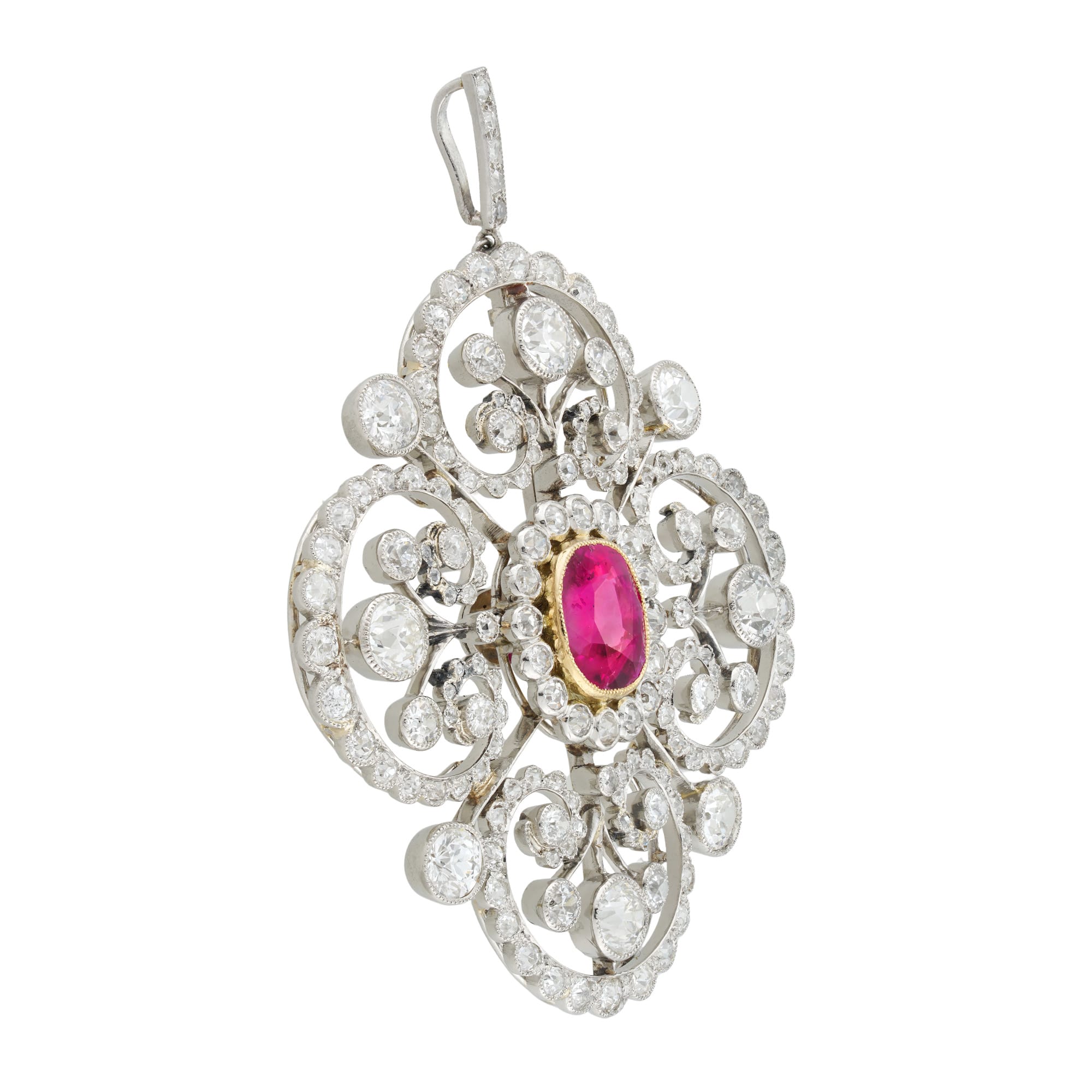 More informationAn Edwardian ruby and diamond brooch/pendant, the cushion-shaped faceted ruby estimated to weigh 2.8 carats, accompanied by GCS report stating to be of Burmese origin with no indication of heating, millegrain-set in yellow gold collet, surrounded by sixteen small old brilliant-cut diamonds, within a diamond-set openwork panel of scroll design, the eight principal old European-cut diamonds estimated to weigh 2.80 carats in total, the smaller diamonds estimated to weigh a further total of 2¼ carats, all millegrain-set in platinum mount, with detachable diamond-set loop and detachable gold brooch fitting, accompanied by a small screw driver, circa 1910, measuring approximately 4.5×4.2cm without the loop, gross weight 19.3 grams.