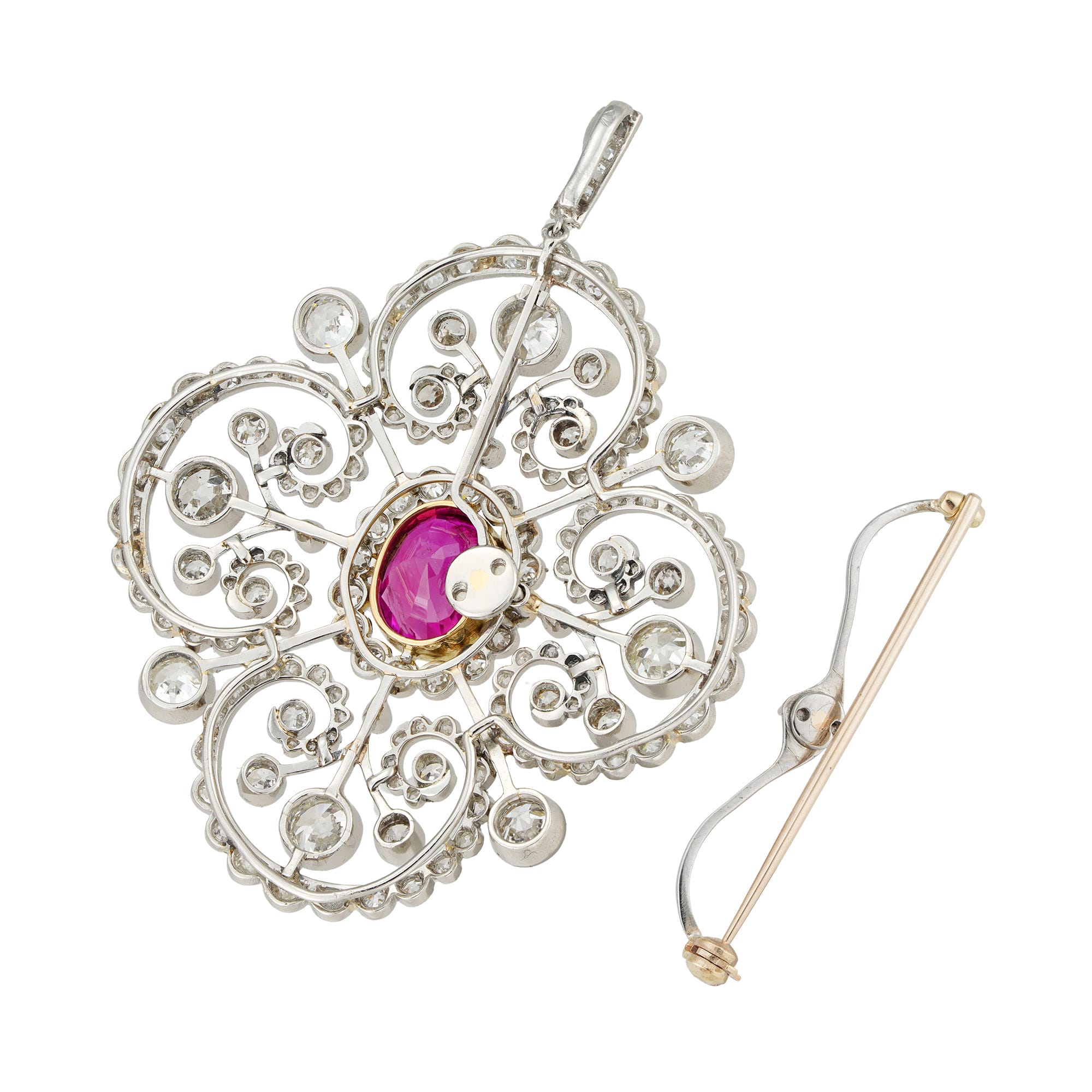 An extraordinary ruby and diamond convertible brooch-to-pendant, crafted during the Edwardian era. At its heart lies a mesmerizing Burmese ruby, surrounded by a delicate floral motif fashioned in platinum and adorned with radiant old-cut diamonds. The interplay of sparkling diamonds accentuates the ruby’s rich warmth and depth, creating a truly captivating effect. With its impeccable craftsmanship and timeless elegance, this convertible piece is a distinguished addition to any prestigious jewellery collection and is perfectly suited for the most elegant occasions.
